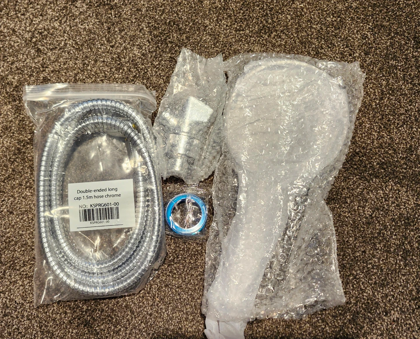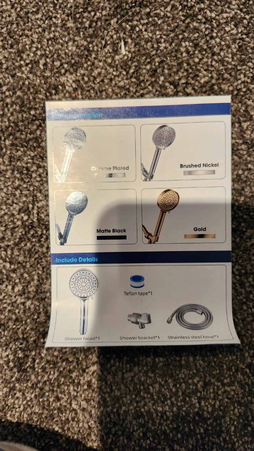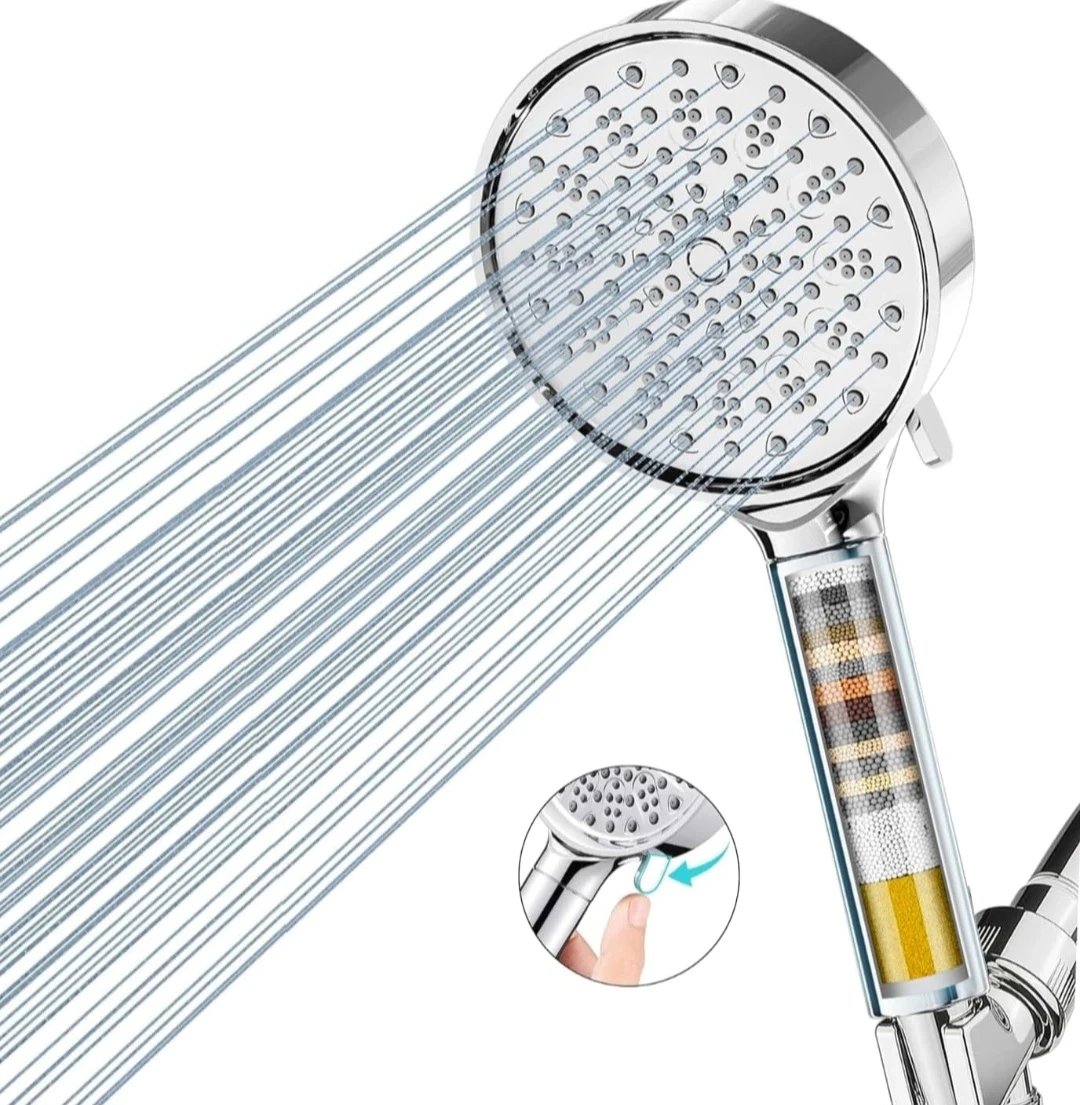 This Cobbe shower head features a chrome-plated finish and multiple spray settings. It includes a 1.5m stainless steel hose, shower bracket, and Teflon tape for easy installation. The handle contains filter layers for cleaner water.
