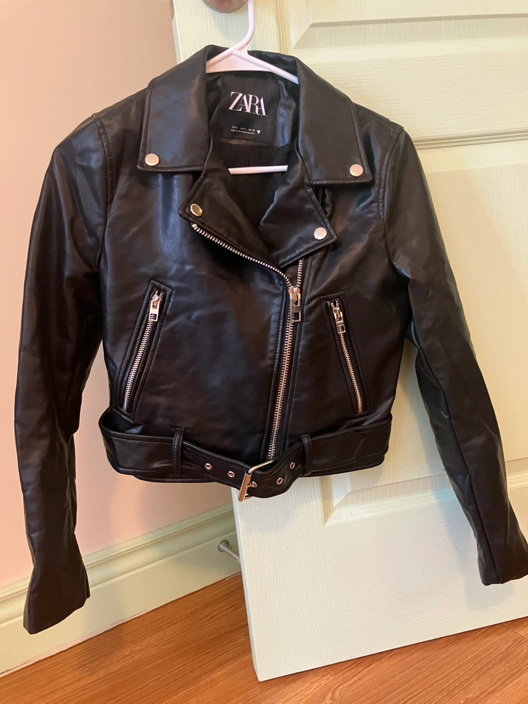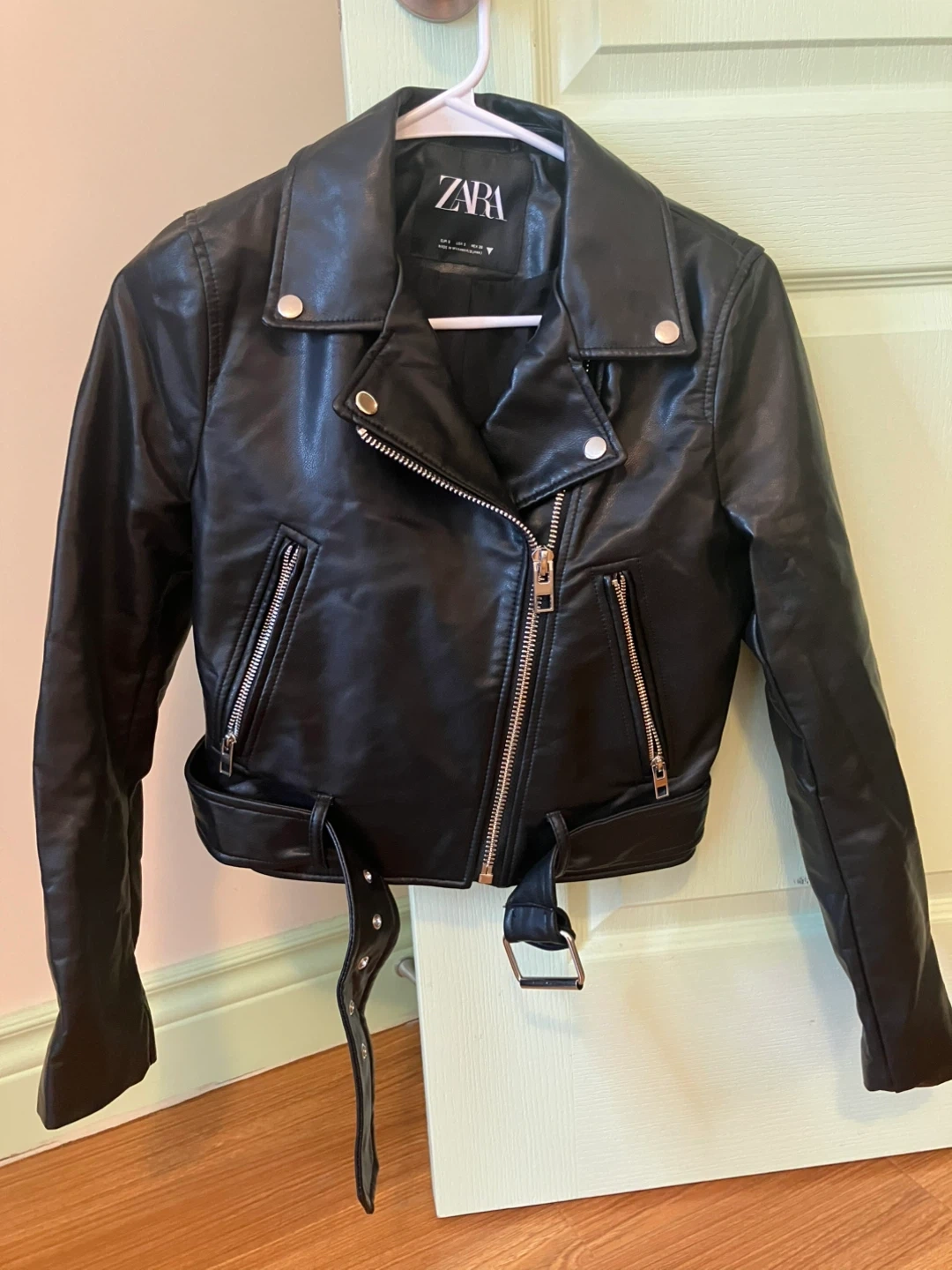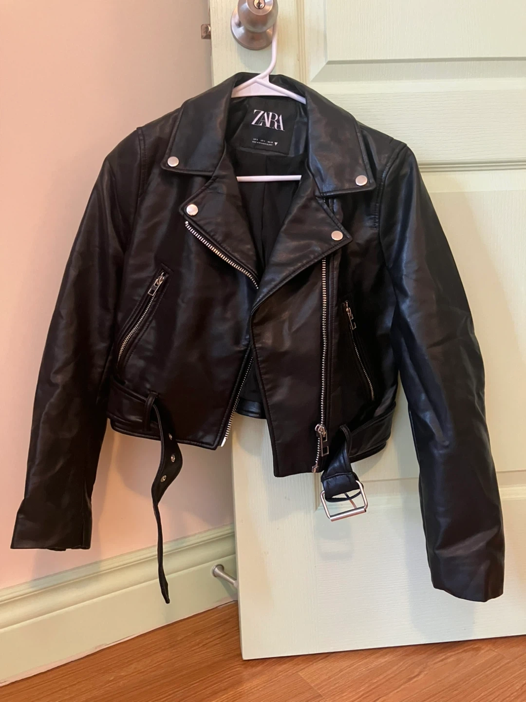 This ZARA moto jacket is black with a faux leather finish. It features a classic biker design with zippered pockets and a belt at the waist. It's a stylish outerwear piece that's great for layering.