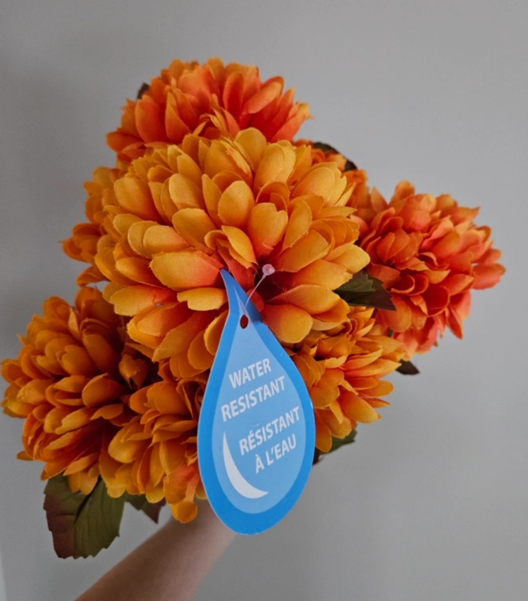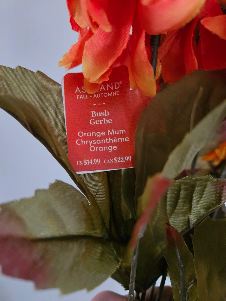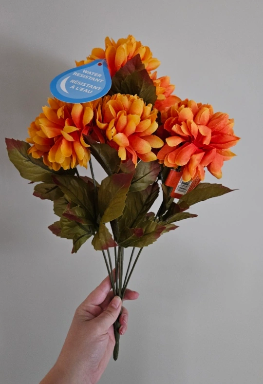 Artificial orange mum flowers. Fall colours. Water resistant. Great for decorating. One bunch. New with tag, retails for $22.99