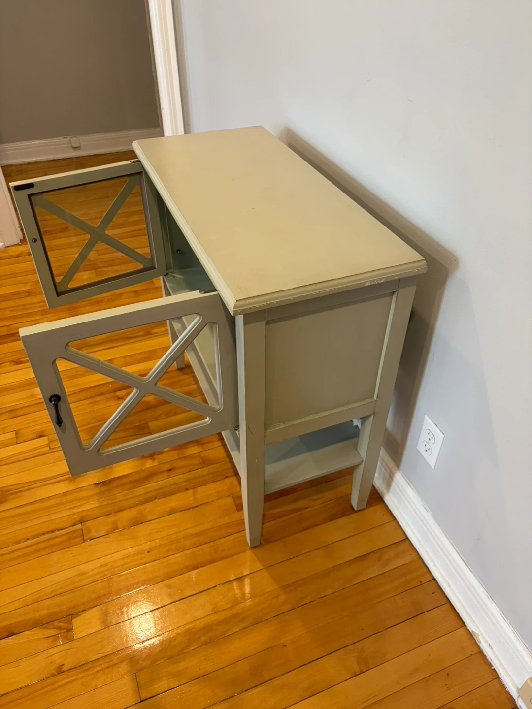 A light grey cabinet with two glass doors featuring an X-design. It has an open shelf below the main compartment. Perfect for storing smaller items or displaying decor.