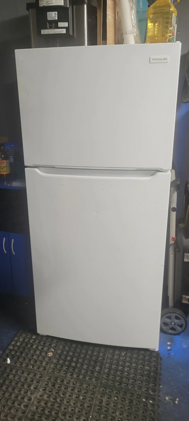 This is a Frigidaire top freezer refrigerator. It's a white model with a standard configuration. The interior features adjustable shelves and door bins Like new.