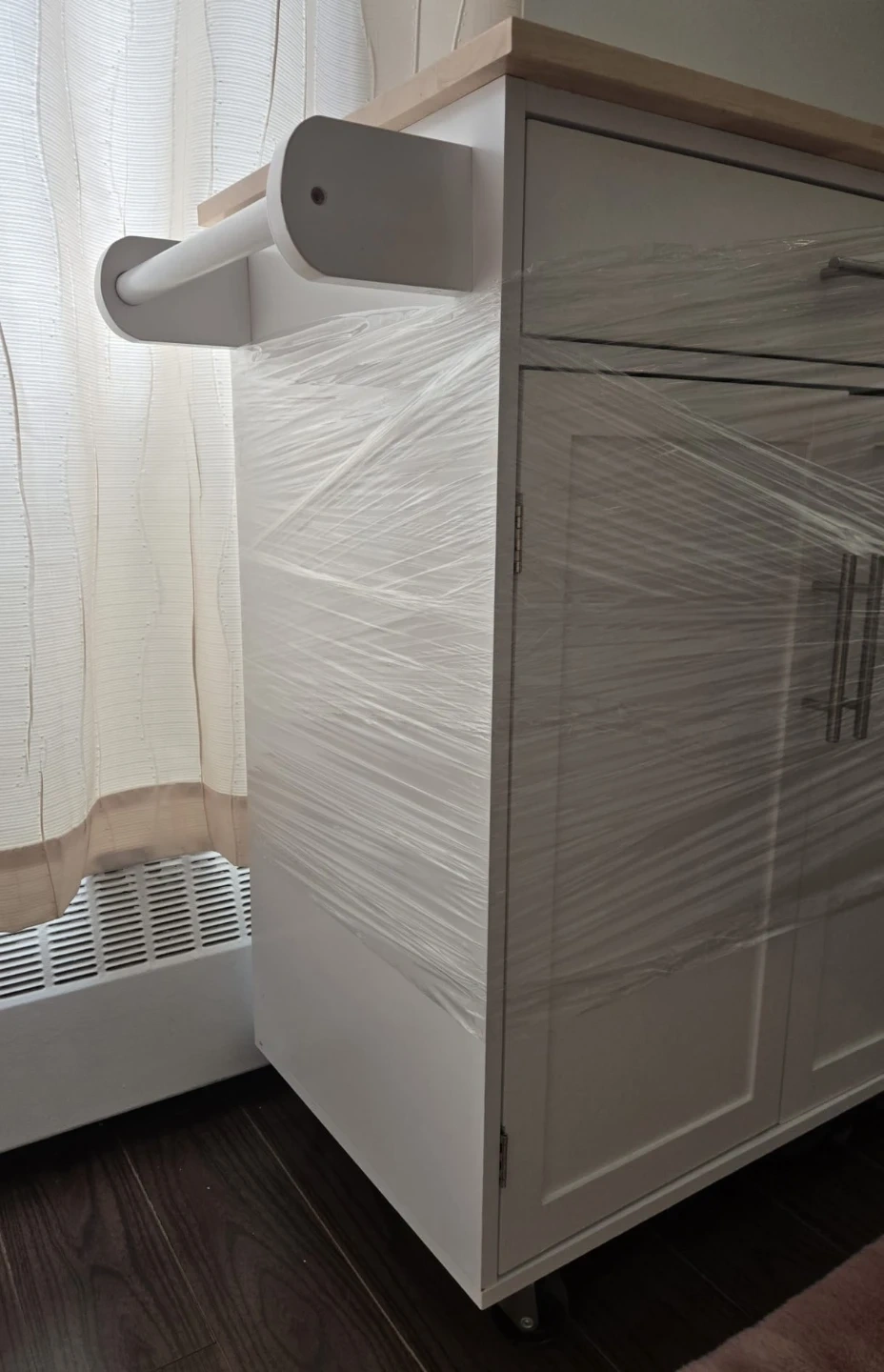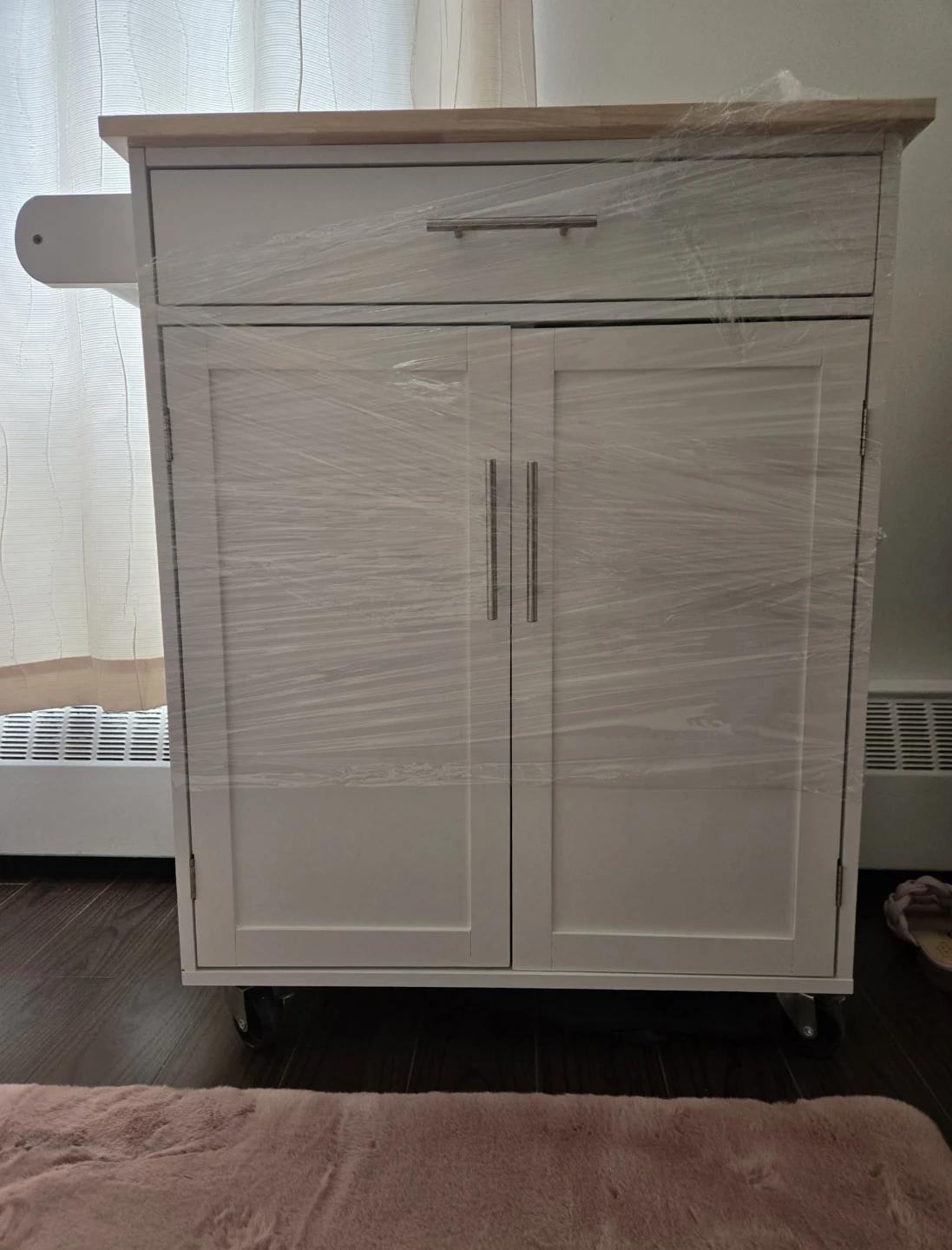 Selling a kitchen island with a lovely wood top and a white base. It's still wrapped in plastic, so it's in brand new condition! It features a drawer and cabinet space for storage, and it's on wheels for easy moving, dimensions are 40W, 70L and H is 90.