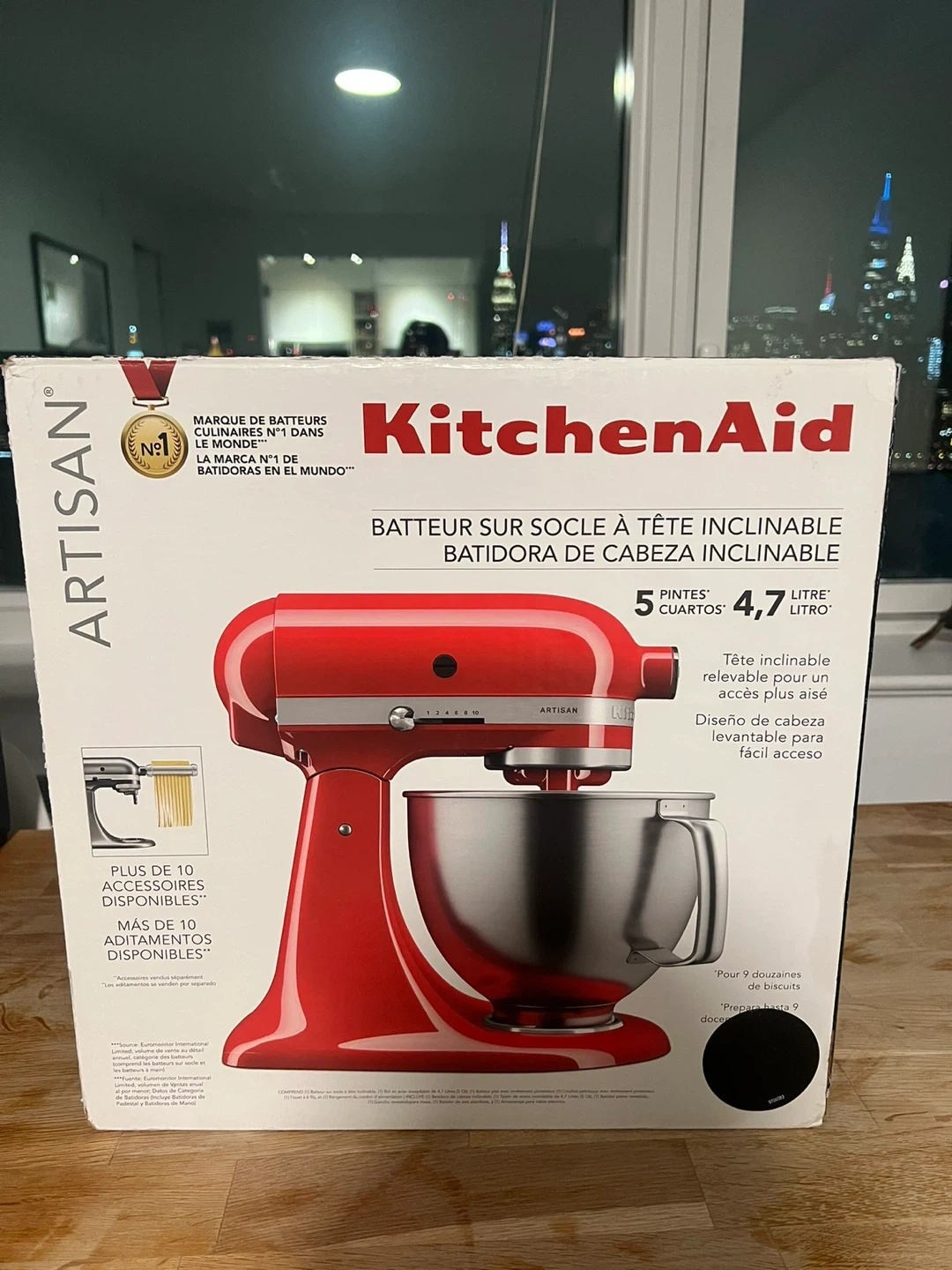 This is a red KitchenAid Artisan stand mixer. It has a 5-quart capacity, equivalent to 4.7 liters. The tilt-head design makes access easy. 3 accessories are available.