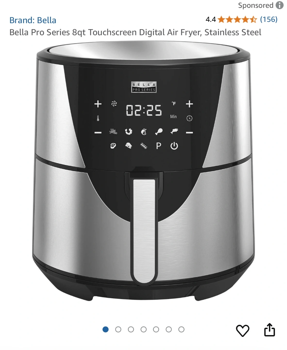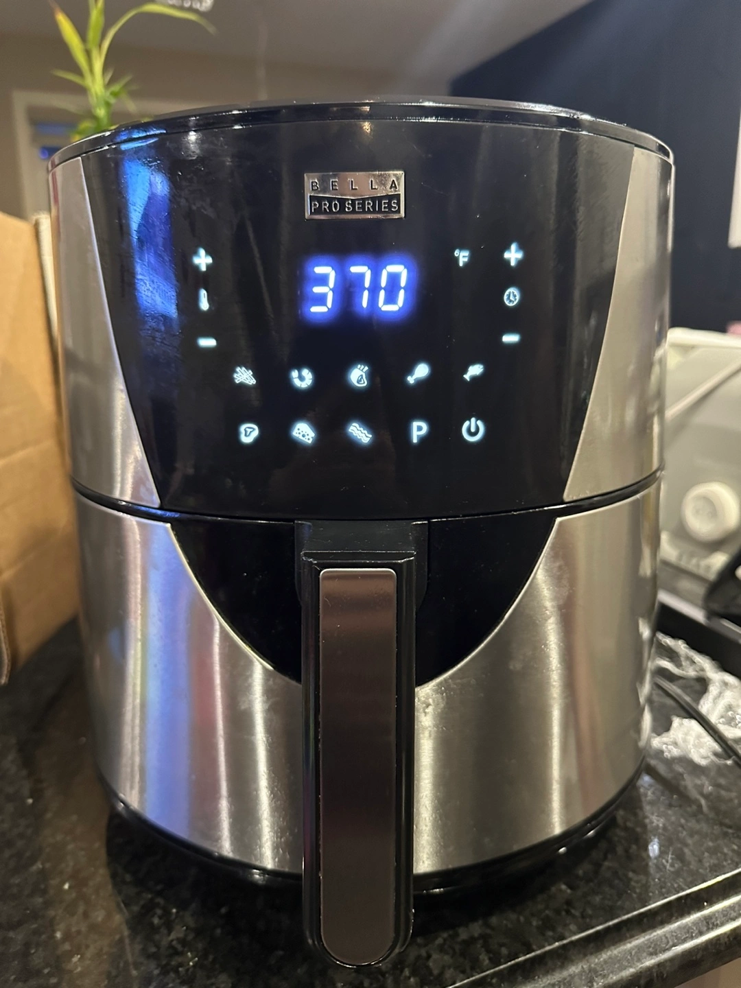 Stainless steel digital air fryer. 8 quart capacity. Touchscreen controls. Minor damage on exterior. Works perfectly fine just used for one event.