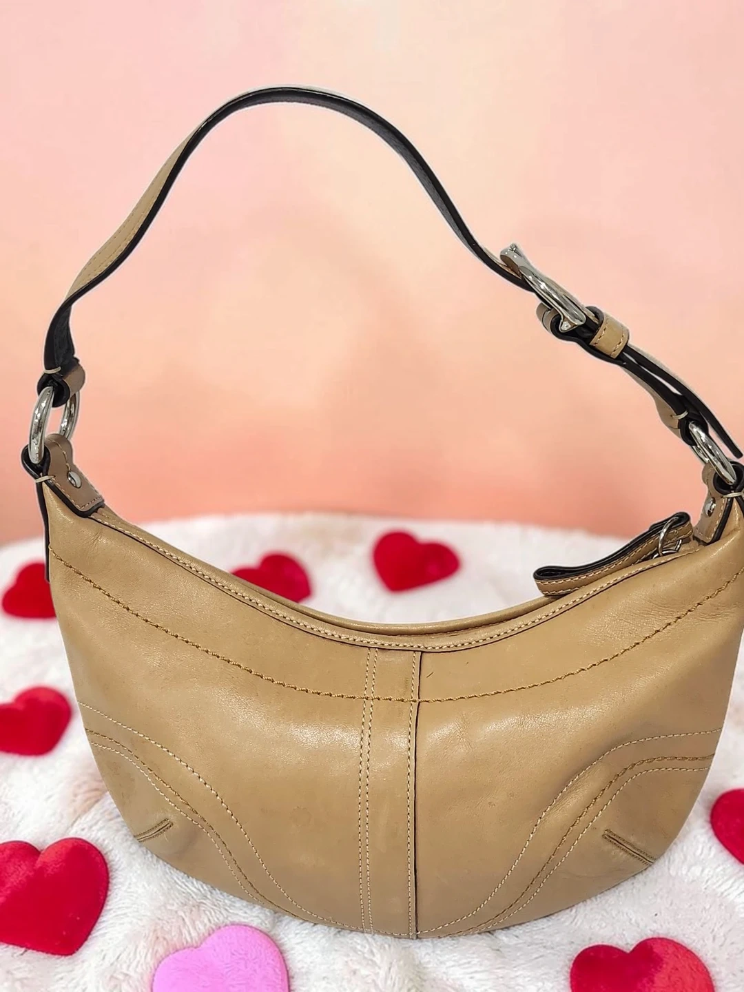 This is a Coach hobo bag, handcrafted from tan leather. It features stitching details and silver-tone hardware. Leather material.