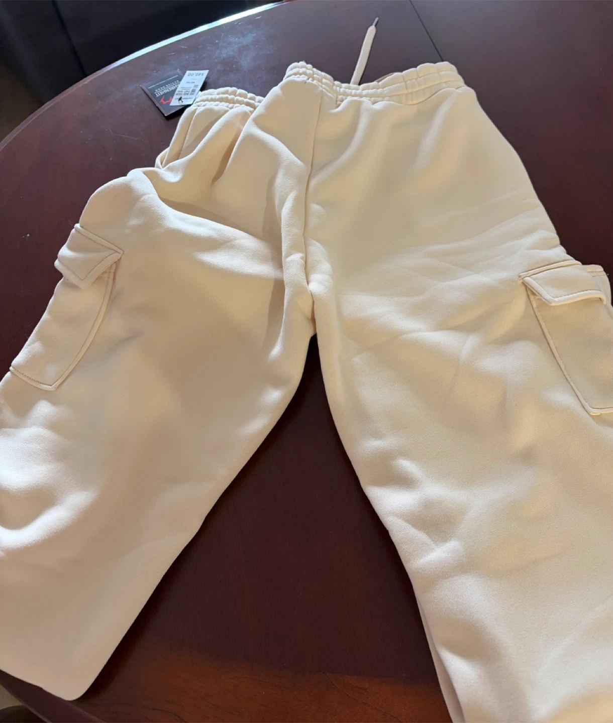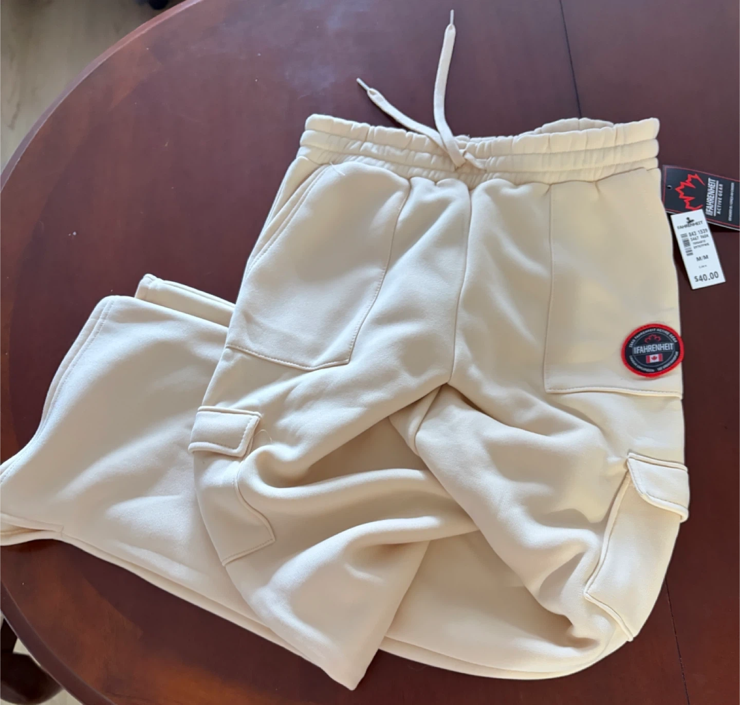 These are Zero Fahrenheit cargo sweatpants in a ivory colour. They are a size medium. The sweatpants feature a drawstring waist and multiple cargo pockets.
