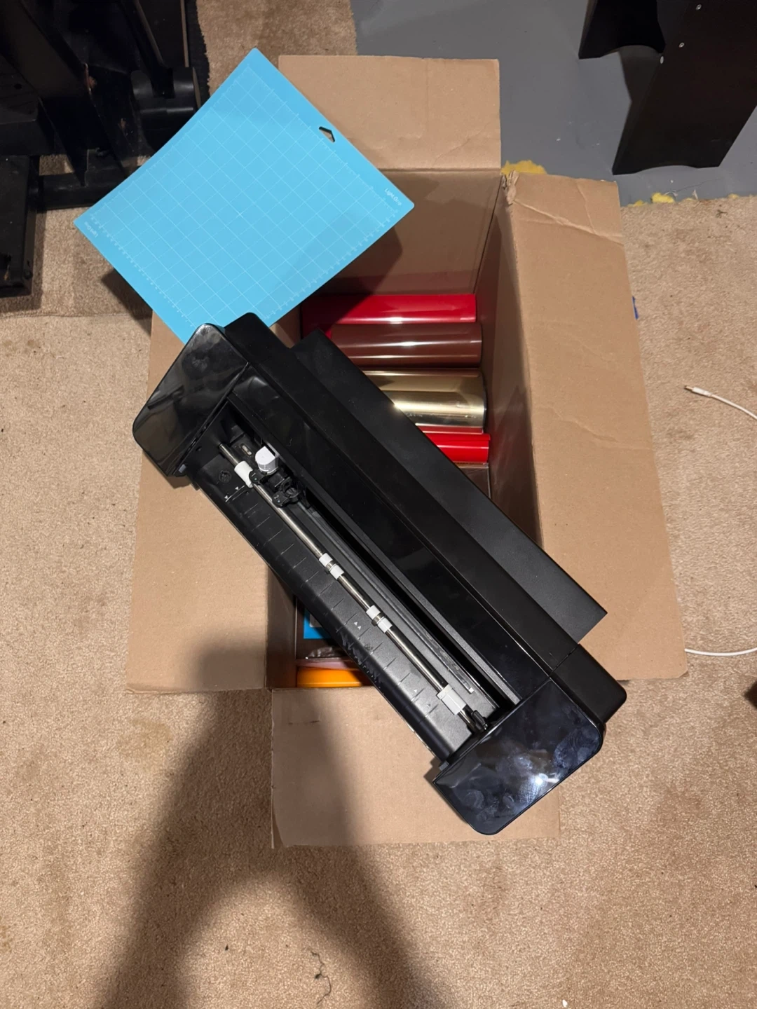 Selling a black Silhouette Cameo cutting machine. It's in good working condition and includes a blue cutting mat and several pieces of colourful heat transfer vinyl. This machine is great for crafting and making custom decals.