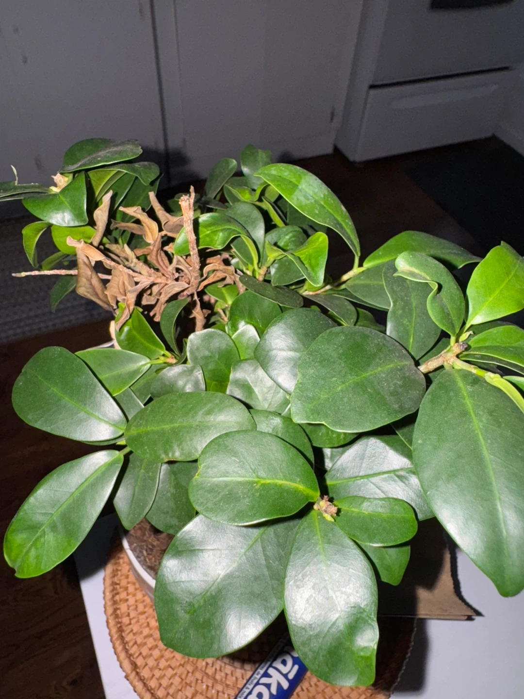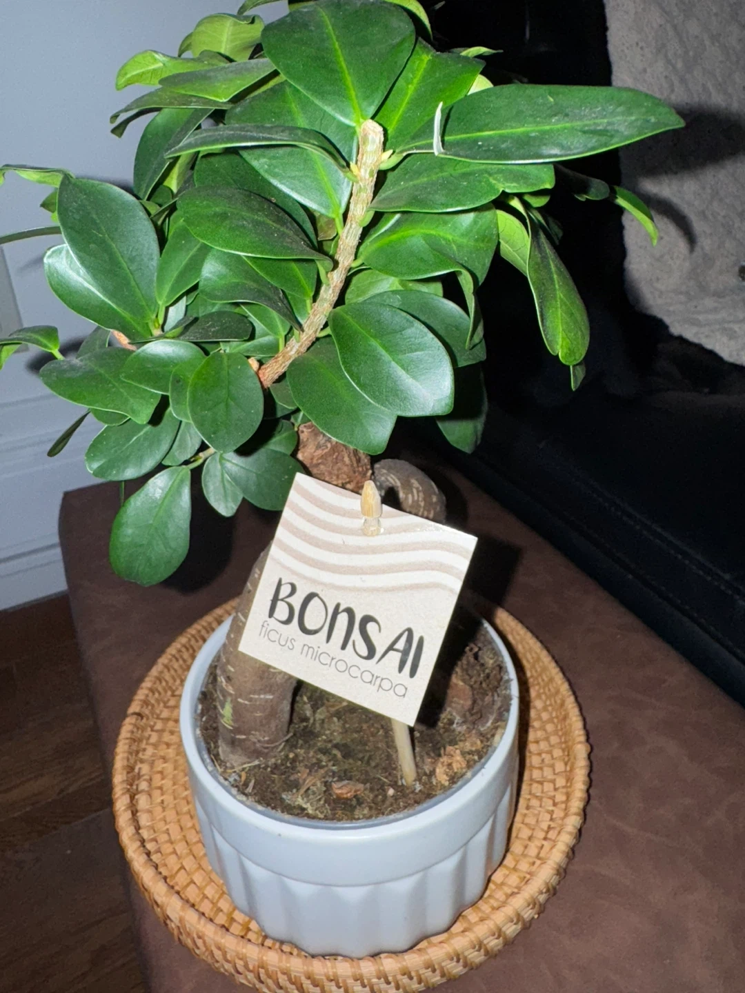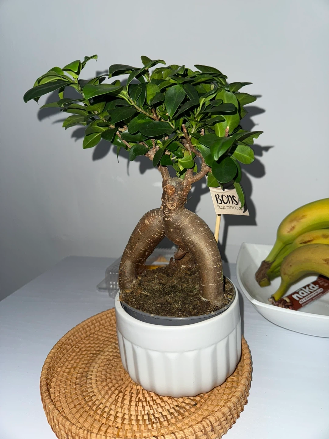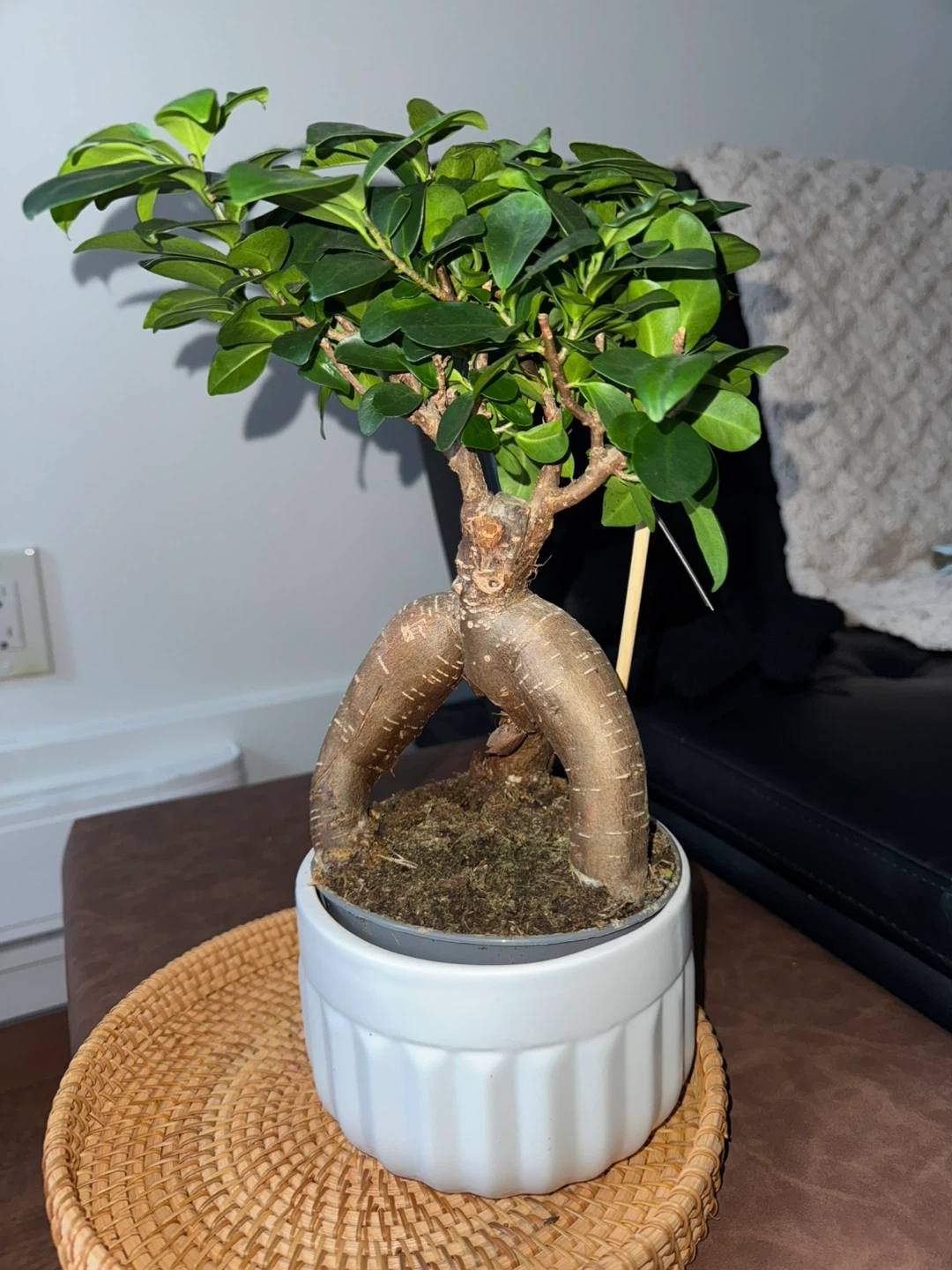 It's potted in a white ceramic planter with a decorative woven tray. It's a unique houseplant with eye-catching aerial