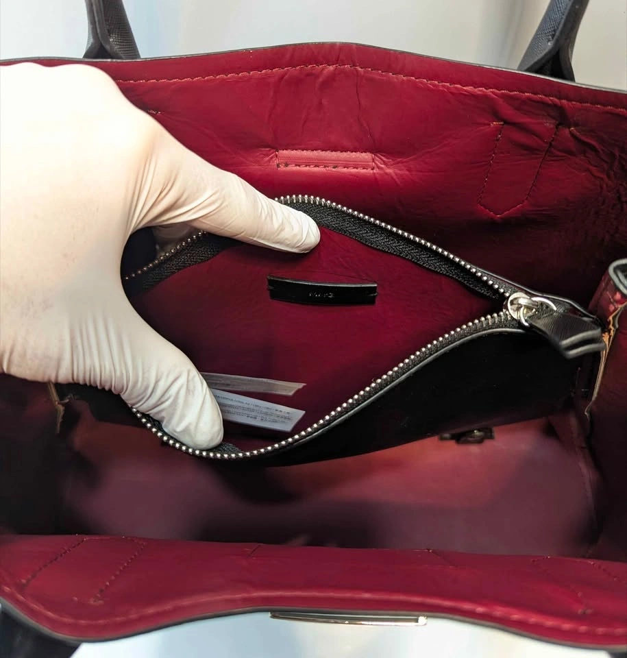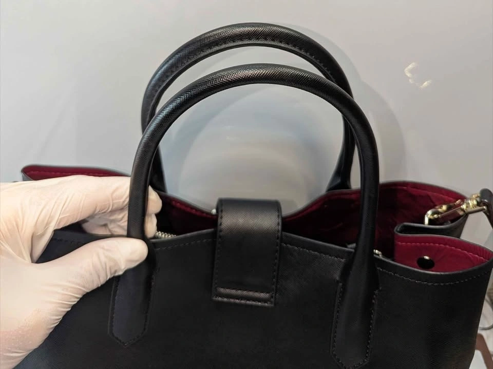 The interior is thoughtfully designed with a striking burgundy lining and a central zippered compartment to keep your essentials organized and secure. It offers ultimate versatility, allowing you to carry it by the elegant top handles or use the adjustable, detachable strap for a hands-free crossbody style.