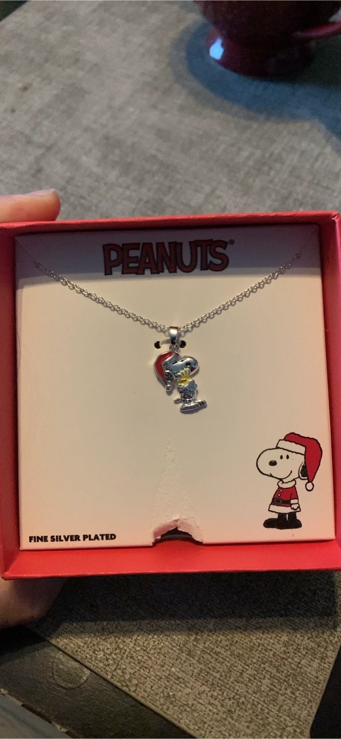 Peanuts Snoopy necklace! It's fine silver plated and features Snoopy with a Santa hat.