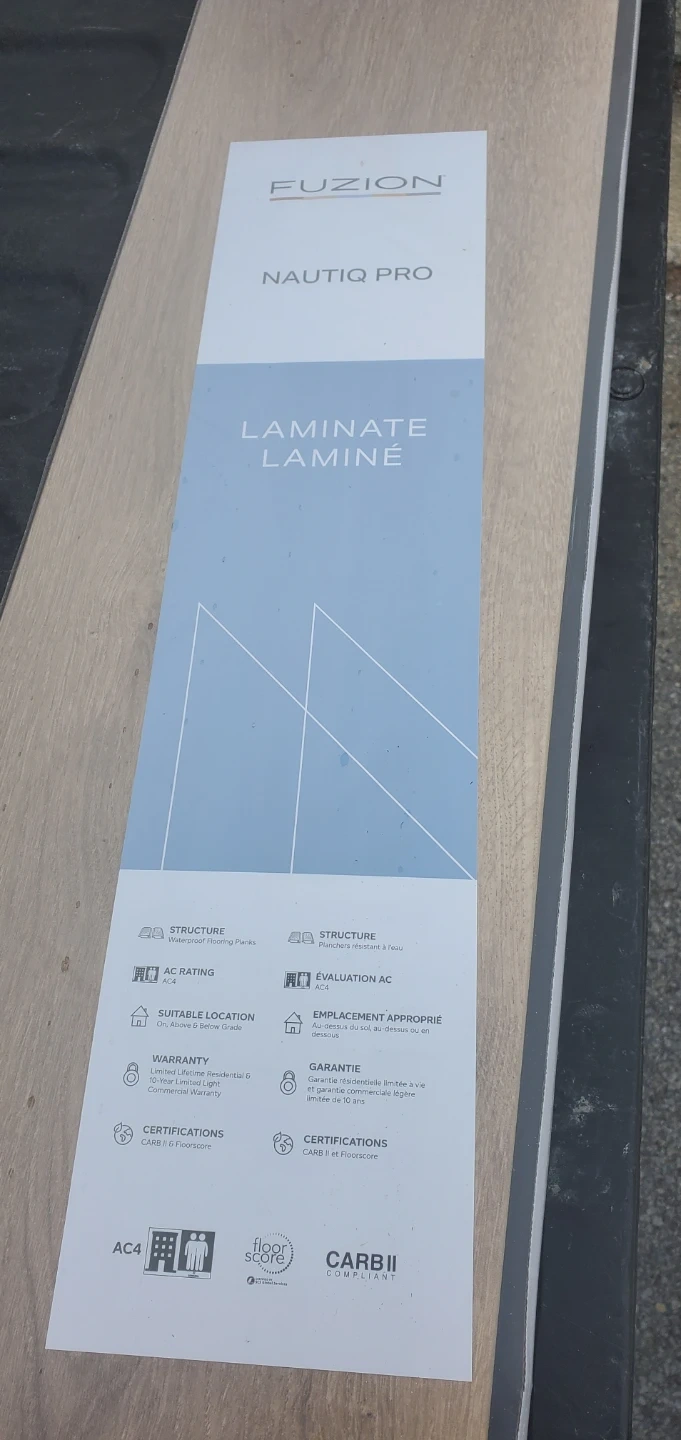 This is Fuzion Nautiq Pro laminate flooring in the Storm Breaker colour. It has an AC4 rating for residential and commercial use. The planks are water-resistant and durable.