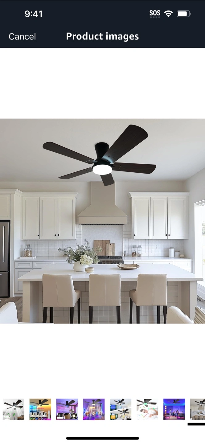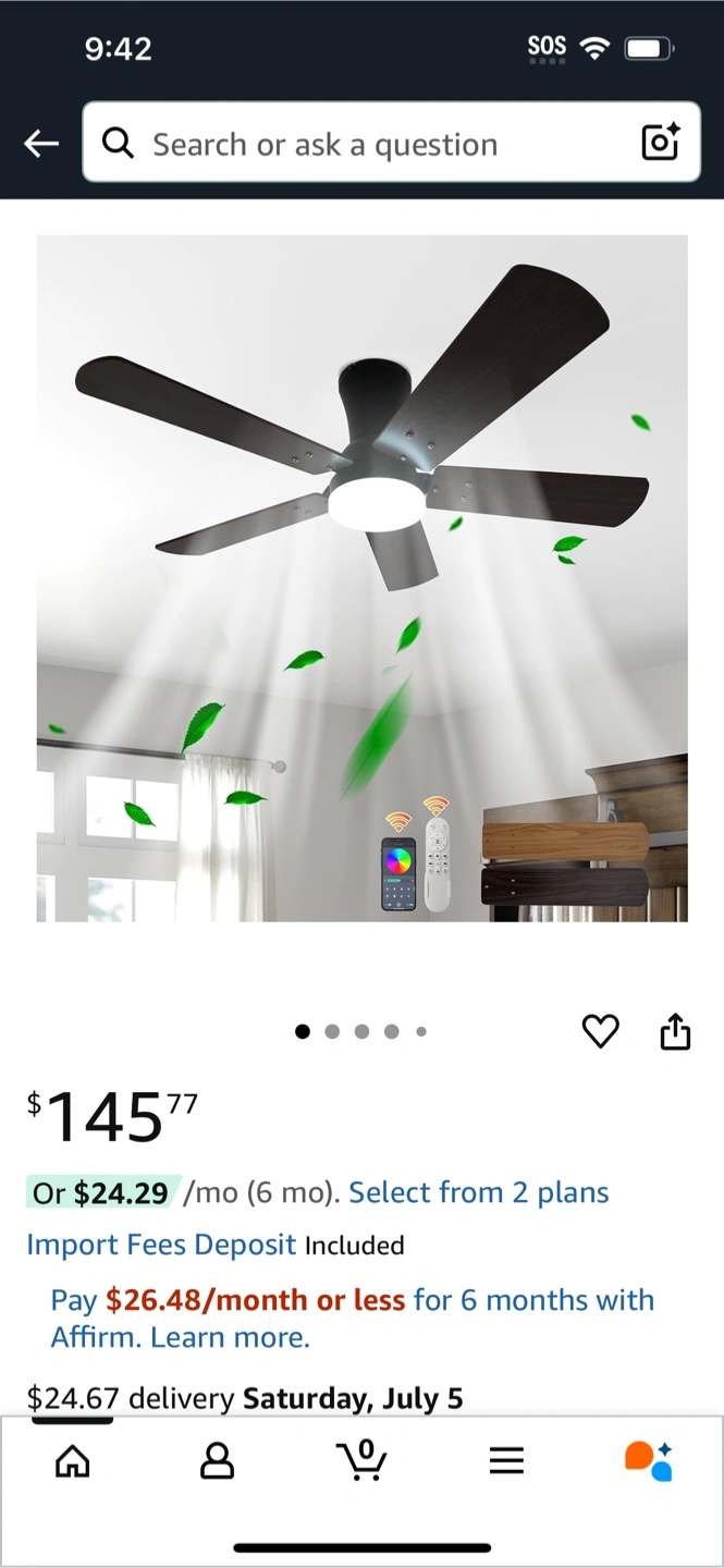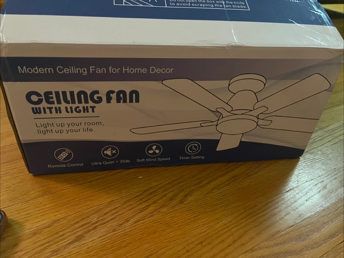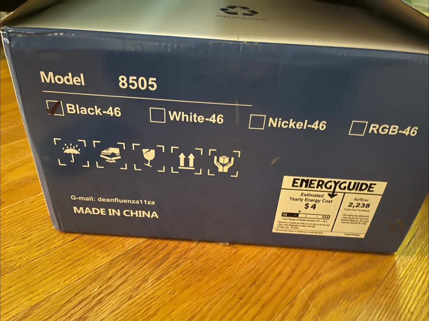 Selling a ceiling fan with light, model 8505 in Black-46. It comes in its original box. This modern ceiling fan is perfect for home decor and will light up your room. It has remote control, is ultra quiet at less than 35db, and has soft wind speed and timer settings