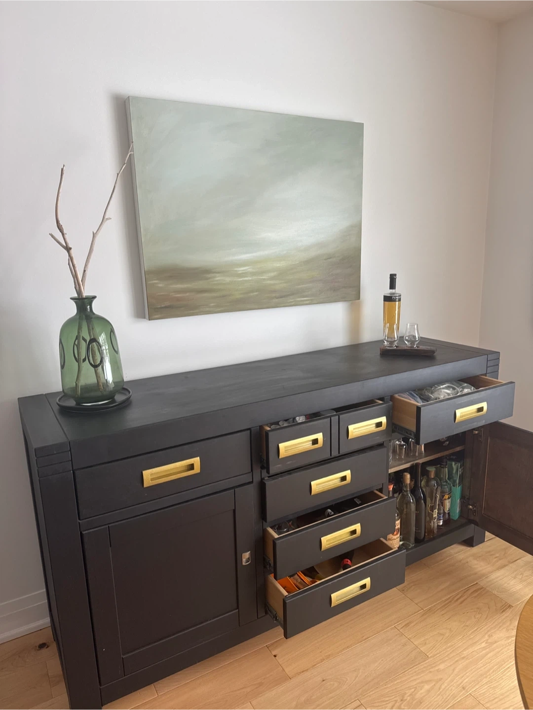 This dark wood sideboard features gold-toned drawer pulls and cabinet handles. It offers ample storage with multiple drawers and cabinets, perfect for dining room or living room use. Its sleek design complements modern and traditional decor.