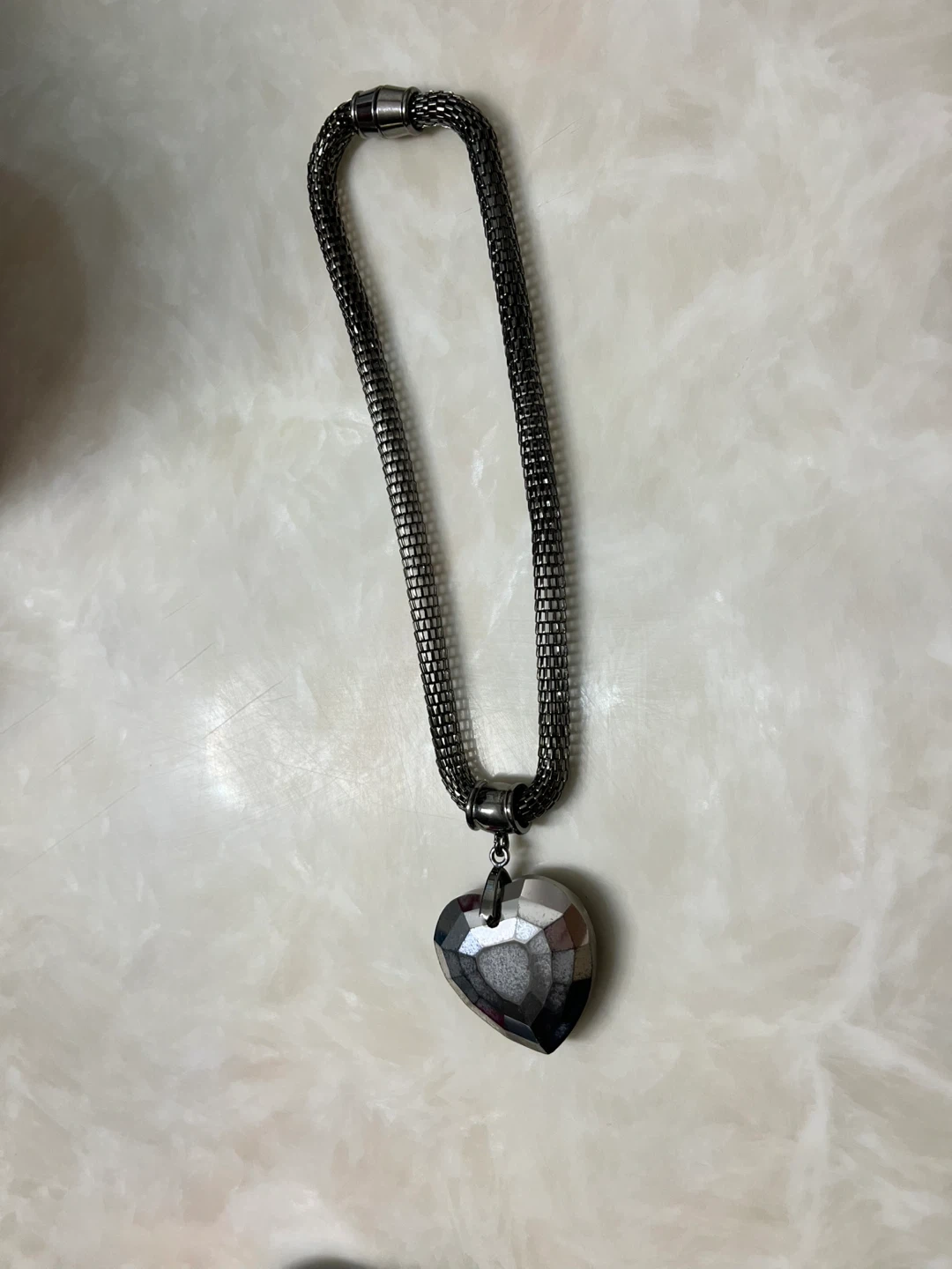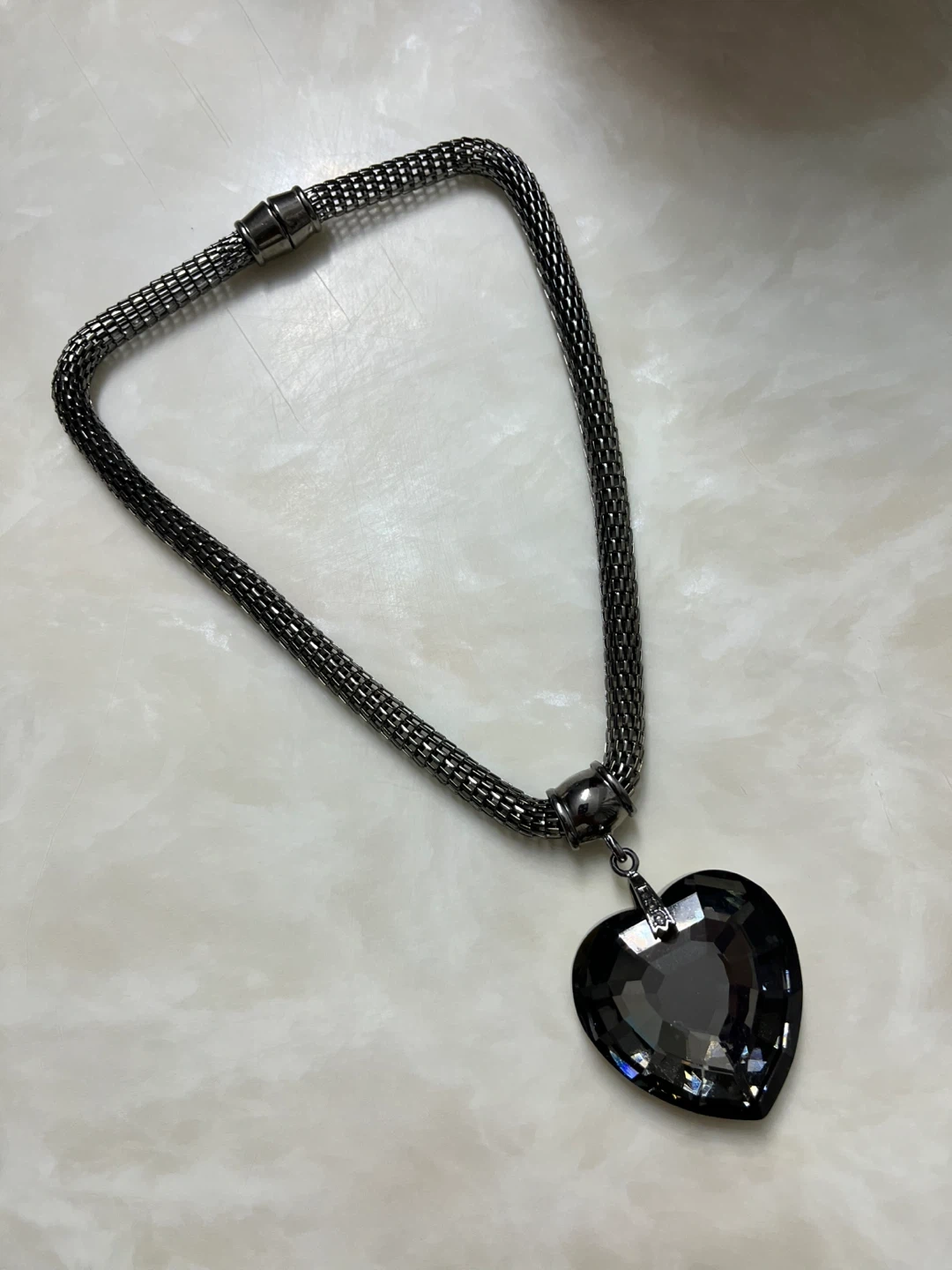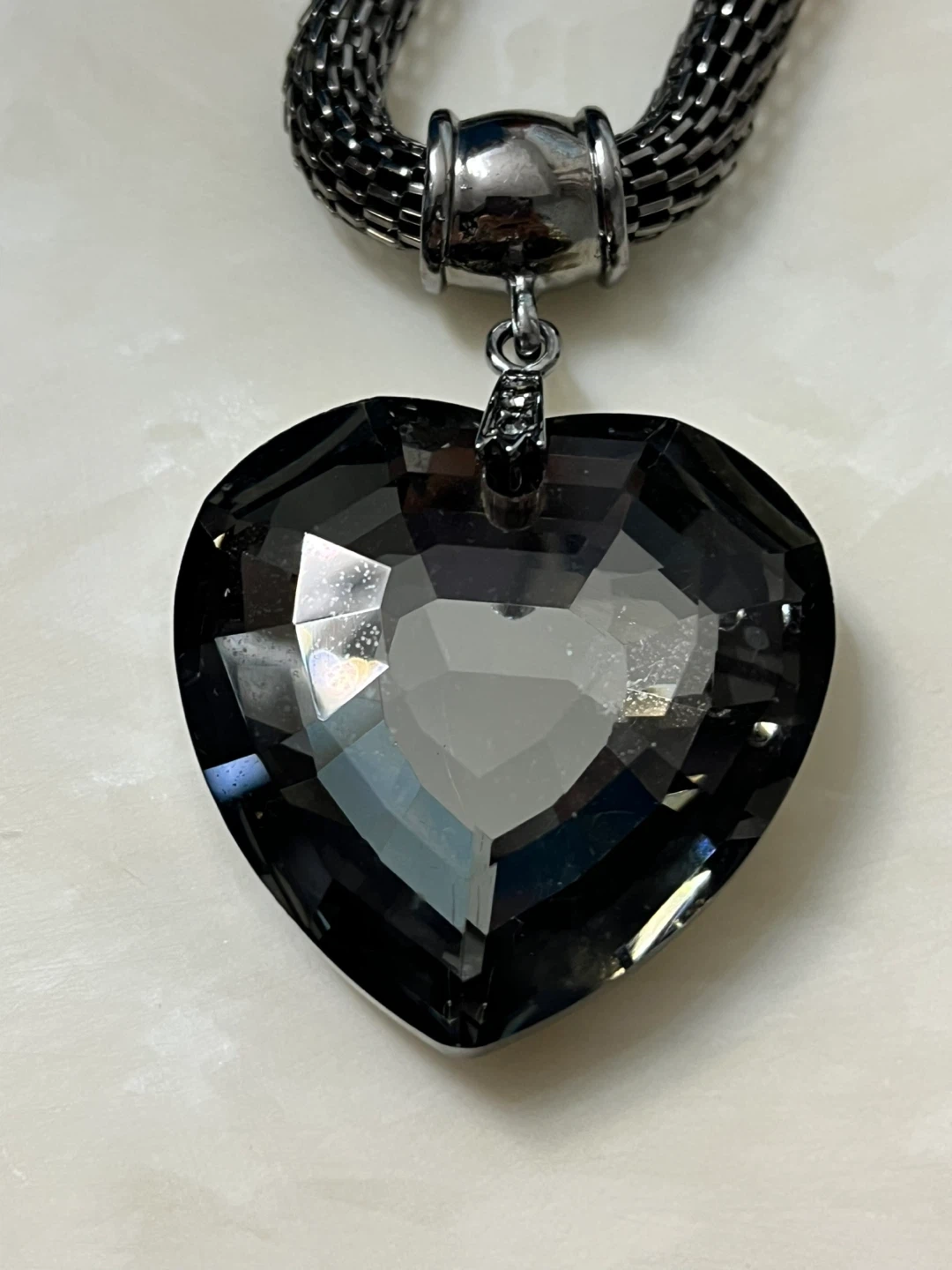 This necklace features a large, dark grey, faceted heart-shaped pendant. The chain is a gunmetal-coloured mesh style. It's a statement piece for any outfit!