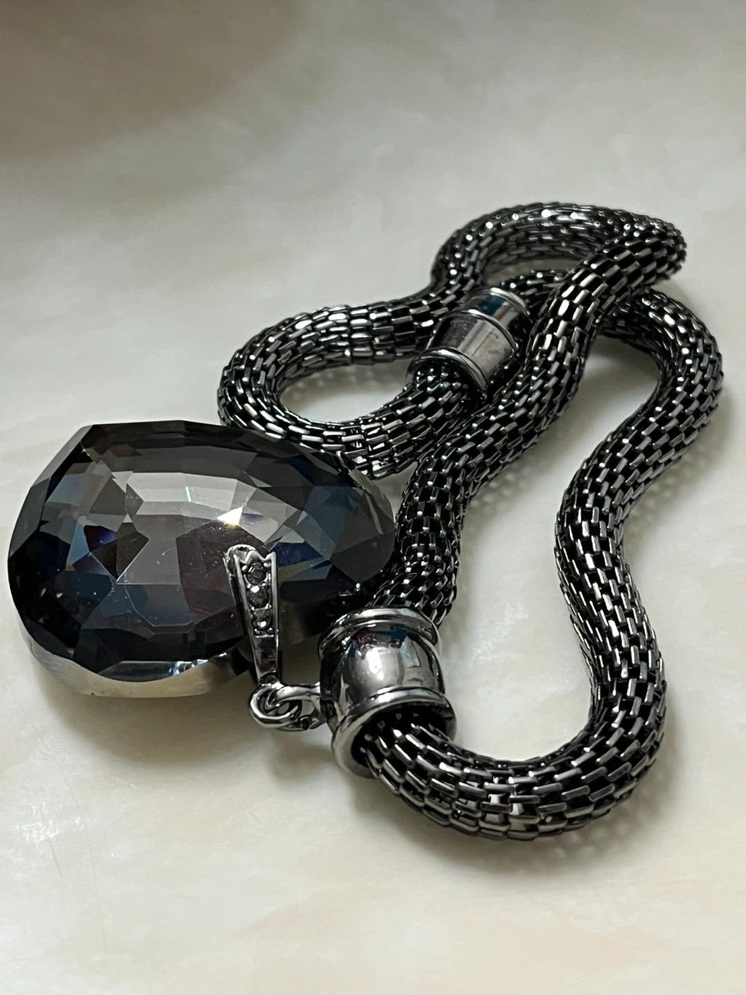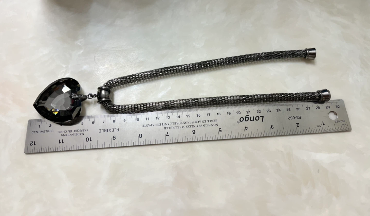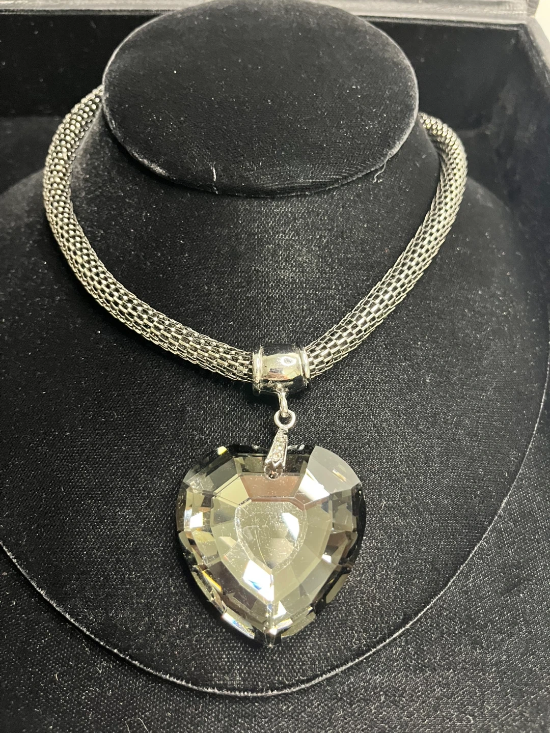 This necklace features a large, dark grey, faceted heart-shaped pendant. The chain is a gunmetal-coloured mesh style. It's a statement piece for any outfit!
