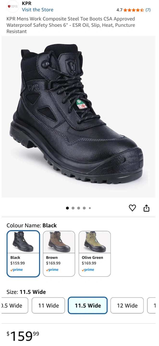 KPR men's work boots with a composite steel toe. CSA approved, waterproof, ESR oil, slip, heat, and puncture resistant. Black colour. Size 11.5 Wide.