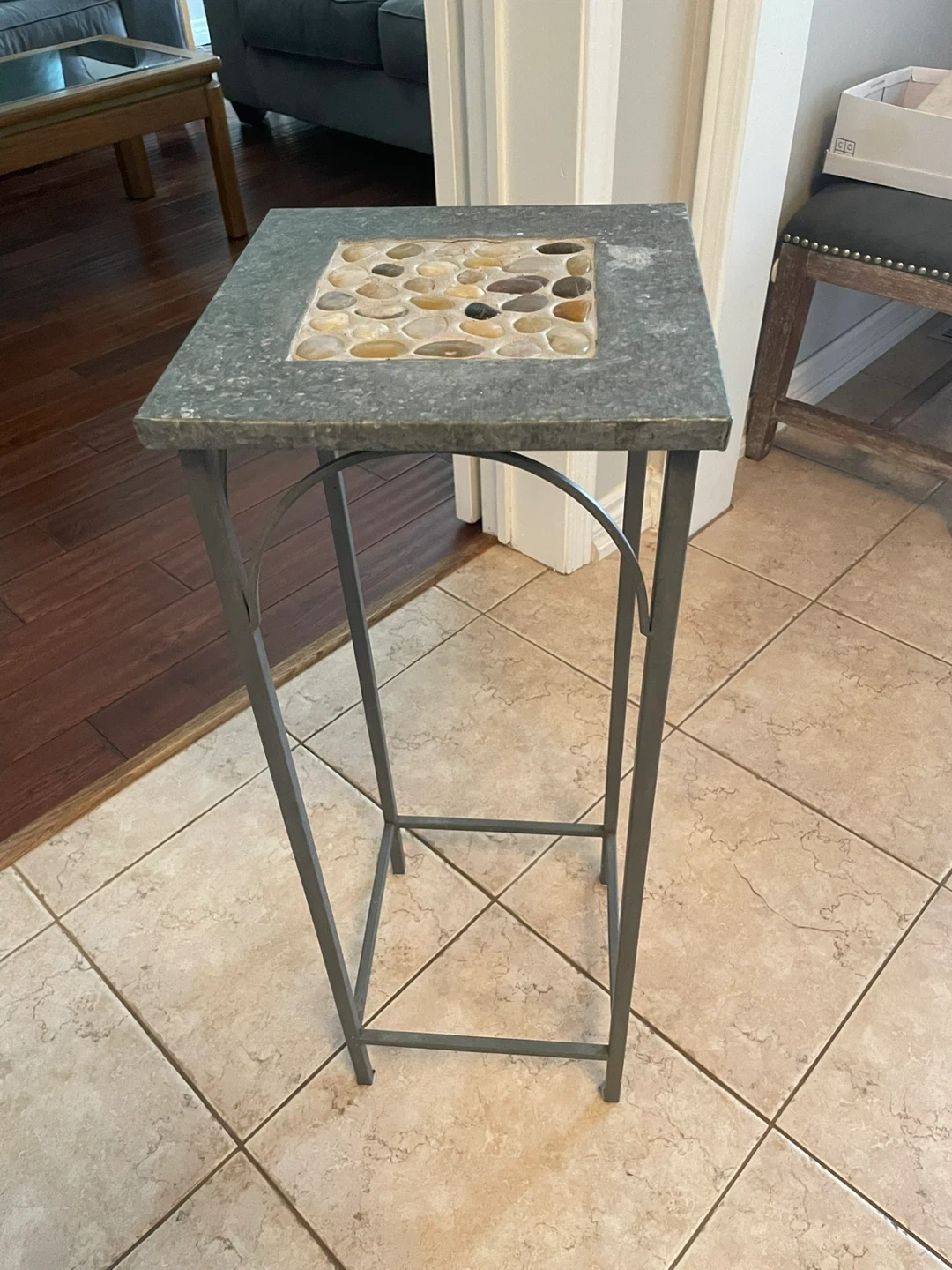 This accent table features a galvanized metal top with a decorative inset of smooth, polished river stones. The base is made of dark metal with a curved support. It's a lovely piece for displaying plants or decor.