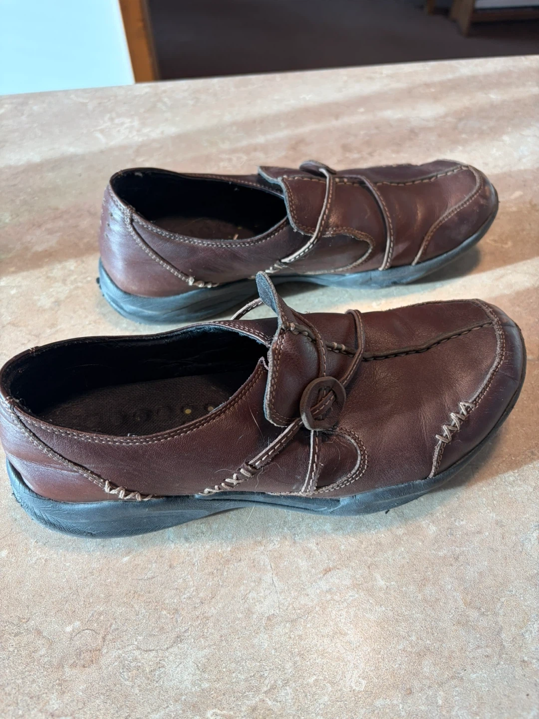 Comfortable brown leather slip-on shoes. Features a secure strap closure and a cushioned footbed. Made with durable leather. Great for walking!