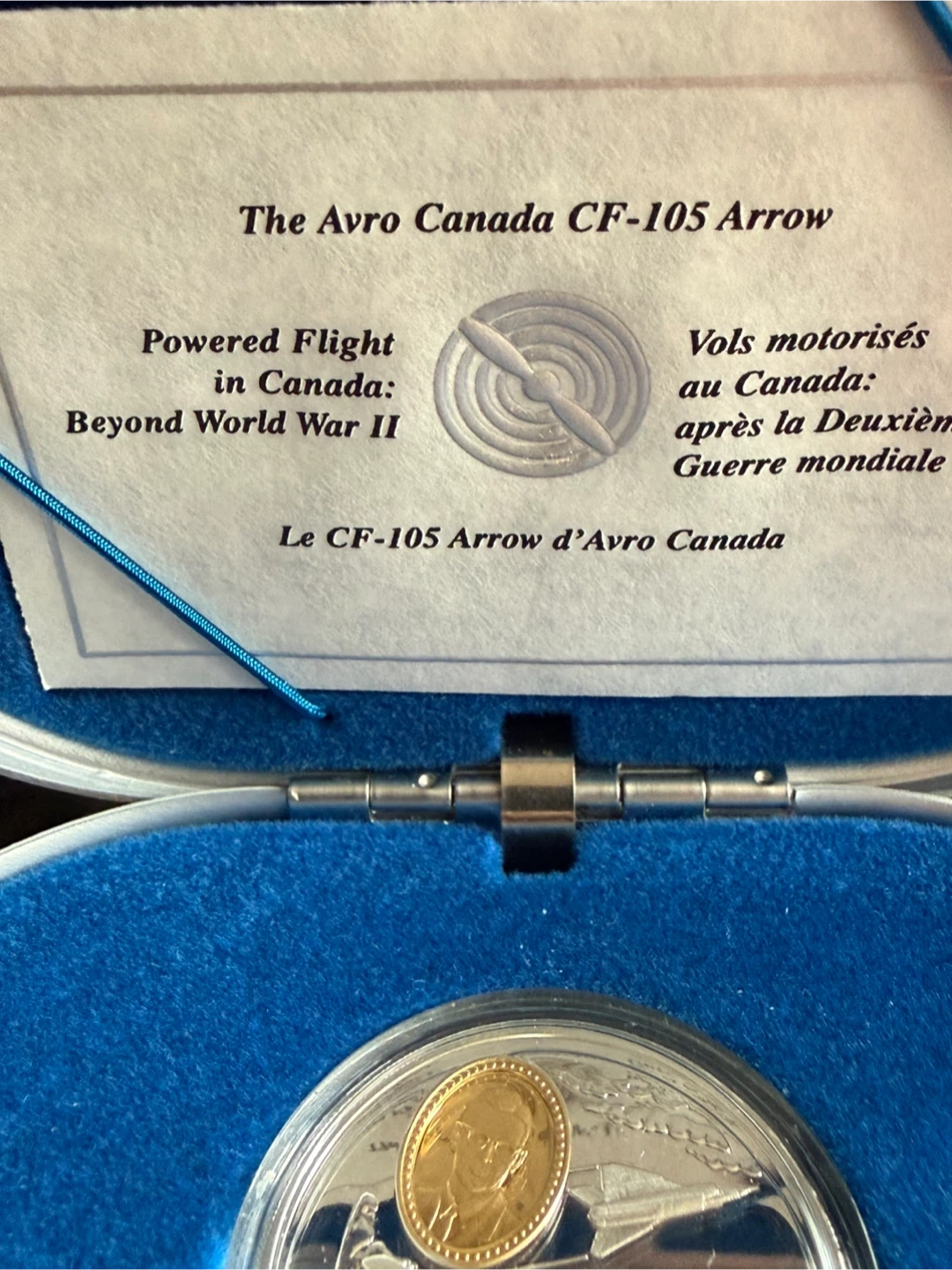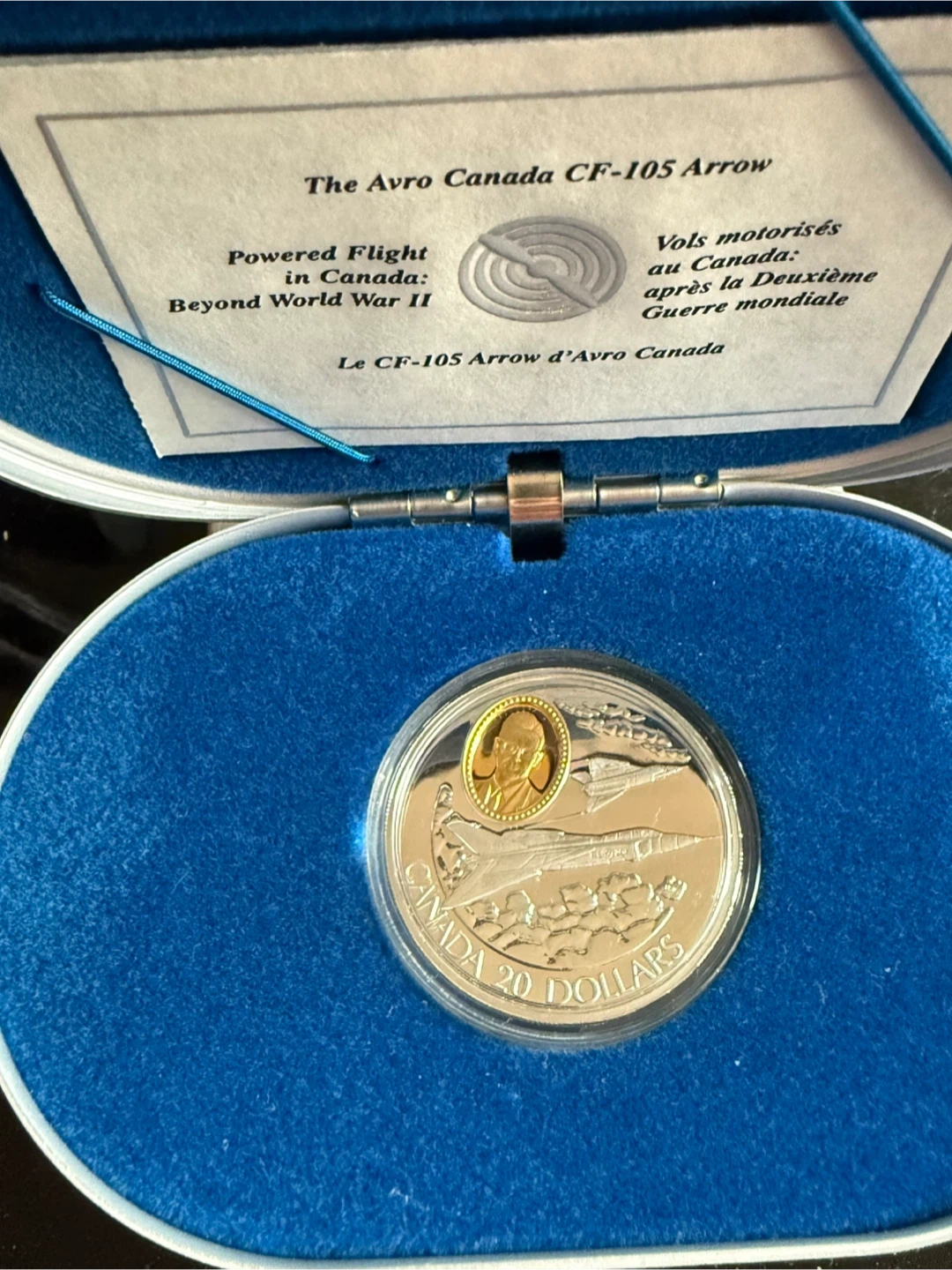 A commemorative $20 coin featuring the Avro Canada CF-105 Arrow aircraft. It's struck in Canada and celebrates powered flight. This coin includes a small portrait in the centre. It’s sterling silver ,24 karat gold cover cameo . In original box + c