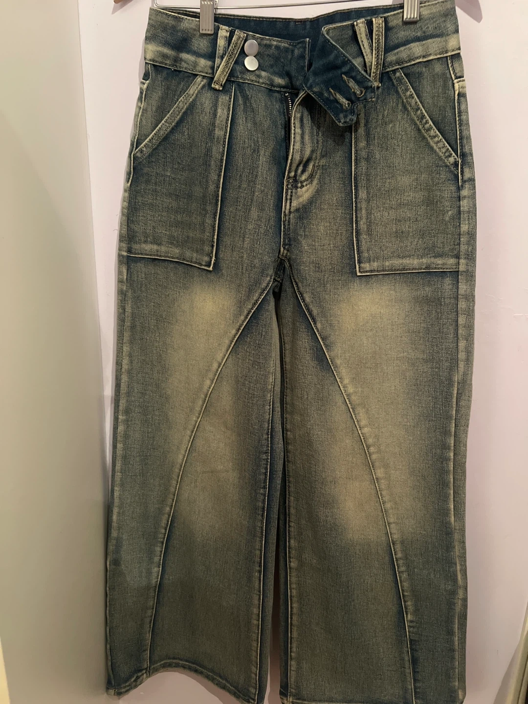 These women's wide leg jeans feature a vintage wash and unique paneling. The denim is 100% cotton. They have a zip fly with button closure and front pockets. These pants are a size medium.