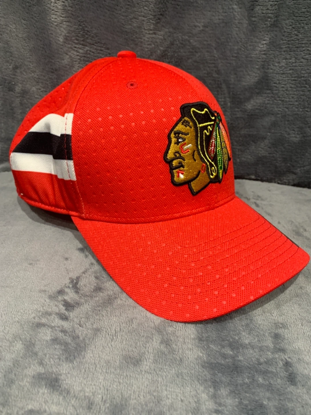 Red Adidas baseball cap featuring the Chicago Blackhawks logo. It's made with breathable material and has the Adidas logo on the side. A classic fan accessory for game day!