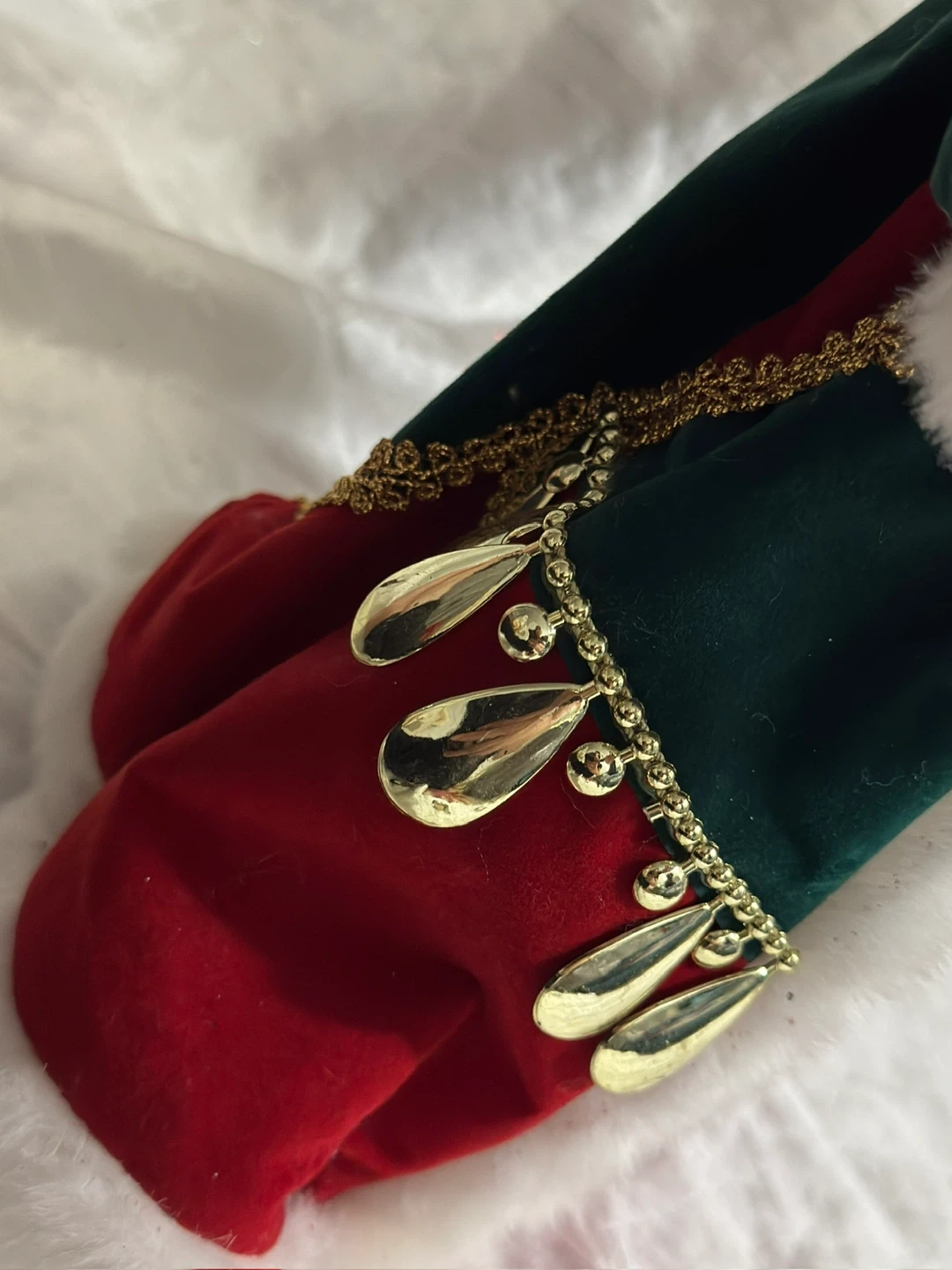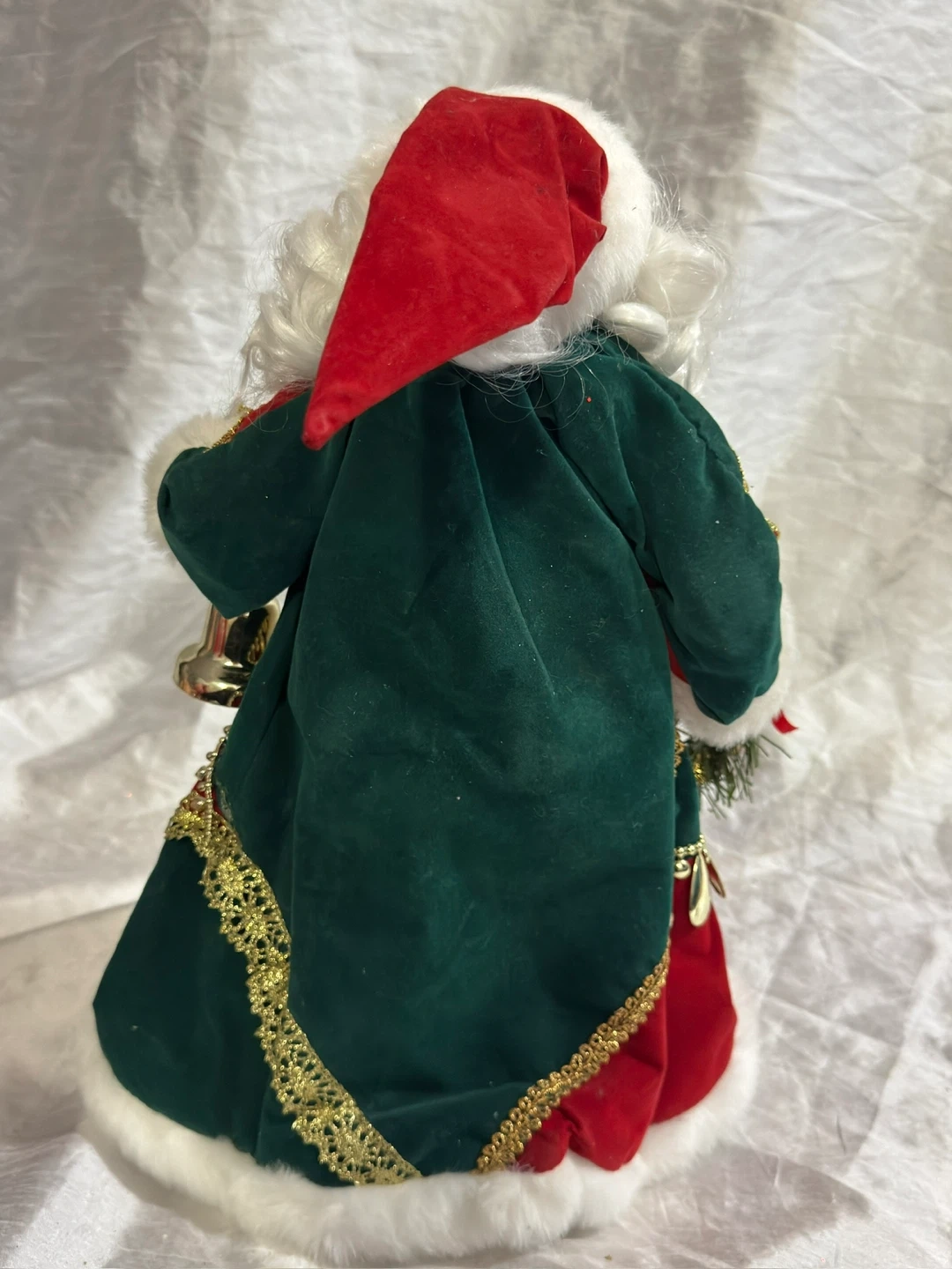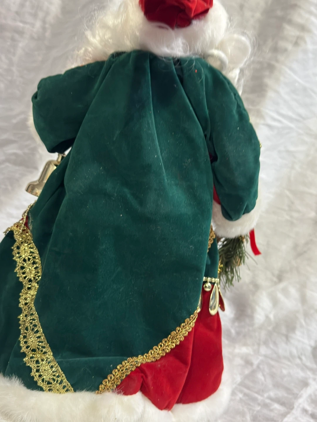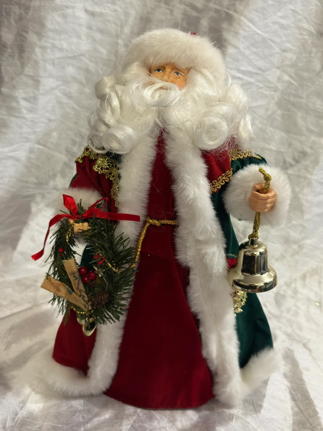 This is a decorative Santa Claus doll. It's dressed in a red and green velvet outfit with gold trim and white faux fur. The doll carries a sack with greenery and berries, and also holds a bell. A small wreath is also included.