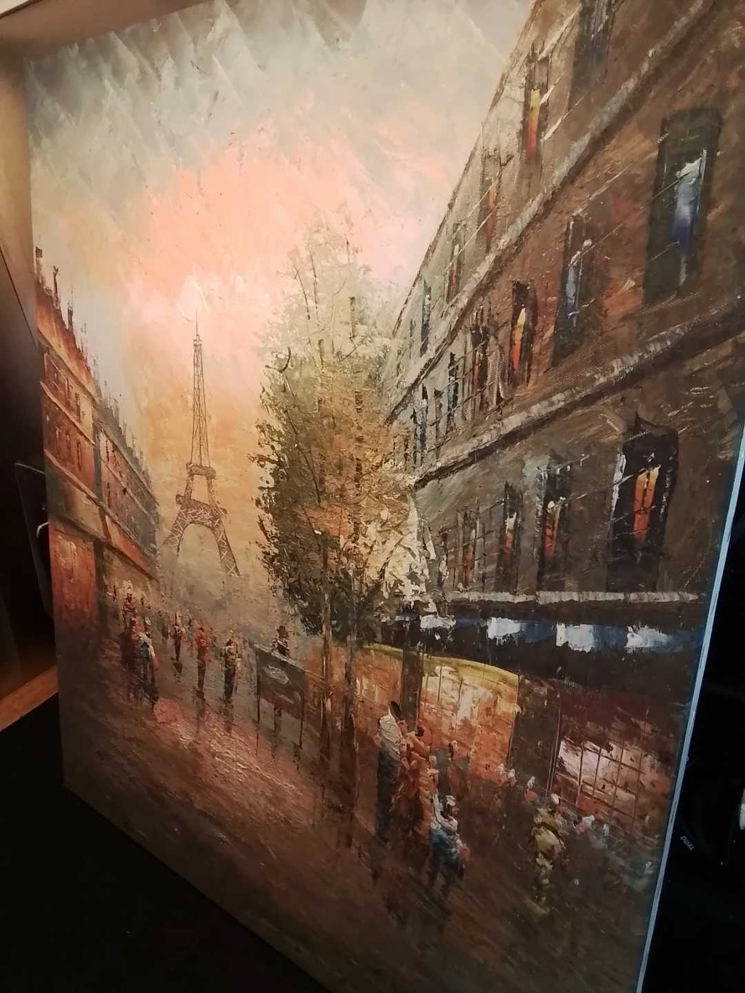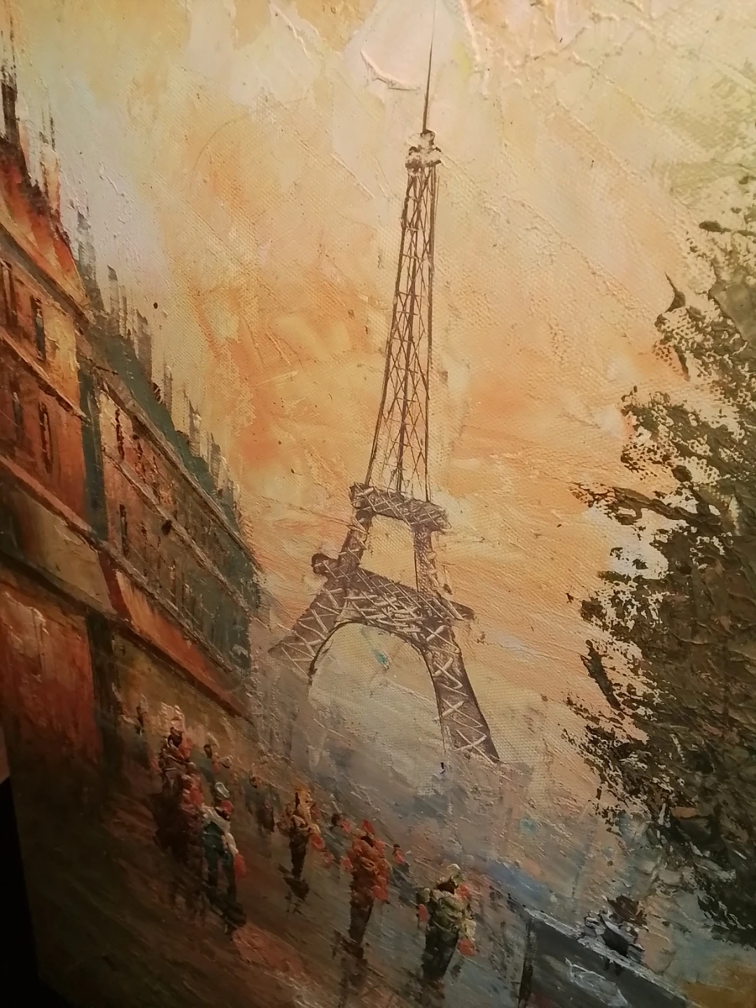 This is an oil painting depicting a street scene in Paris, with the Eiffel Tower visible in the background. The artwork features a vibrant impasto style, showing people on a street. It's painted on canvas and mounted on a wooden frame.