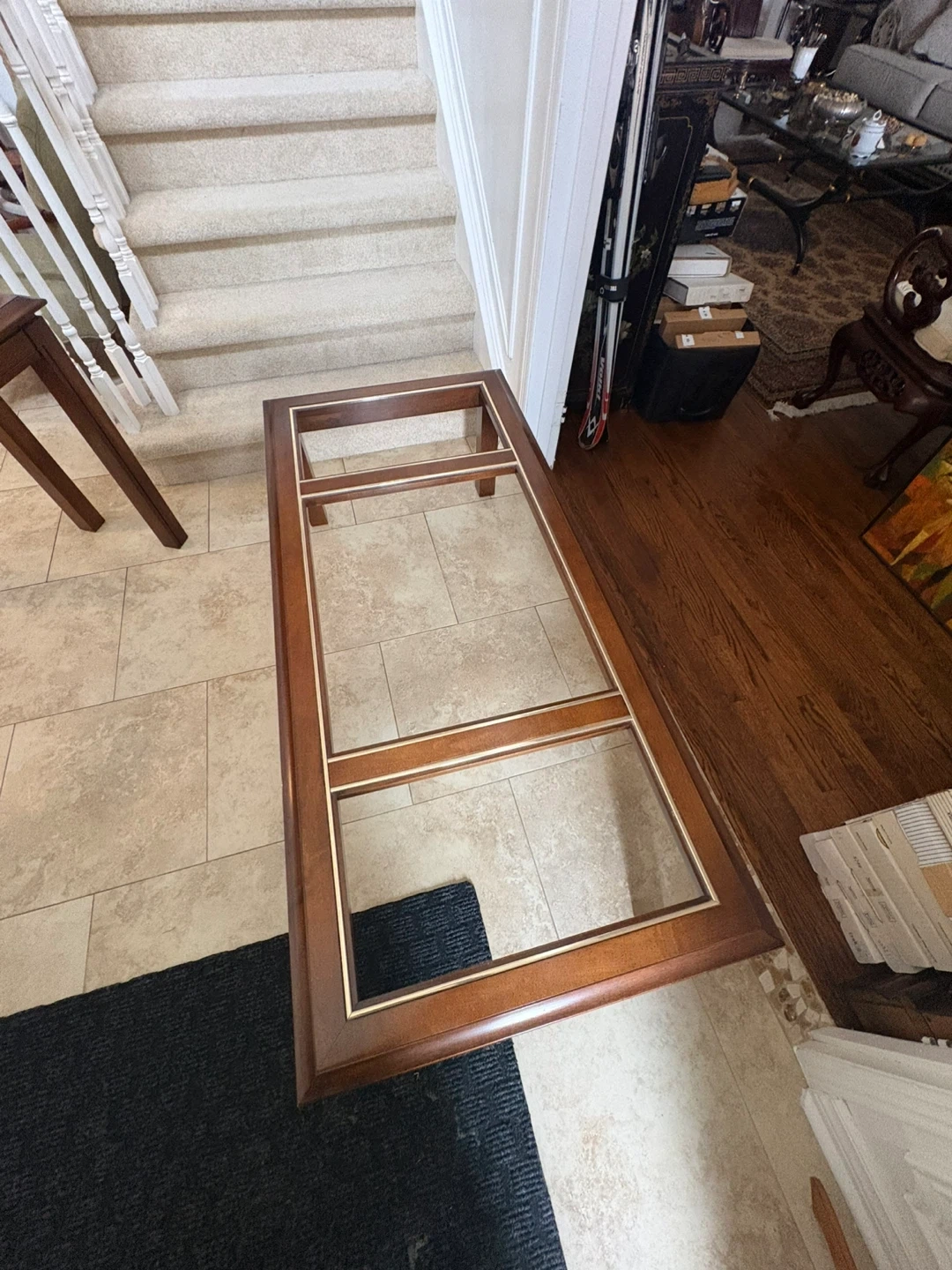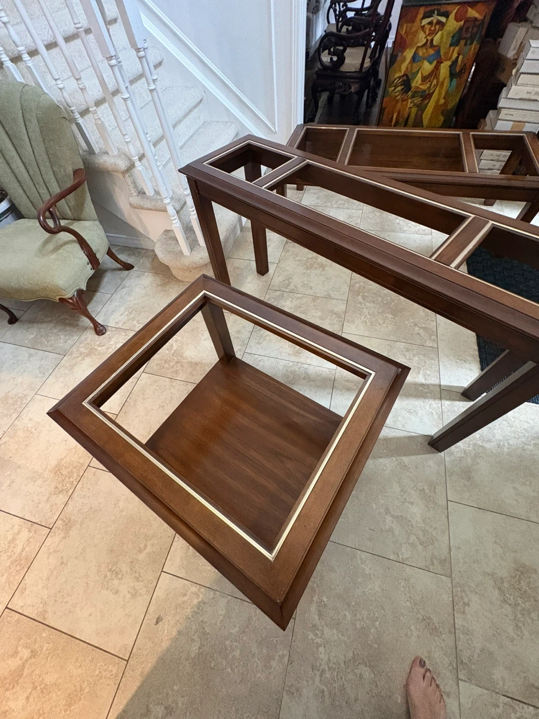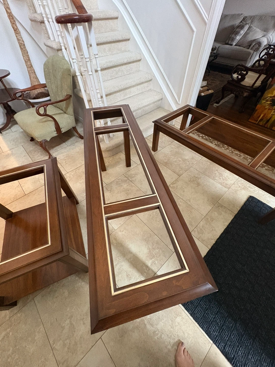Here's a set of four wooden tables, featuring glass tops with decorative gold trim. This set includes a coffee table and three end tables. They're made of dark wood and are sturdy. This set would be great for a living room or den!