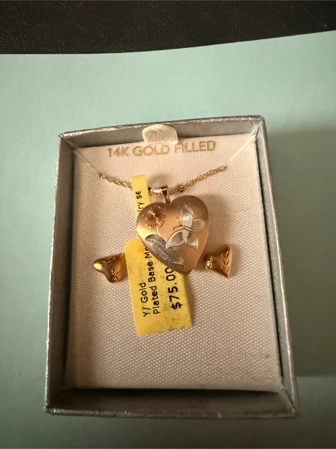 An 18” 14K gold filled heart locket necklace and matching 6mm stud earrings. The locket has a butterfly and floral design. It comes presented in its original box. This set is a lovely gift for someone special on Valentine’s Day