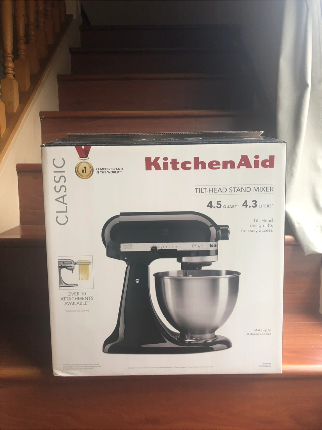 This is a black KitchenAid Classic tilt-head stand mixer. It has a 4.5 quart capacity and the tilt-head design lifts for easy access. It can make up to 8 dozen cookies and over 10 attachments are available. This mixer is great for baking and is a staple in any kitchen!