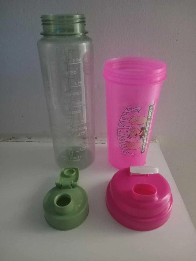 I'm selling a Popeye's Supplements water bottle with time markers and a shaker cup, both showing signs of use. The green-lidded bottle is great for tracking your water intake throughout the day, and the pink shaker is perfect for mixing your favourite supplements.