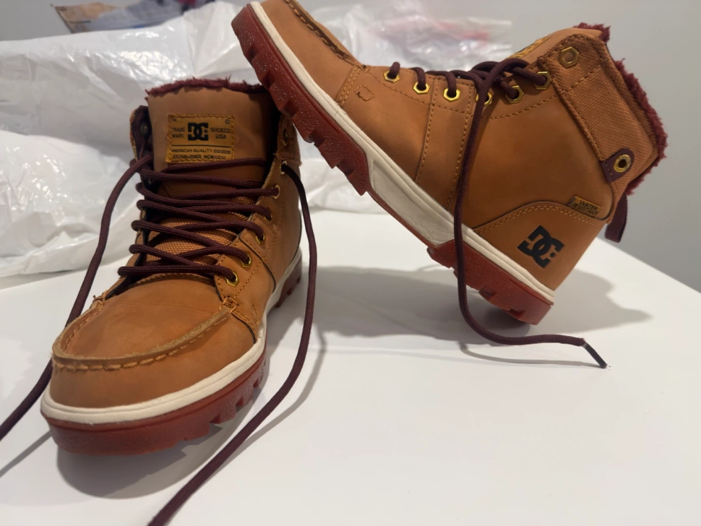 Brown DC Shoes winter boots with water-resistant features. They have a cozy, faux-fur lining for extra warmth. The durable rubber sole provides good traction.