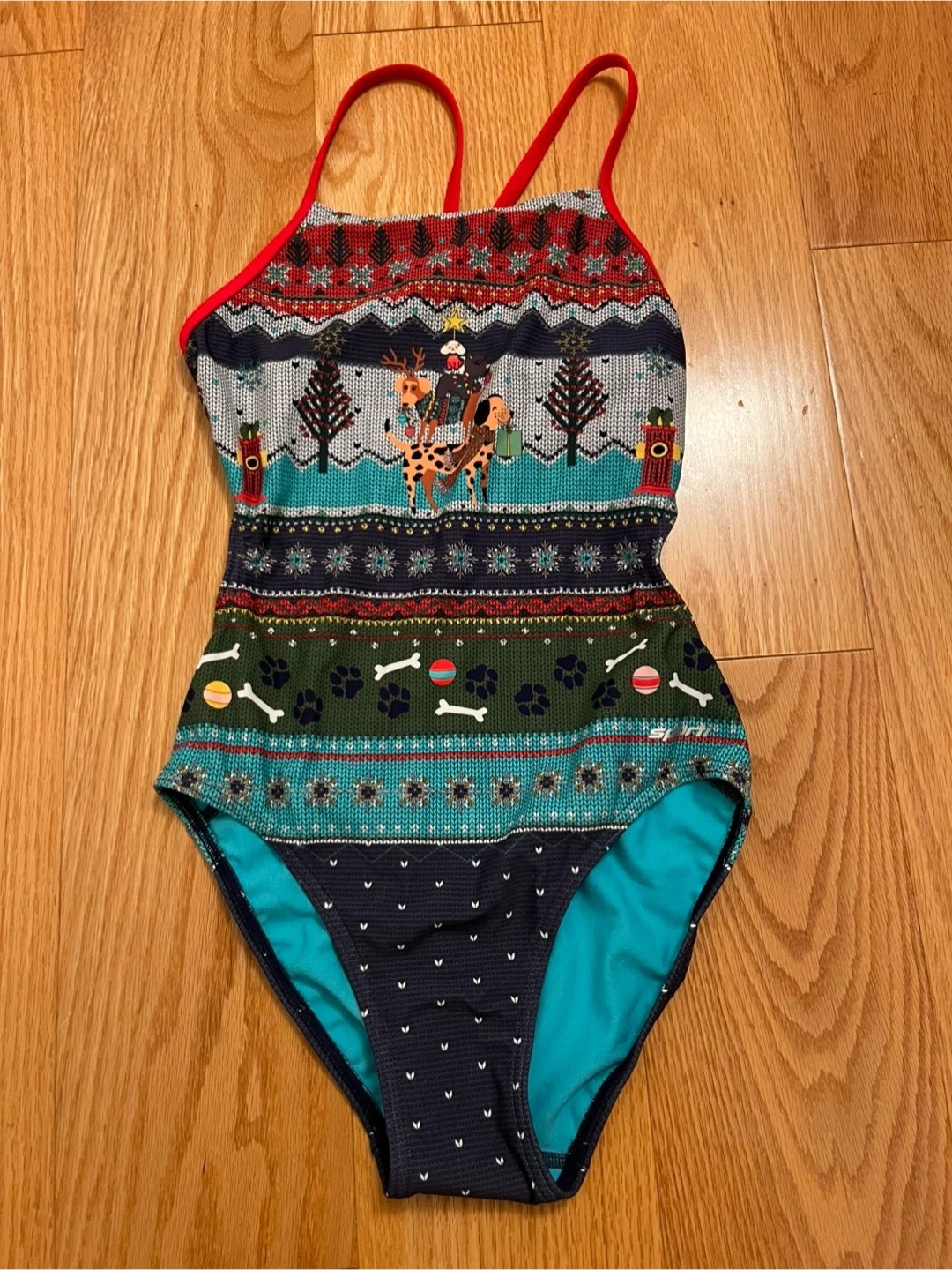This Sporti swimsuit is size 30. It's made from 80% Nylon and 20% Lycra Elastane. The material is double layered 100% Polyester.