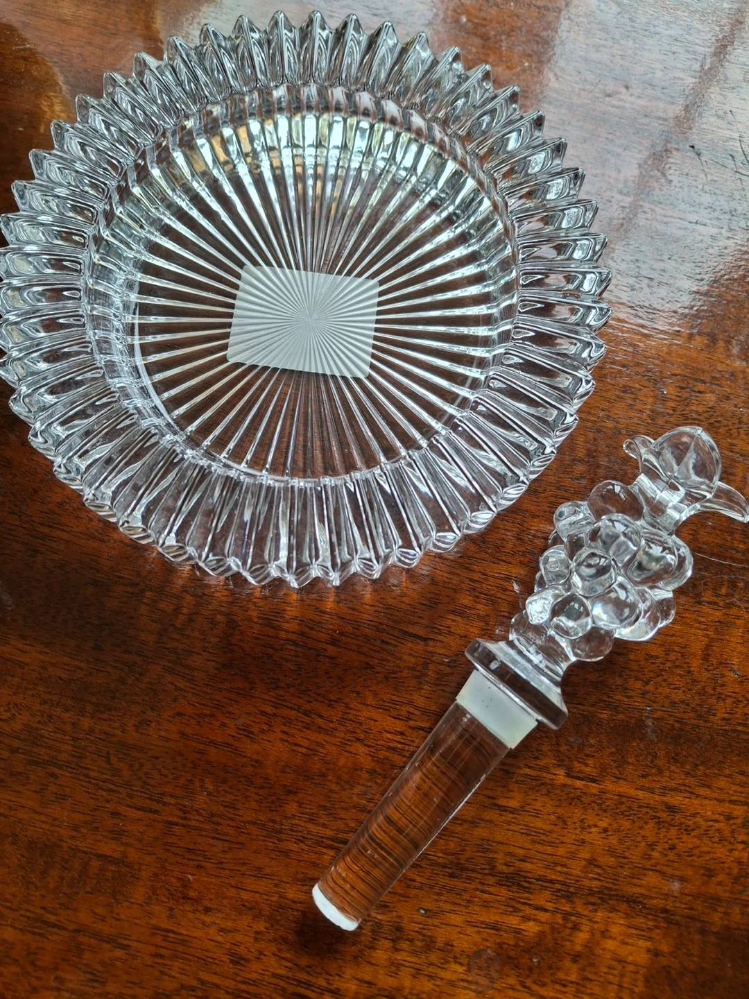 Mikasa Diamond Fire wine set. Includes a ribbed cut wine holder and a grape bottle stopper. Bottle holder still has a sticker (stopper does not). 6” across, 1.25” deep. Stopper is 5.5”.