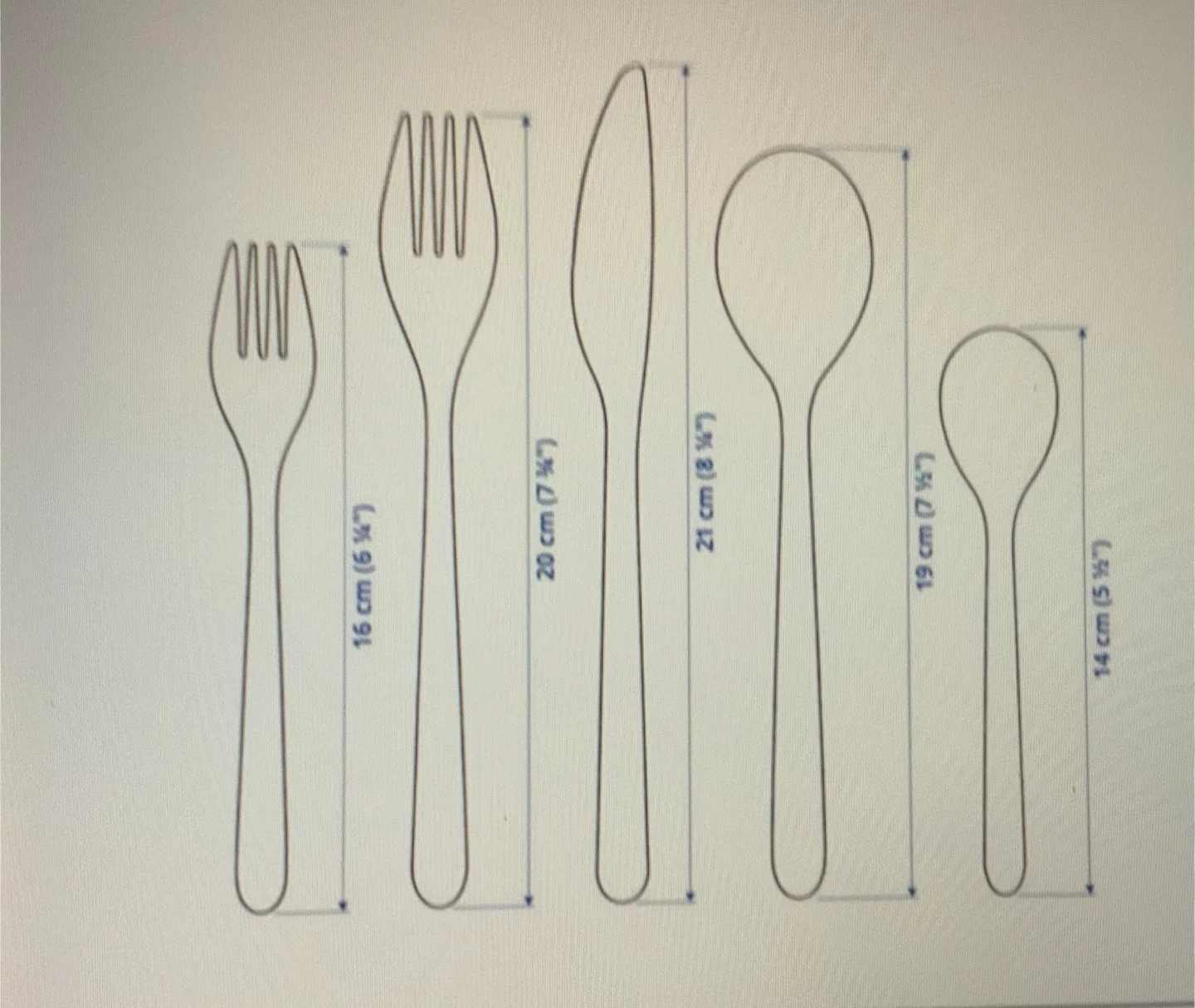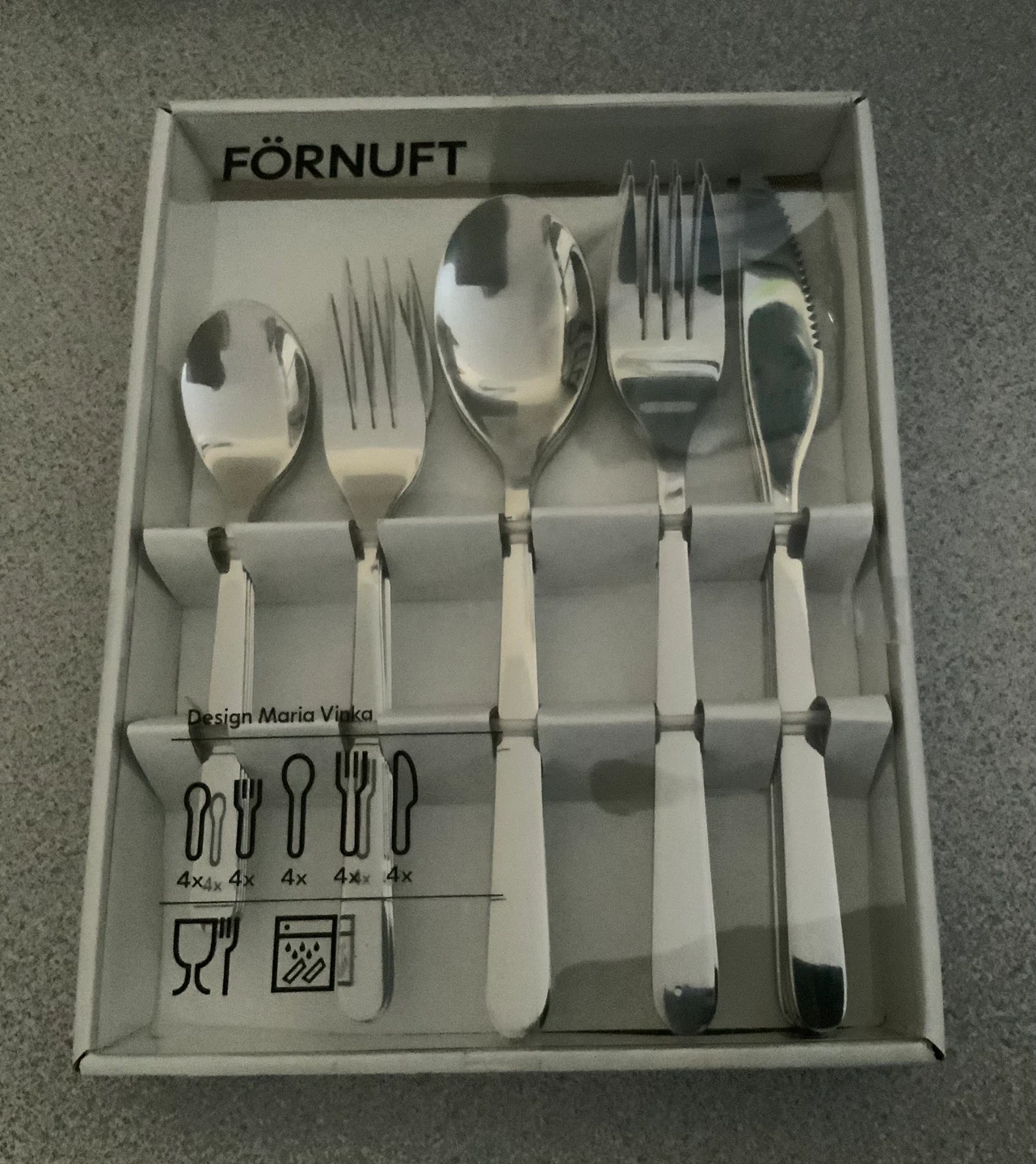 Selling a 20-piece FÖRNUFT cutlery set from IKEA! The set includes 4 forks (16cm), 4 dinner forks (20cm), 4 knives (21cm), 4 spoons (19cm), and 4 teaspoons (14cm). The set is designed by Maria Vinka and comes in its original box Dishwasher Safe