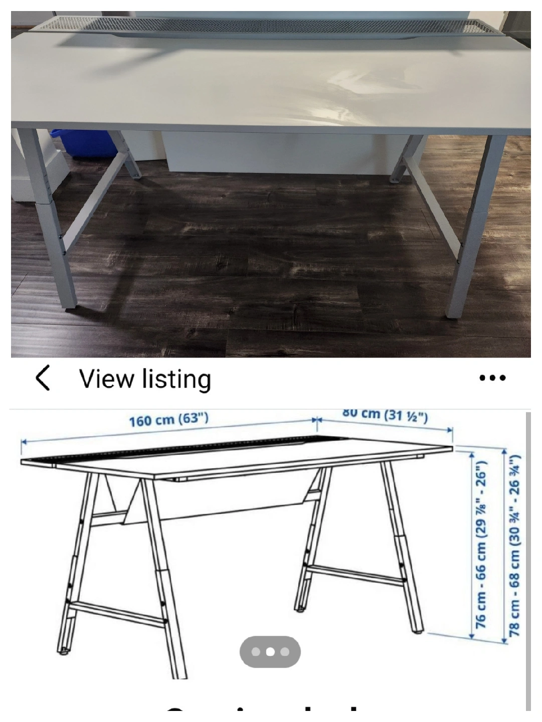 10Selling an IKEA desk in great condition! It's white and has adjustable legs, so you can set it to the perfect height for you. The desk is 160 cm (63 inches) wide and 80 cm (31 1/2 inches) deep. The height can be adjusted from 76 cm to 78 cm (around 30 inches).