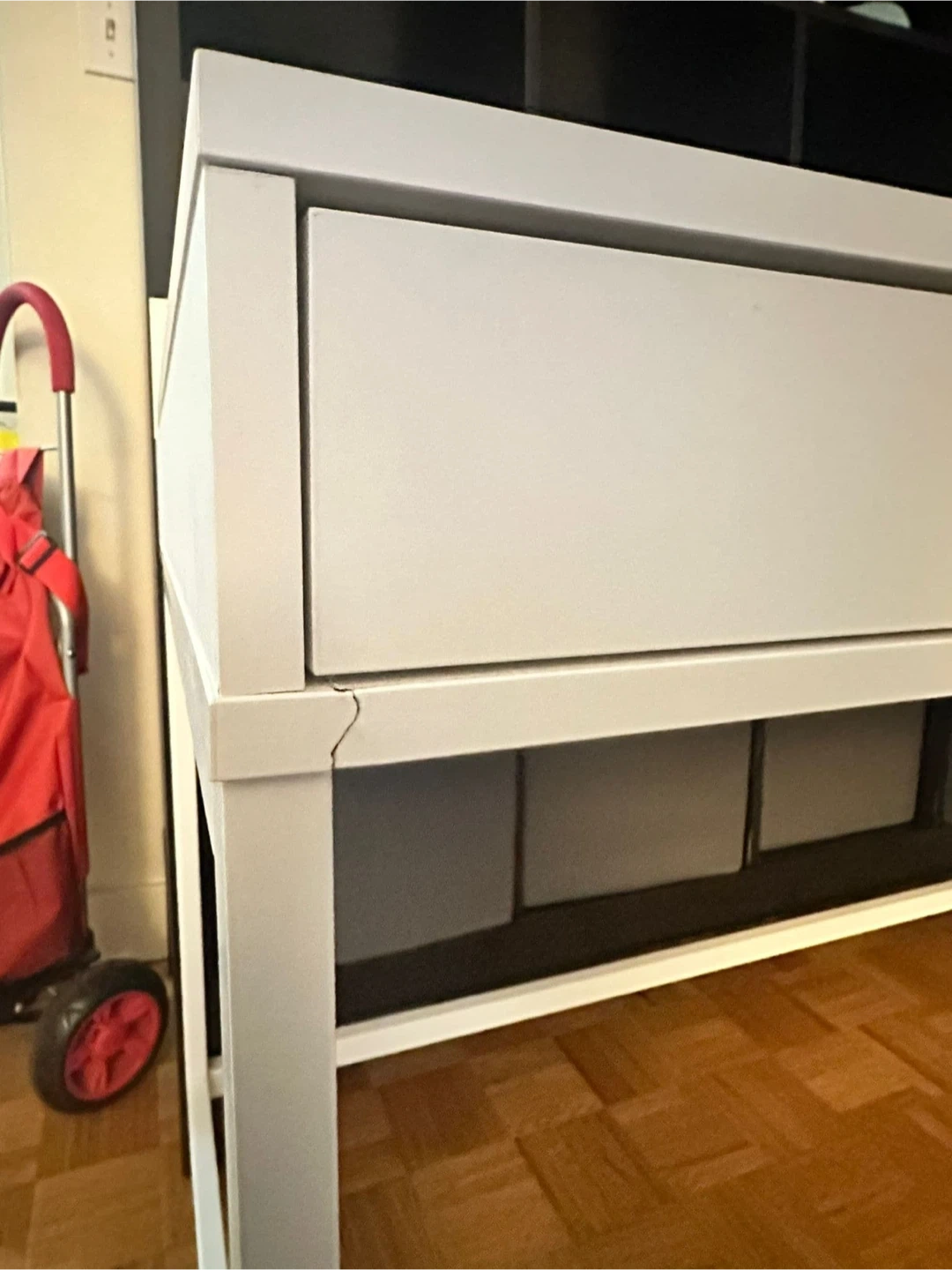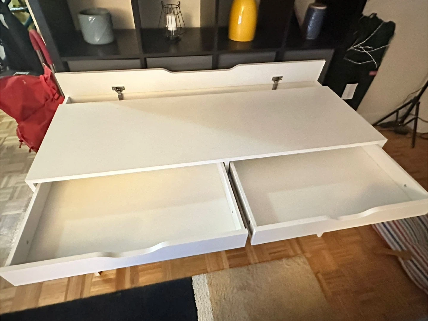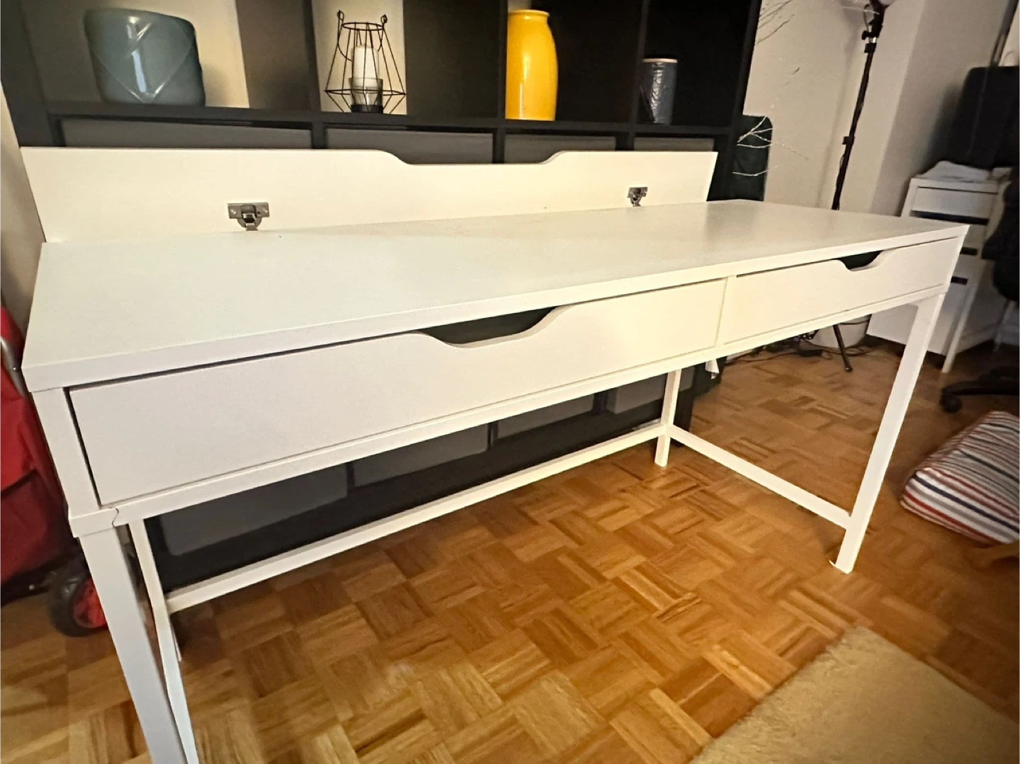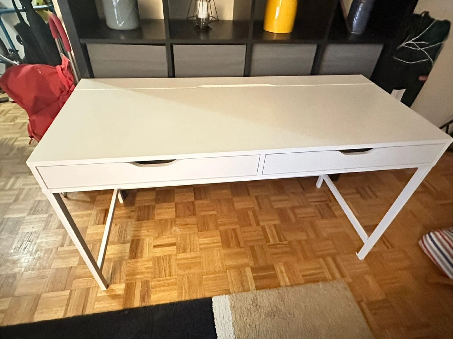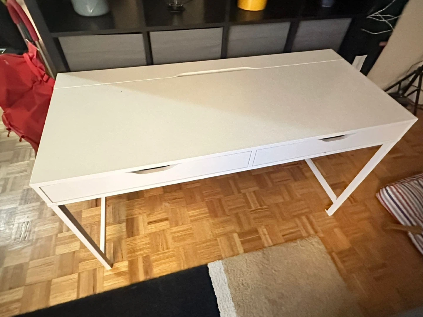 65Selling an IKEA ALEX white desk that has two drawers for storage. There is a small crack on the side of one of the legs, as shown in the pictures, but it doesn’t compromise usage.