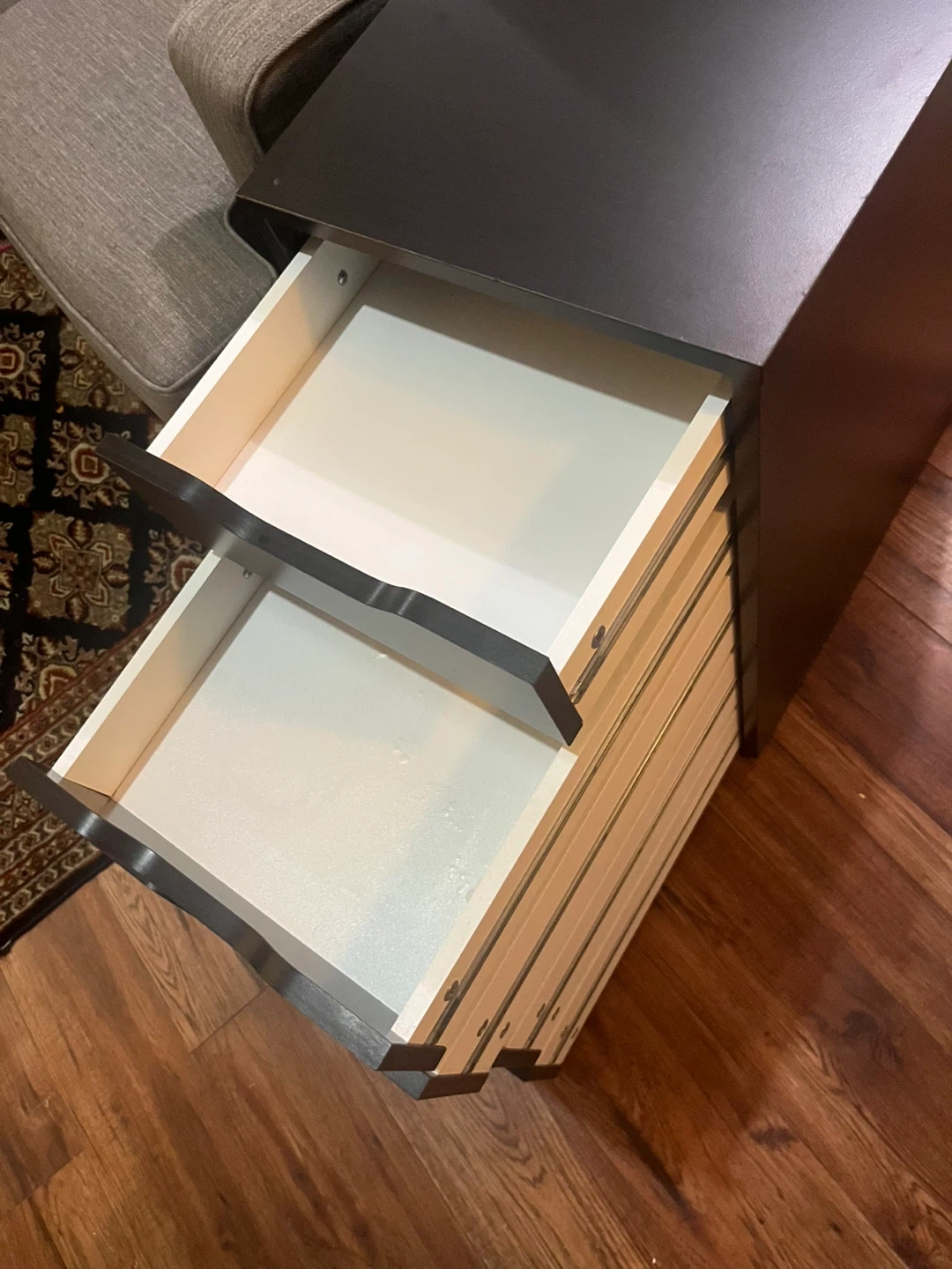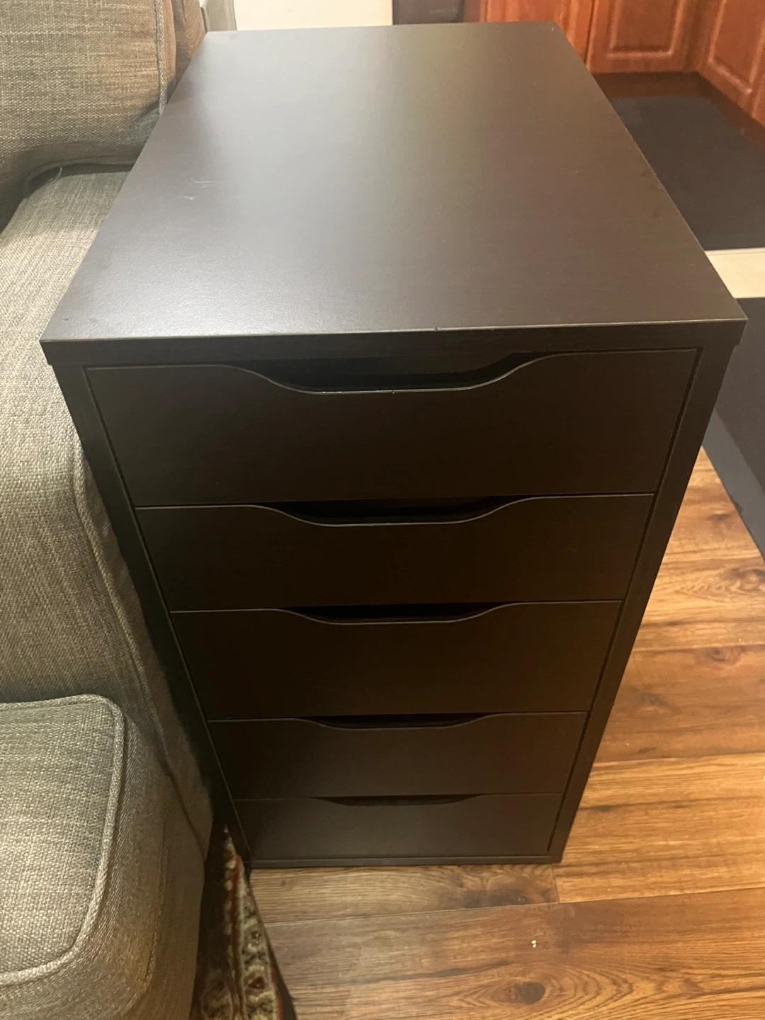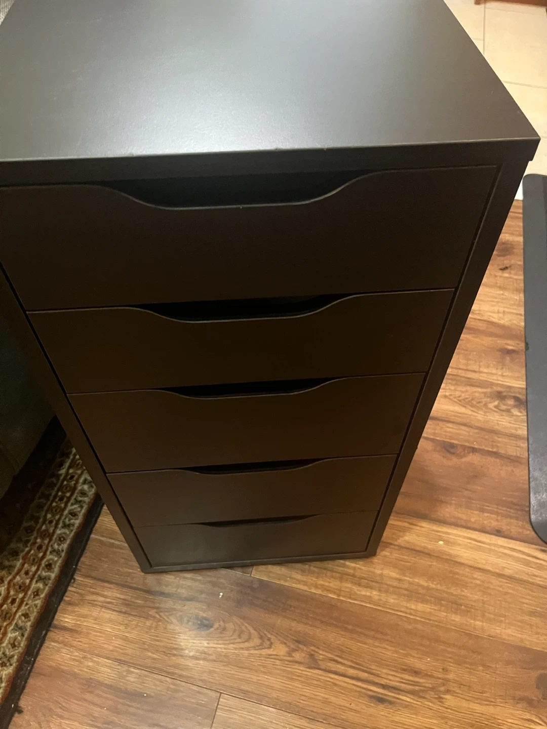 75Selling a used IKEA Alex 5 drawers unit in dark brown. It features five drawers for ample storage. There are some signs of wear in one drawer which is shown in the picture , but overall it's in good condition and ready for a new home! Perfect for organizing your workspace or bedroom