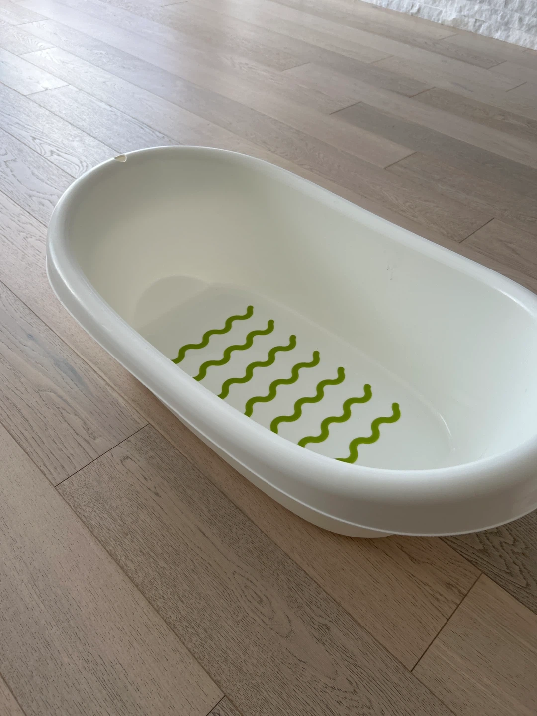 Selling a baby bathtub in great condition! It's white with a green grip pattern on the bottom to help keep your little one from slipping. There's a small chip on the rim, as shown in the photos, but it doesn't affect the tub's functionality at all. Perfect for babies and toddlers!