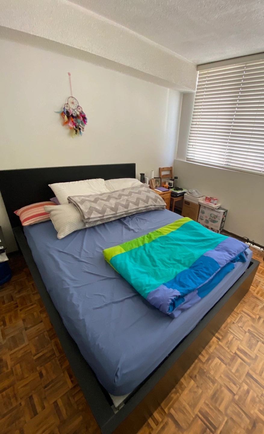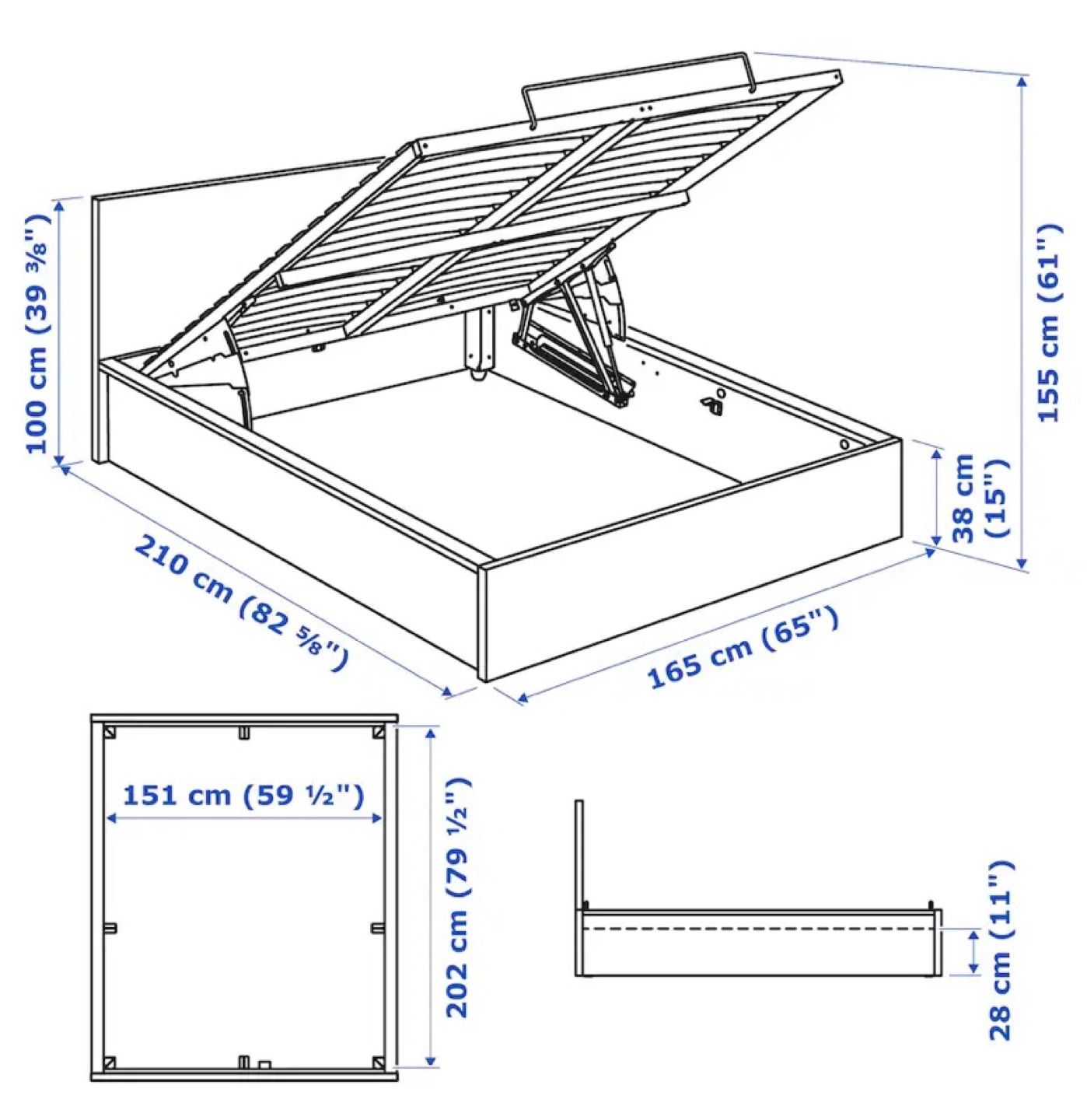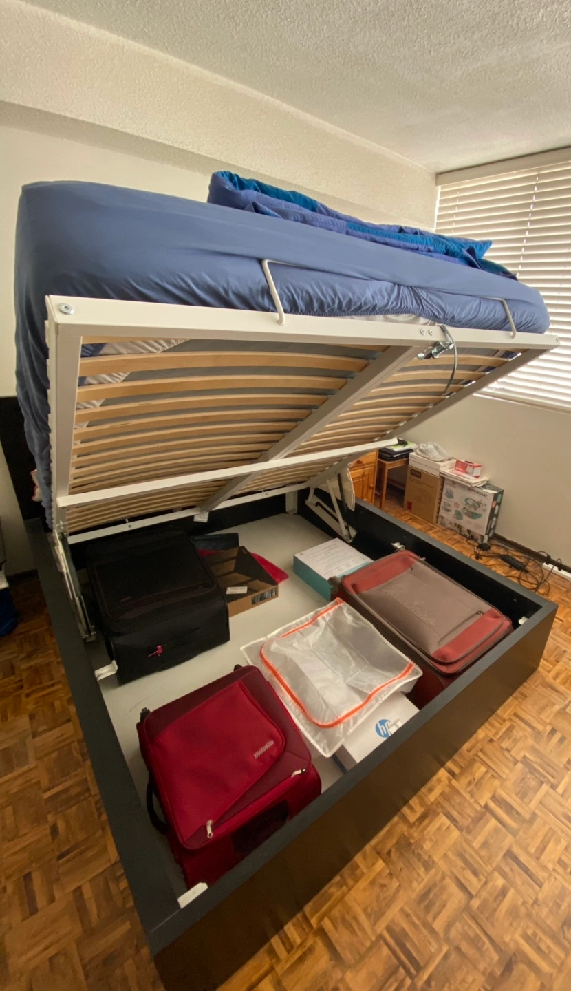 Queen bed frame with pull up storage. Black. Includes slatted bed base.