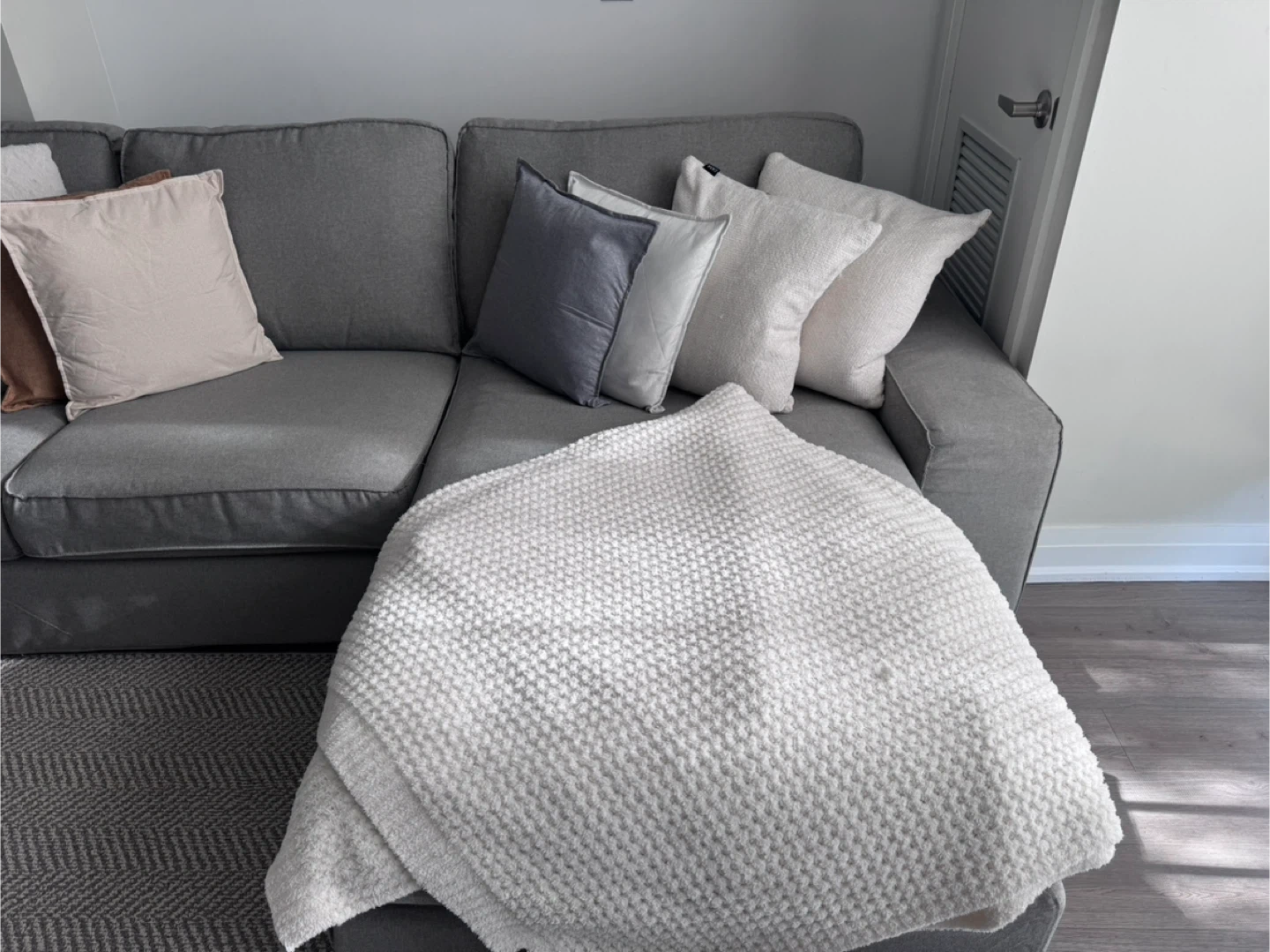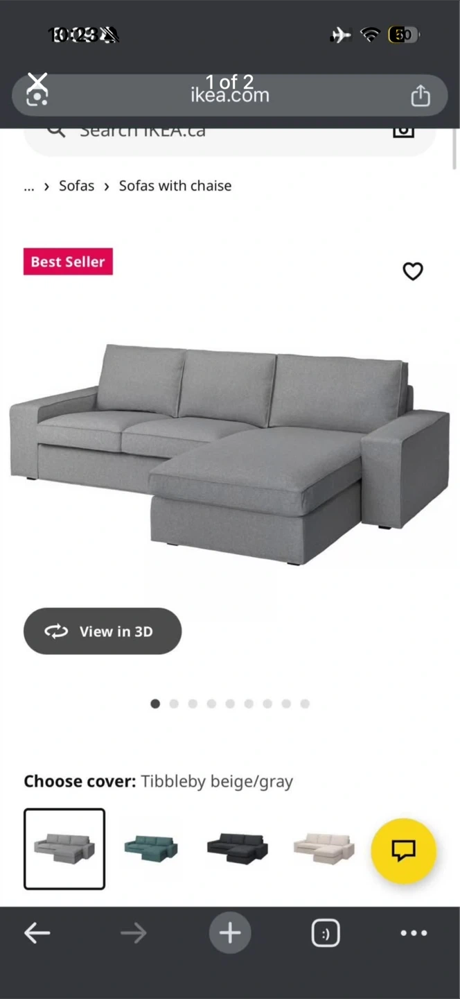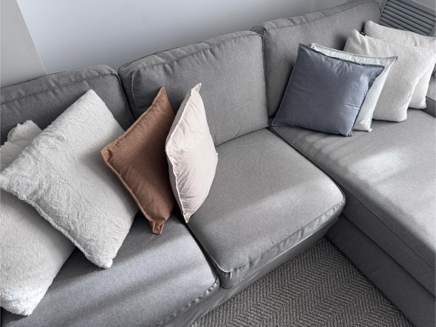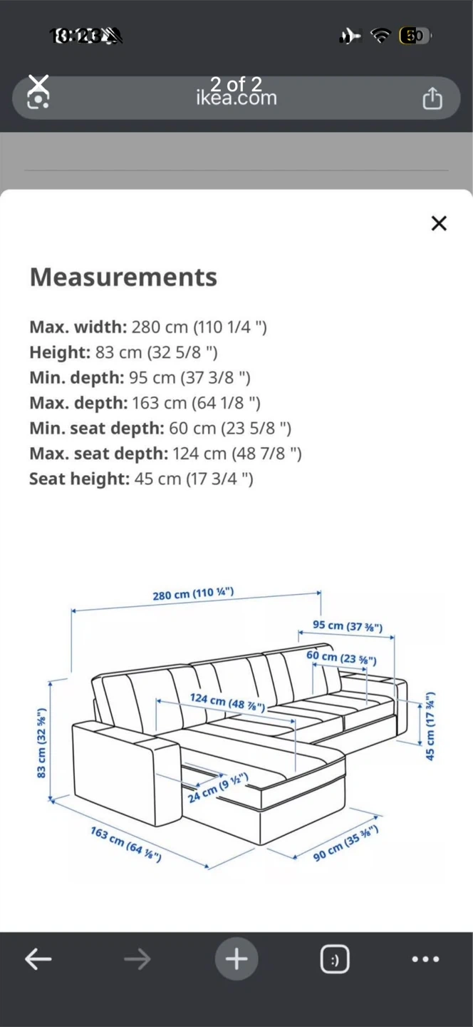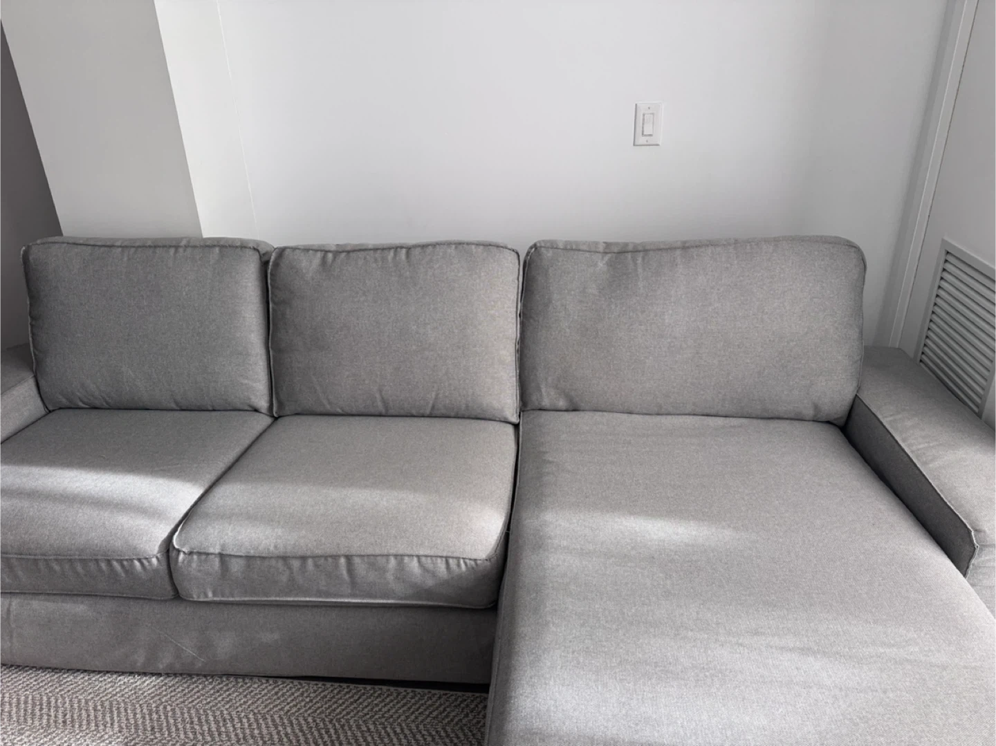 10Selling a comfy IKEA sofa with a chaise in Tibbleby beige/gray! It's in great shape and ready for a new home. Measurements: - Max width: 280 cm (110 1/4 ") - Height: 83 cm (32 5/8 ") - Min depth: 95 cm (37 3/8 ") - Max depth: 163 cm (64 1/8 ") - Min seat depth: 60 cm (23 5/8 ") - Max seat depth: 124 cm (48 7/8 ") - Seat height: 45 cm (17 3/4 ")