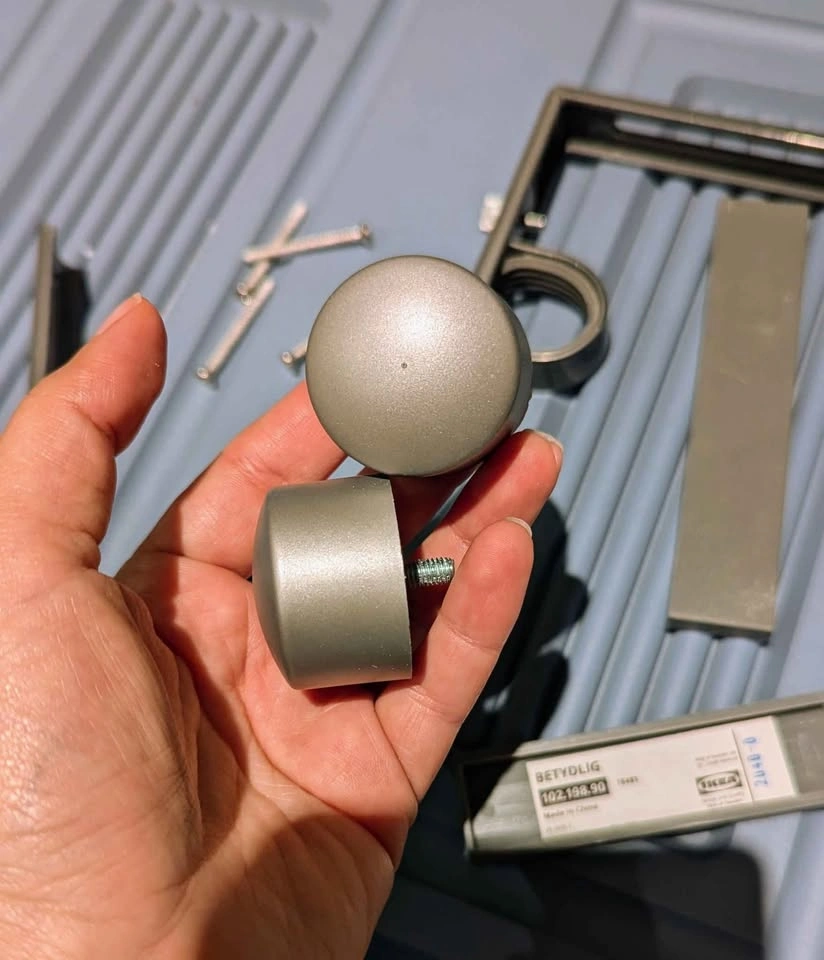 Set of IKEA BETYDLIG curtain rod brackets with matching rod end caps (finials) with silver/gray finish. Adjustable metal brackets fits most curtain rods. Includes screws and mounting hardware (as shown).