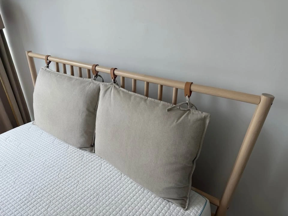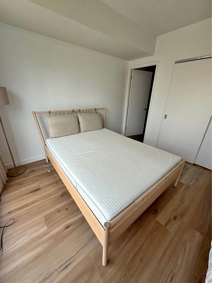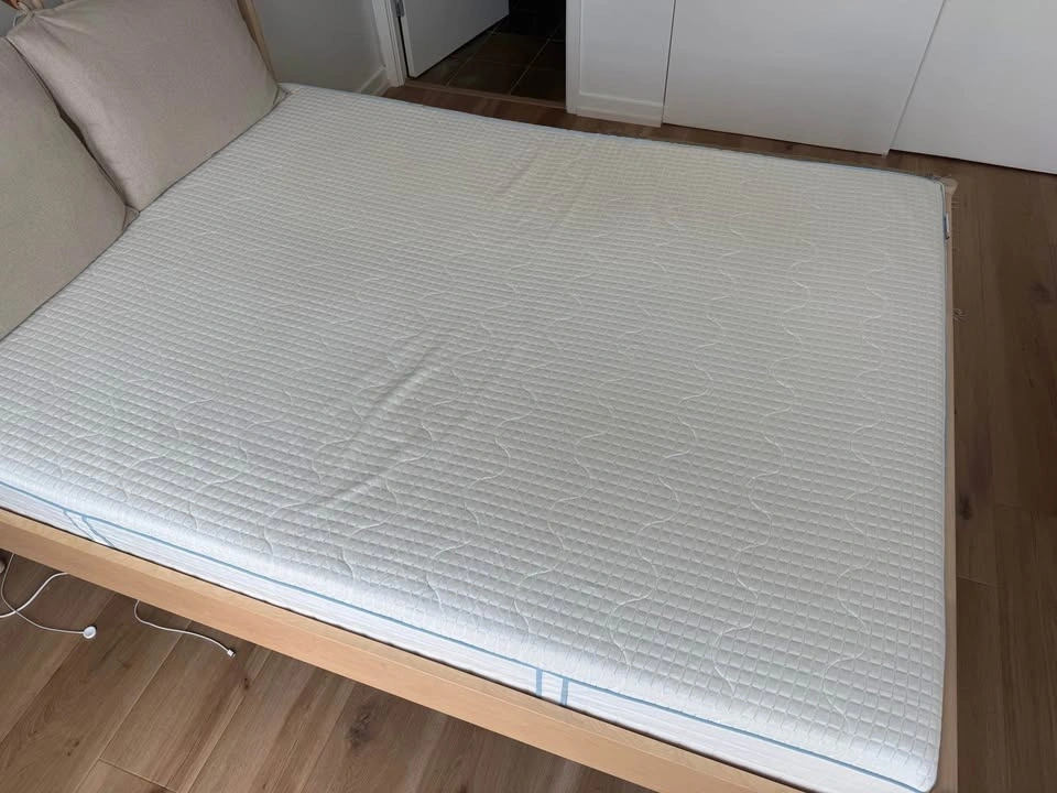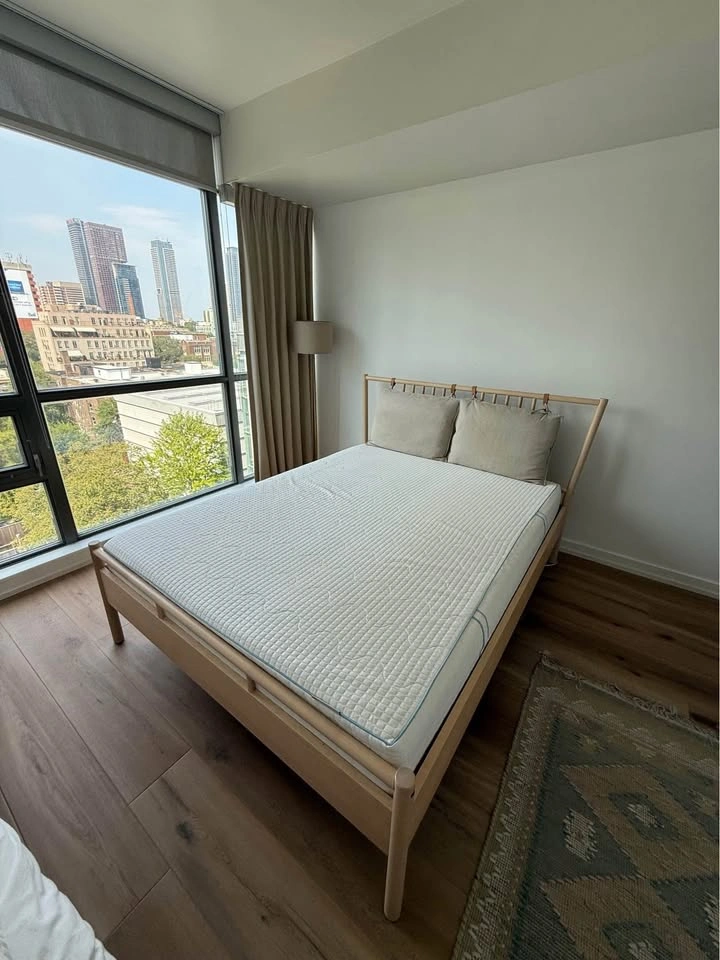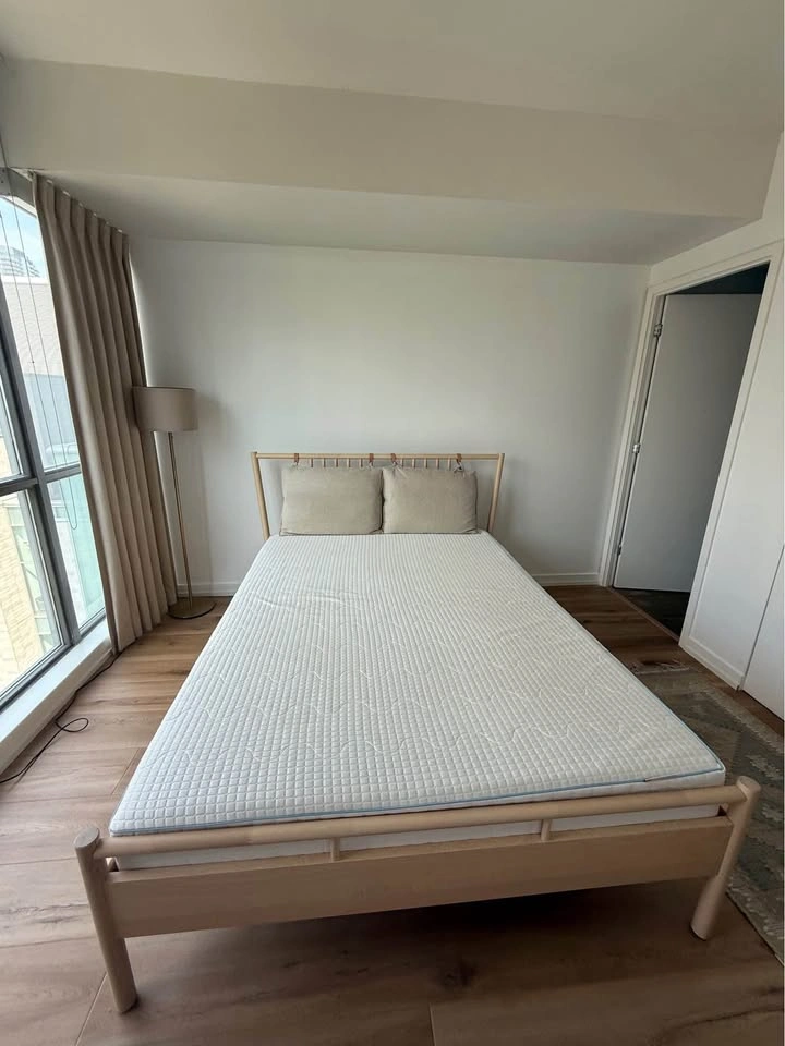 78Lightly Used - IKEA BJÖRKSNÄS Queen Bed Frame (Light Wood) & IKEA ÄMSOSEN Memory Foam Mattress Included (only selling all as one unit). The bed is a light wood frame, with two detachable headboard cushions with leather straps. Included is a clean and very comfortable Queen IKEA AMSOSEN memory foam mattress. Both the bed and mattress are less than 18 months old. The bed also comes with the two natural-toned cushions that attach/detach to the headboard. Both the frame and mattress are in excellent, lightly used condition. We used it in our primary bedroom, and the mattress is super comfortable! Link to the IKEA website for the bed frame, mattress no longer sold at IKEA. You will need to dismantle the bed to take it out of our apartment. https://www.ikea.com/ca/en/p/bjoerksnaes-bed-frame-birch-birch-veneer-s19501714/?utm_source=google&utm_medium=organic-shopping&utm_campaign=shopping_feed&utm_content=free_google_shopping_clicks_BedsMattresses&gad_source=1&gad_campaignid=21671878207&gbraid=0AAAAACqC6Erq5VZpb3xf5D0GBj1V-__Et&gclid=Cj0KCQjwtMHEBhC-ARIsABua5iTHwX1nJwO47jY4S56NK9SFHSPaD2T0iiKMG7ivq5Kk3rZWSxaJkmIaAh5dEALw_wcB