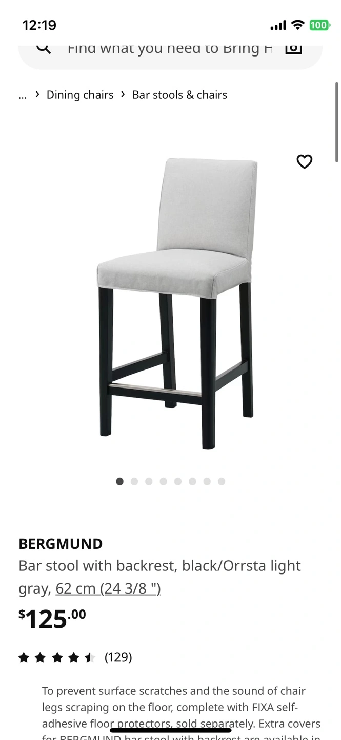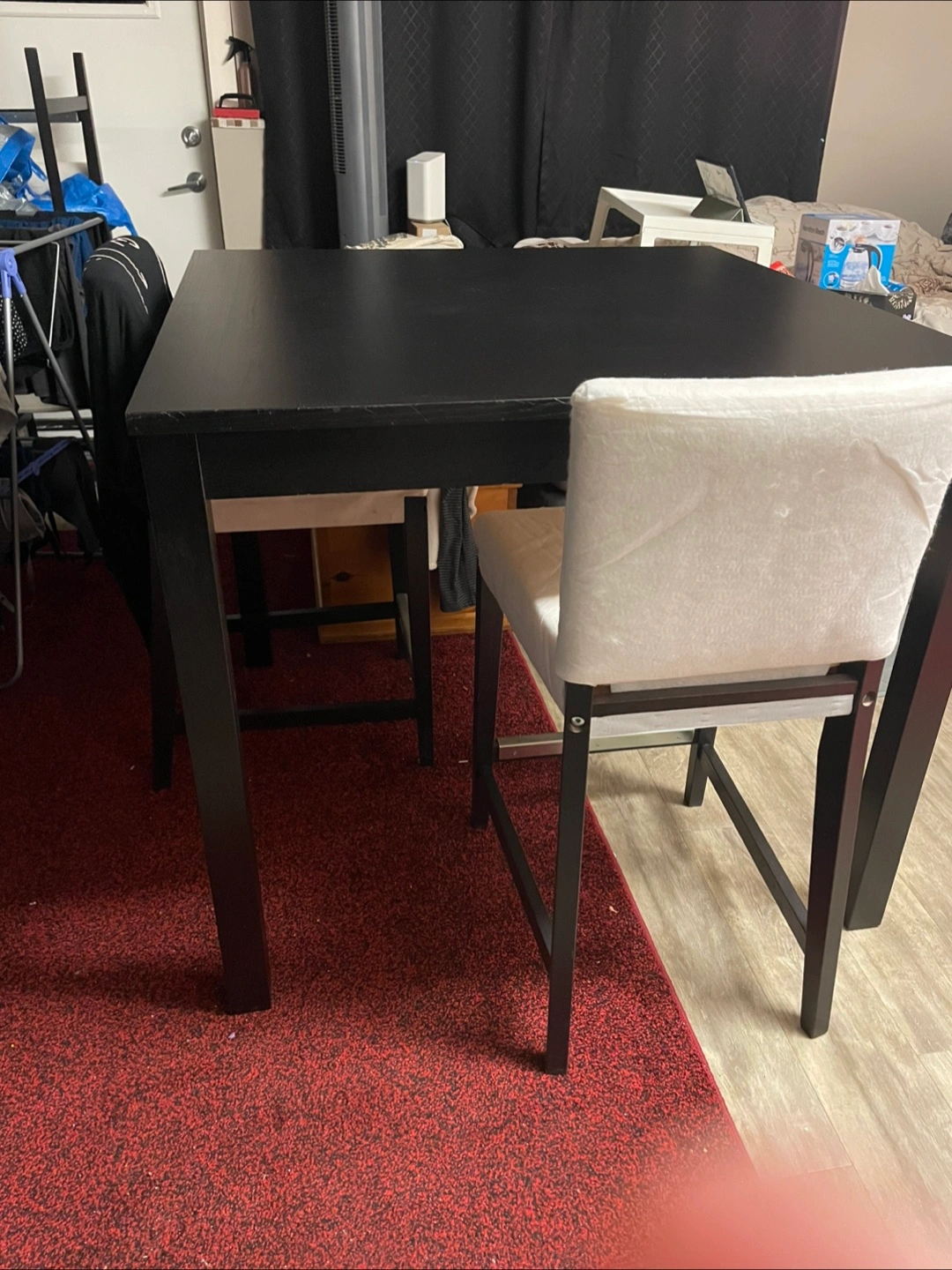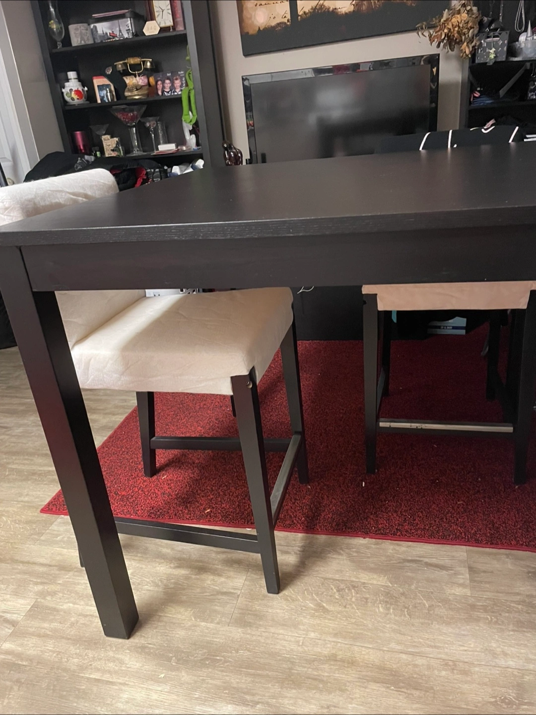Black bar top dining table very durable easy to assemble plus 4 IKEA Bergmund bar stool with a high backrest . It measures 62 cm (24 3/8 "). The stools are in good condition and table used but in good condition a few scraps here and they but can be touched up from smoke/pet free home pick up only will need a truck most likely only serious inquiries please