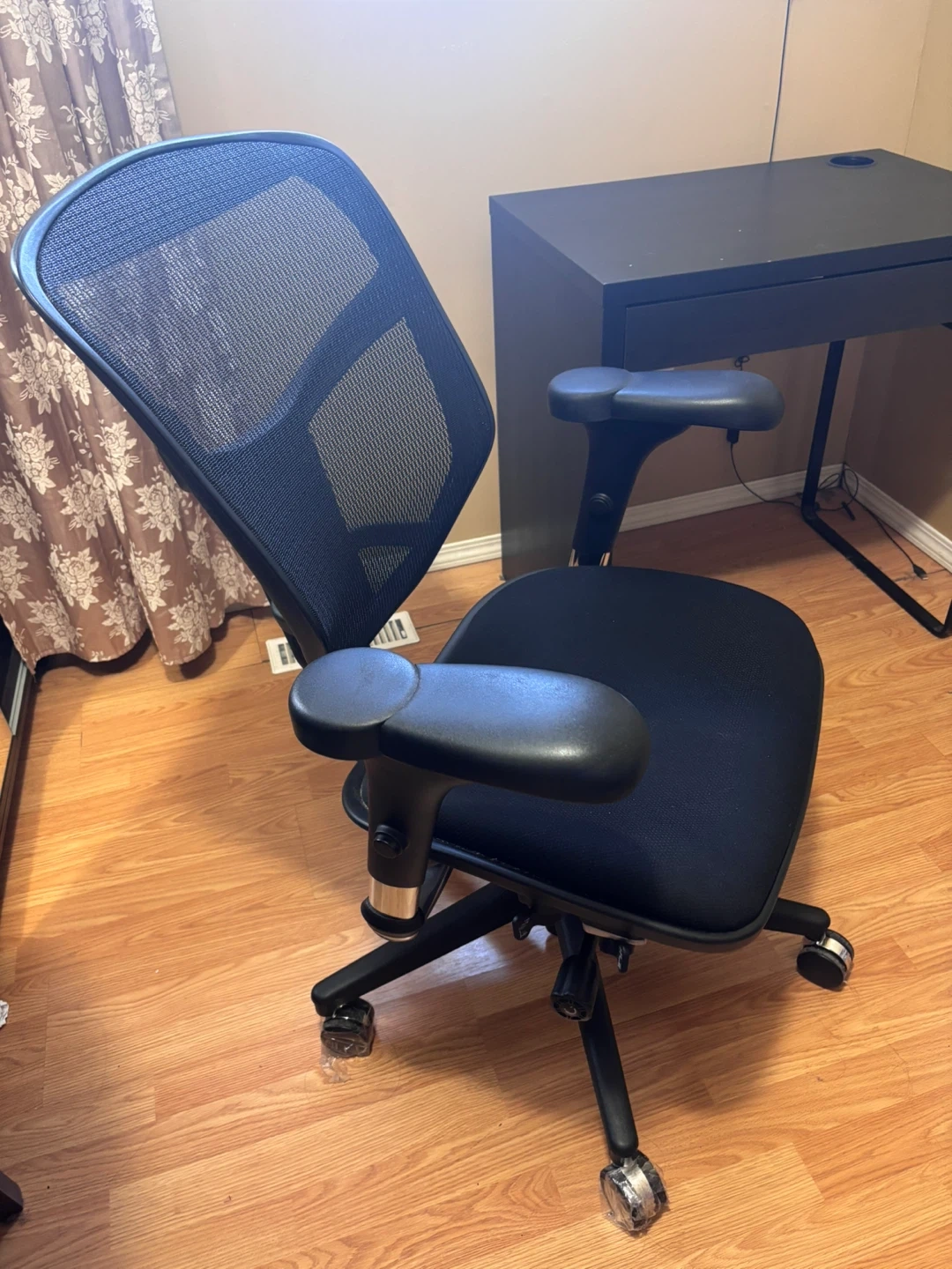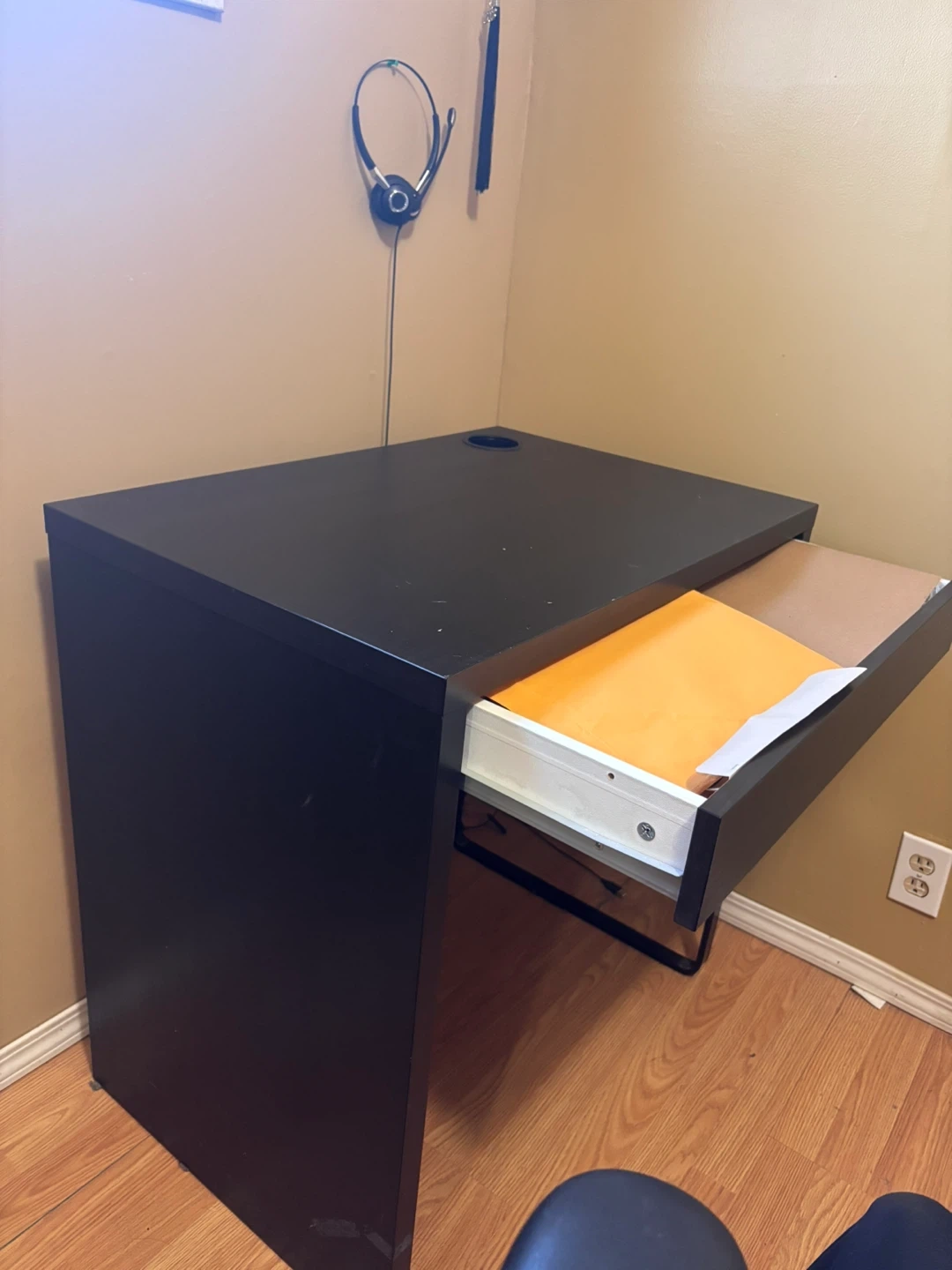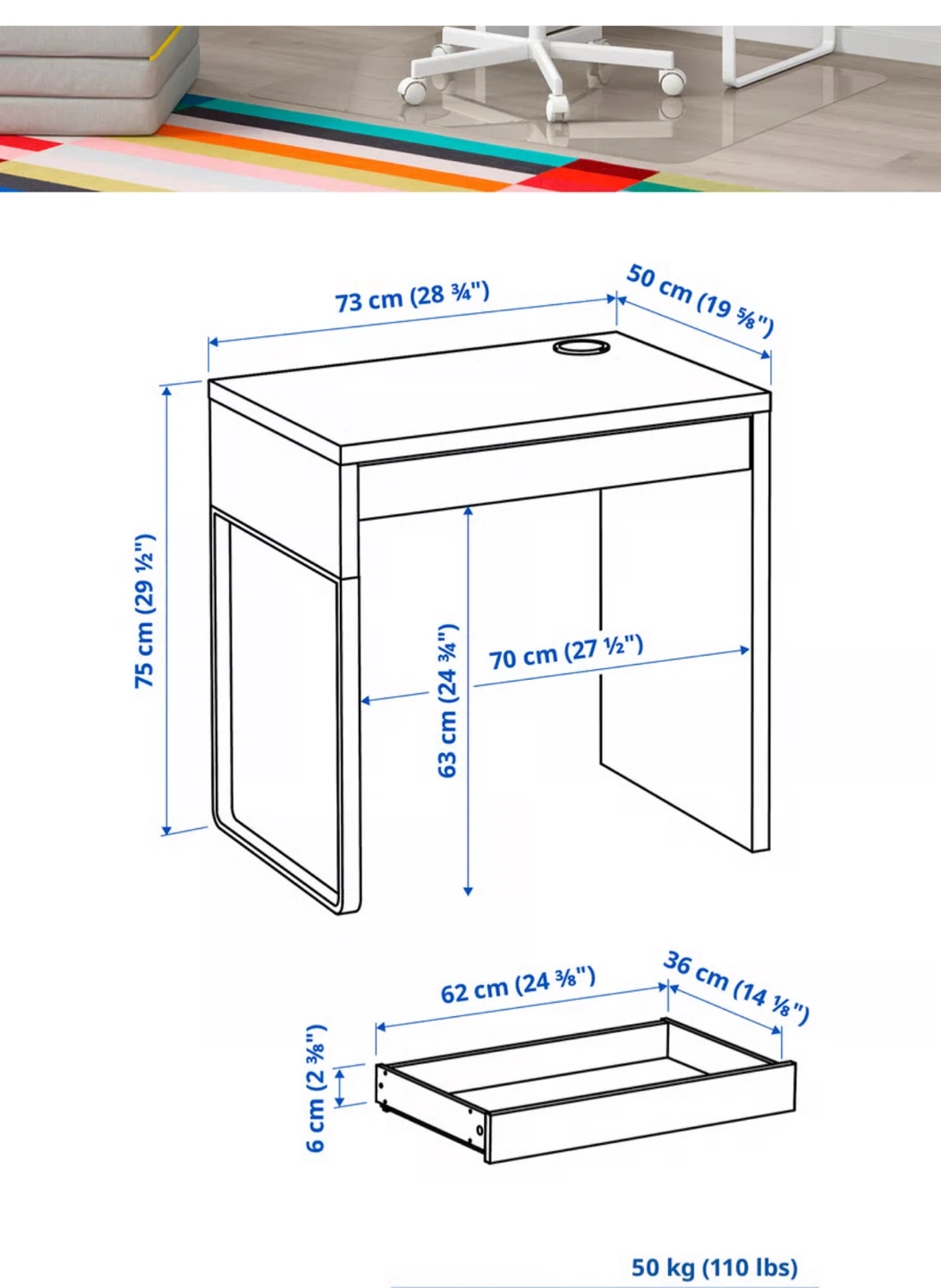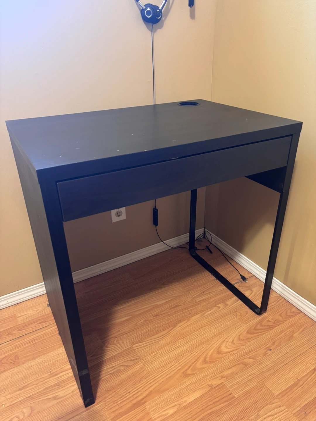 10Selling a black desk from IKEA. It's in great shape and ready for a new home. The desk has a sleek design and includes a drawer for storage. Dimensions are approximately 73cm wide, 50cm deep, and 75cm high The chair is very comfortable and can be fully reclining option. can be bought separately. Table:50$ chair:70$