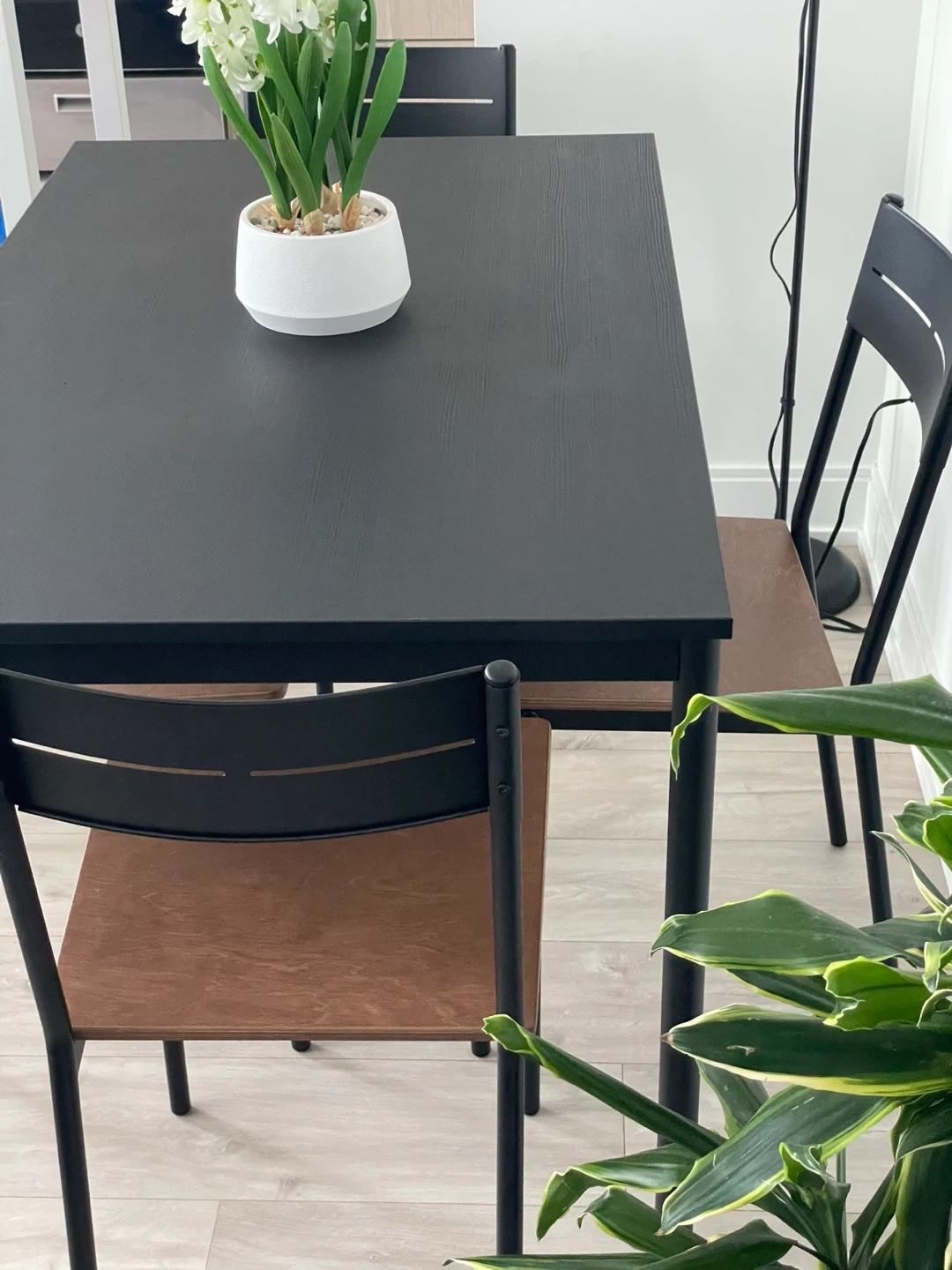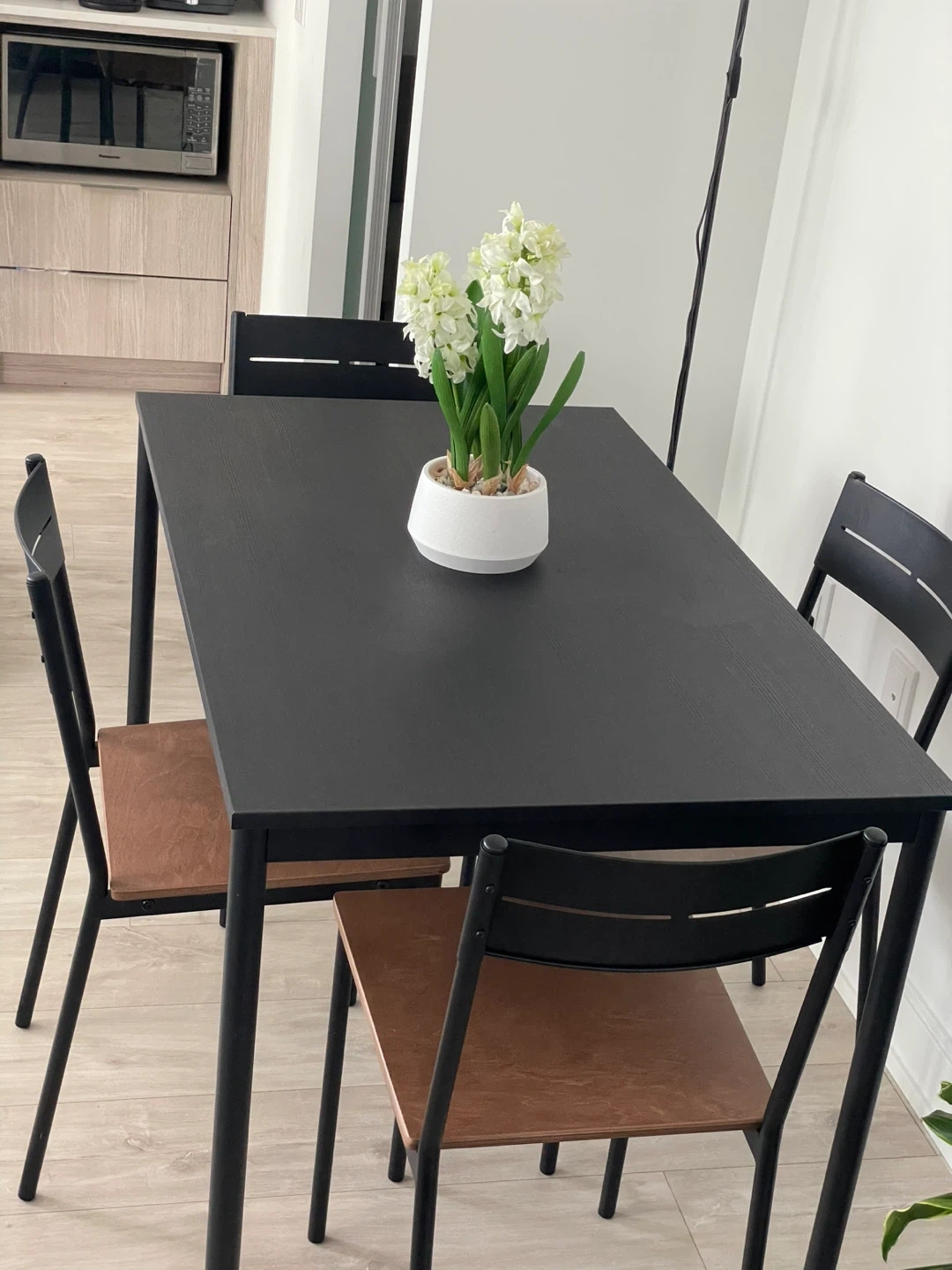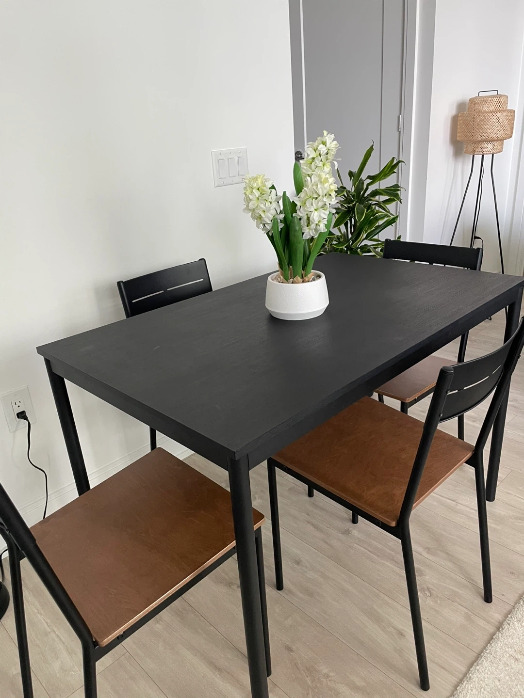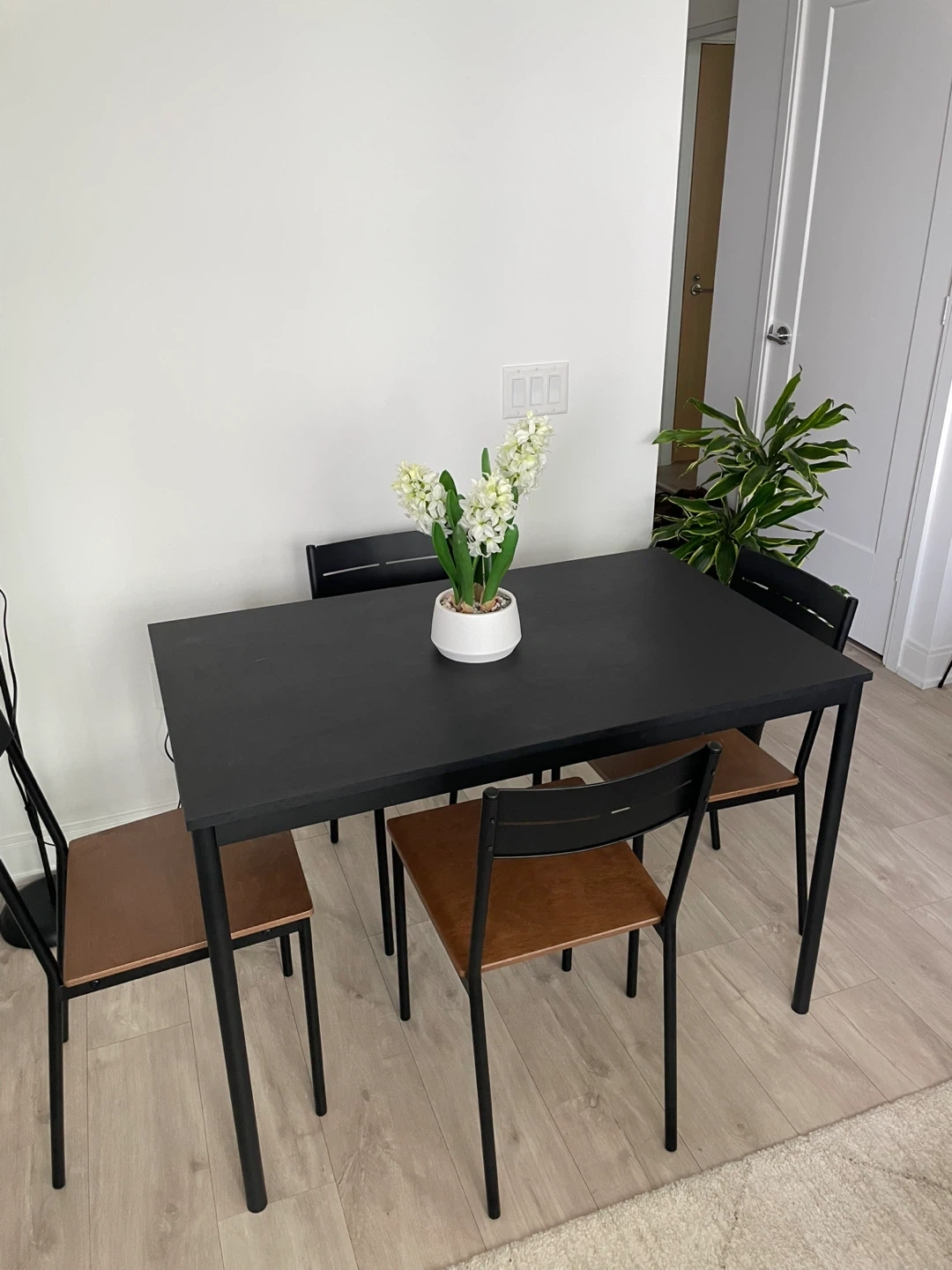 Selling a stylish IKEA black dining table set with 4 matching chairs in like-new condition, purchased in December 2024. This set is perfect for condos, apartments, or smaller dining spaces — offering a sleek and modern look while being practical and durable. • Sturdy black dining table with smooth finish • Set includes 4 matching chairs with comfortable seating • Easy to clean and maintain • Perfect for kitchen, dining room, or open-plan areas • Gently used in a smoke-free, pet-free home ️ Details: • Brand: IKEA • Condition: Like new • Purchased: December 2024 • Original price: $260 Payment accepted: Cash in person or e-transfer on pickup day