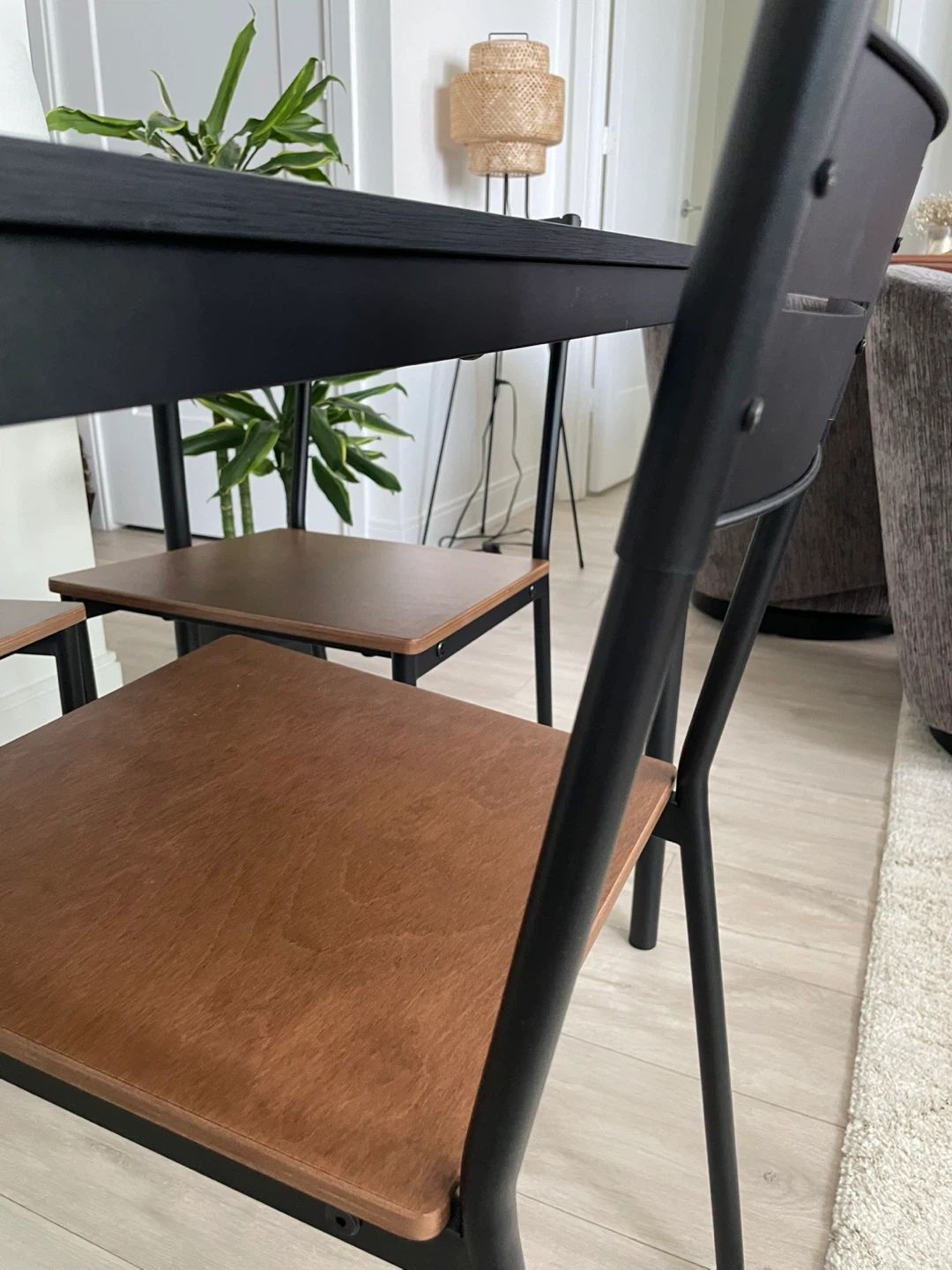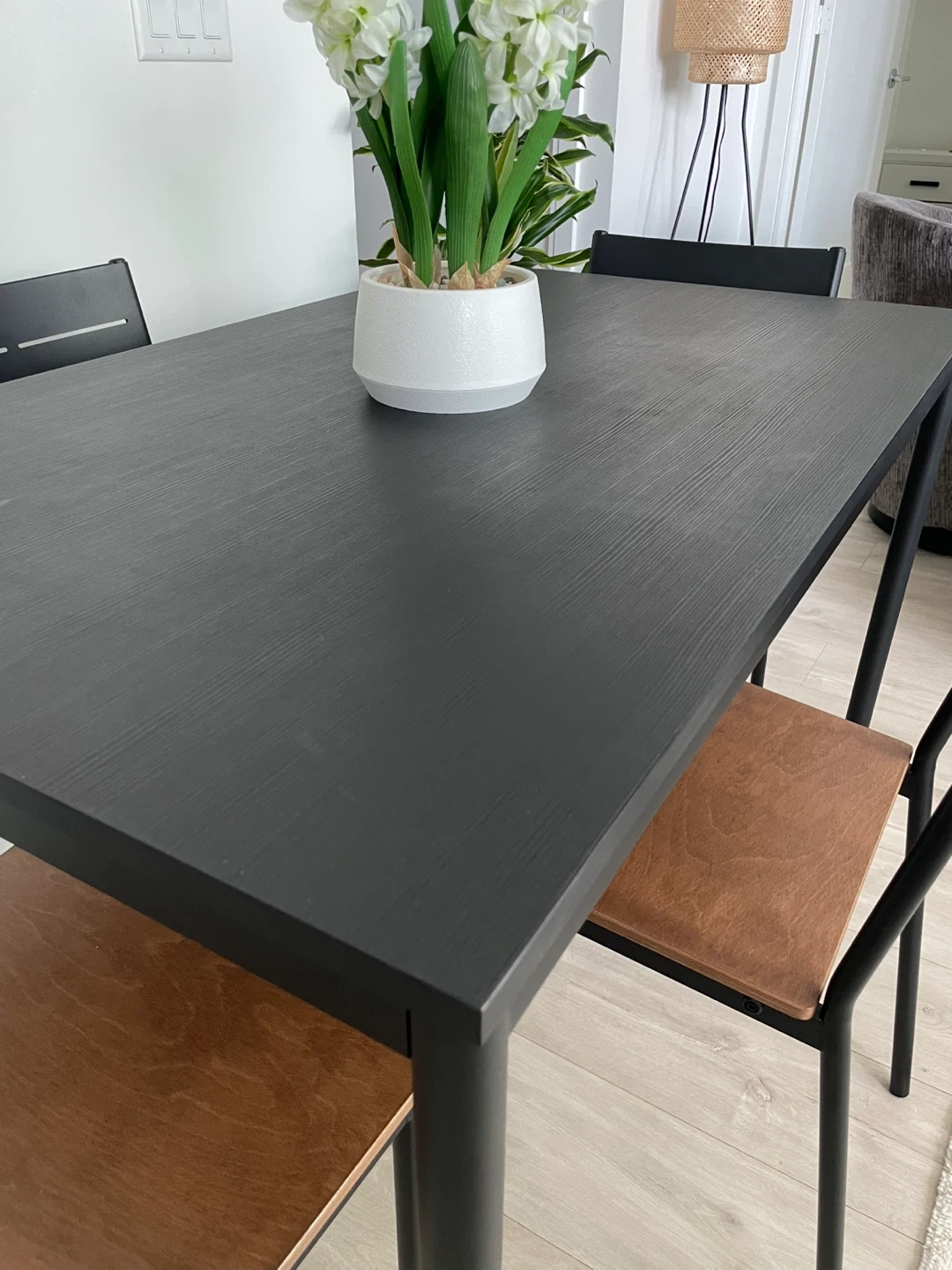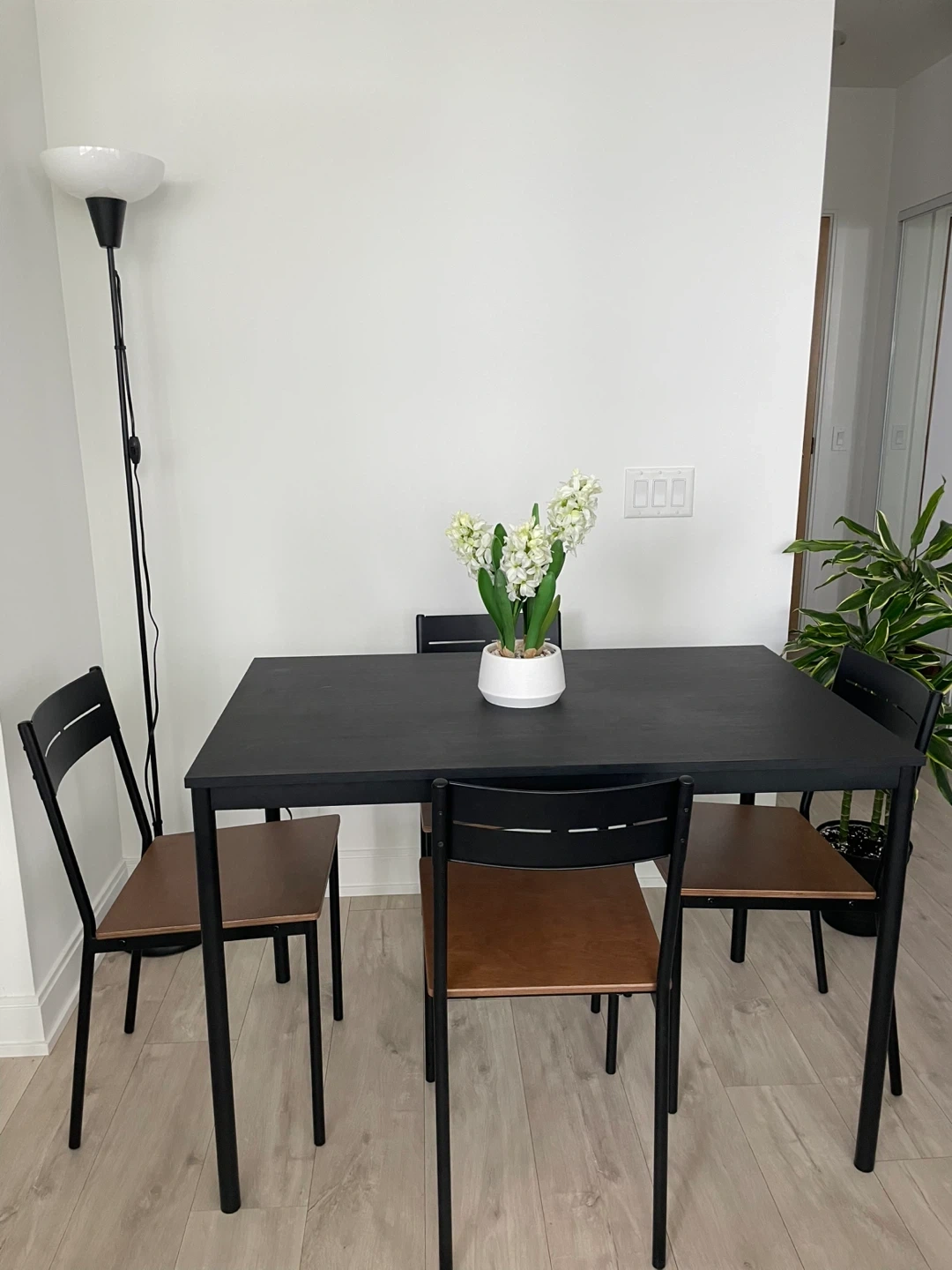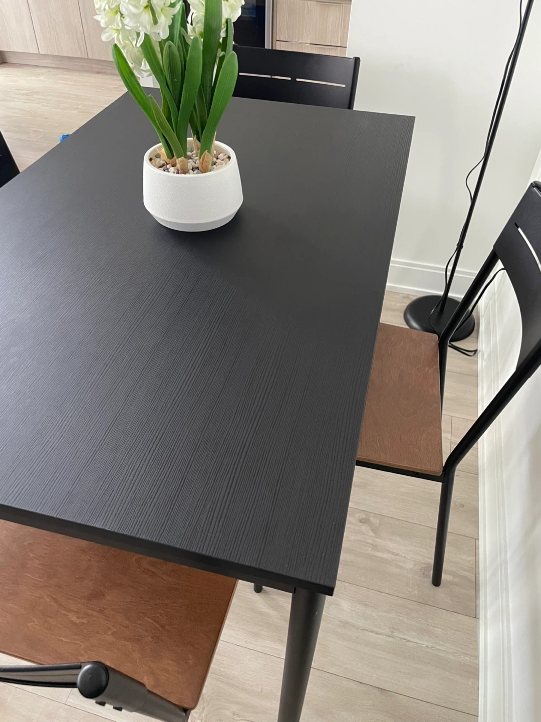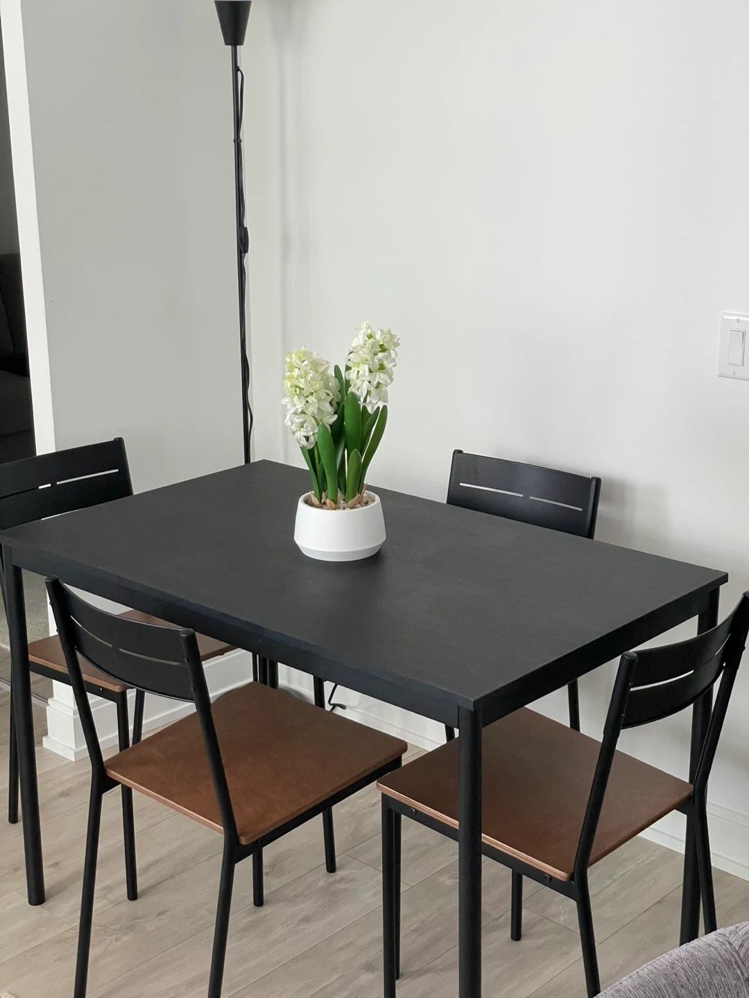 Selling a stylish IKEA black dining table set with 4 matching chairs in like-new condition, purchased in December 2024. This set is perfect for condos, apartments, or smaller dining spaces — offering a sleek and modern look while being practical and durable. • Sturdy black dining table with smooth finish • Set includes 4 matching chairs with comfortable seating • Easy to clean and maintain • Perfect for kitchen, dining room, or open-plan areas • Gently used in a smoke-free, pet-free home ️ Details: • Brand: IKEA • Condition: Like new • Purchased: December 2024 • Original price: $260 Payment accepted: Cash in person or e-transfer on pickup day
