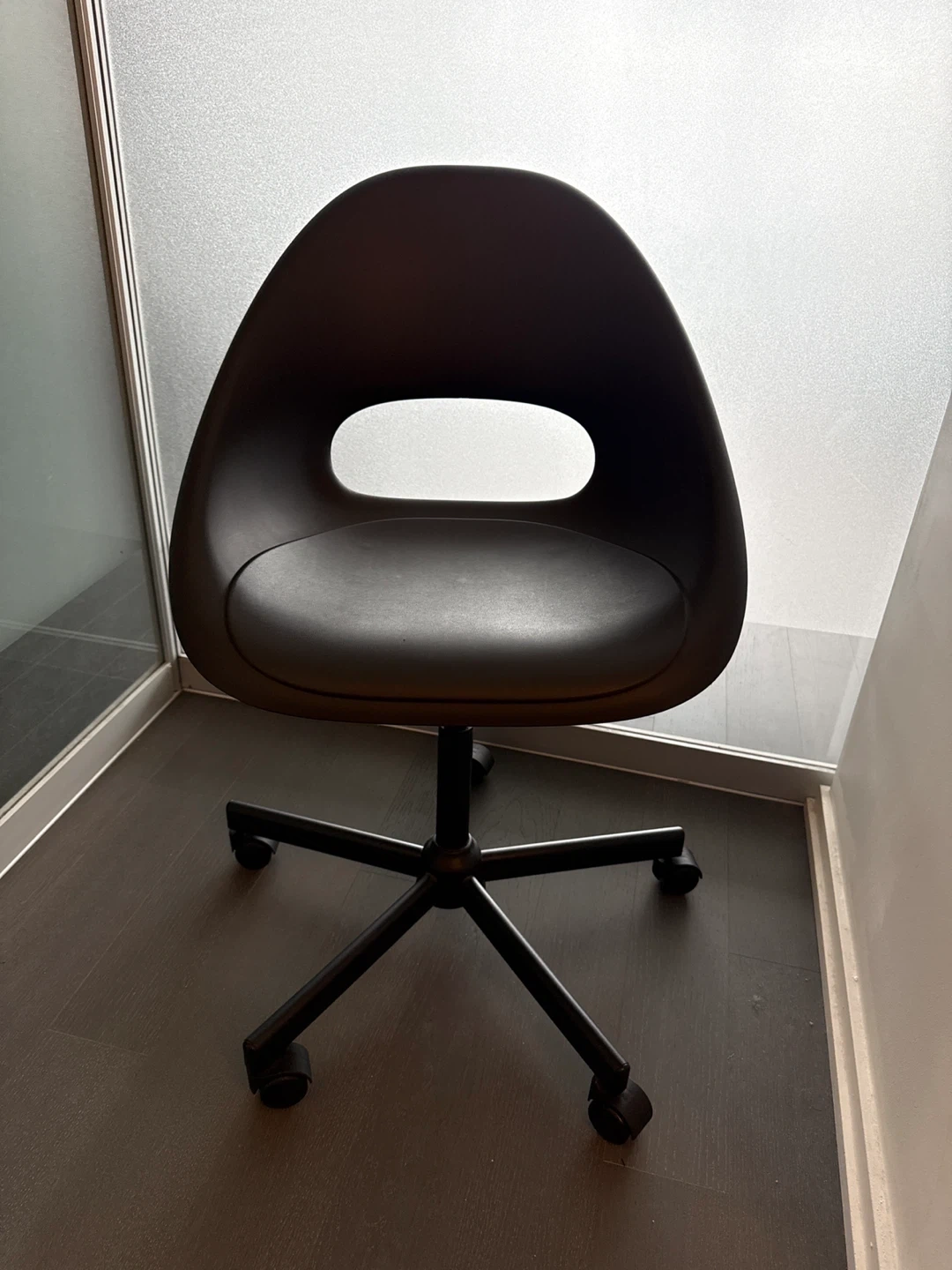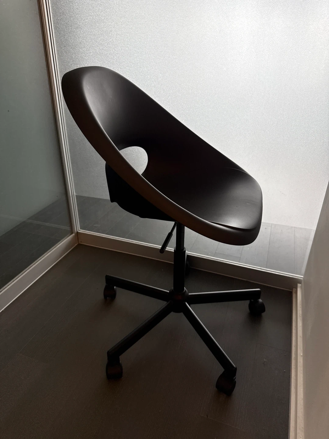 I'm selling a comfy black IKEA swivel chair! It's in great shape and perfect for a home office or study space. The chair has a unique design with a hole in the back, and it rolls smoothly on its wheels. It's a great addition to any room!