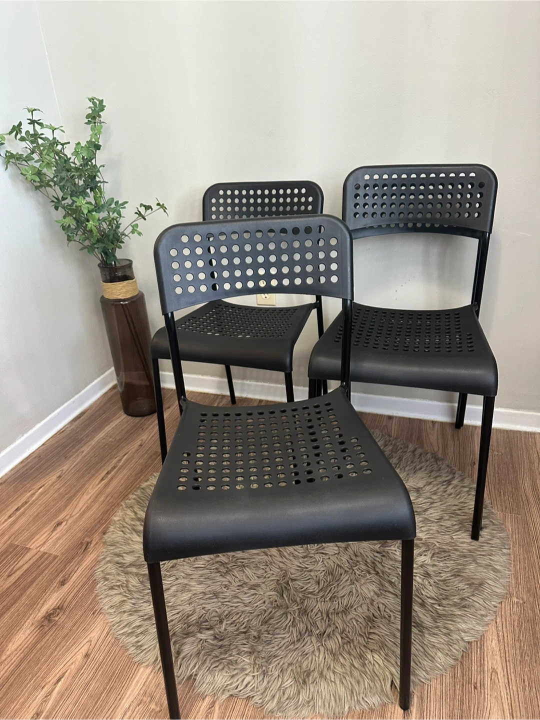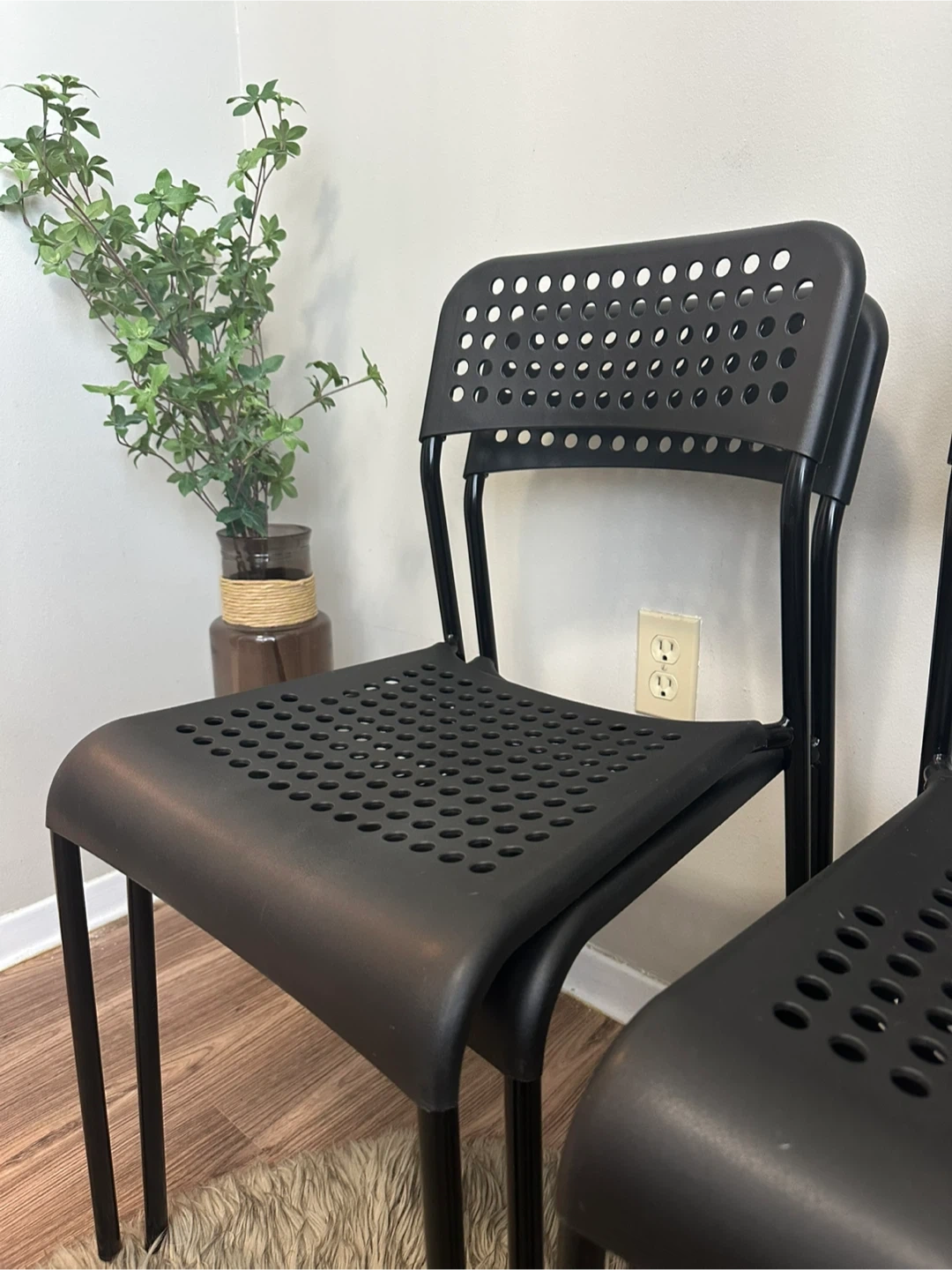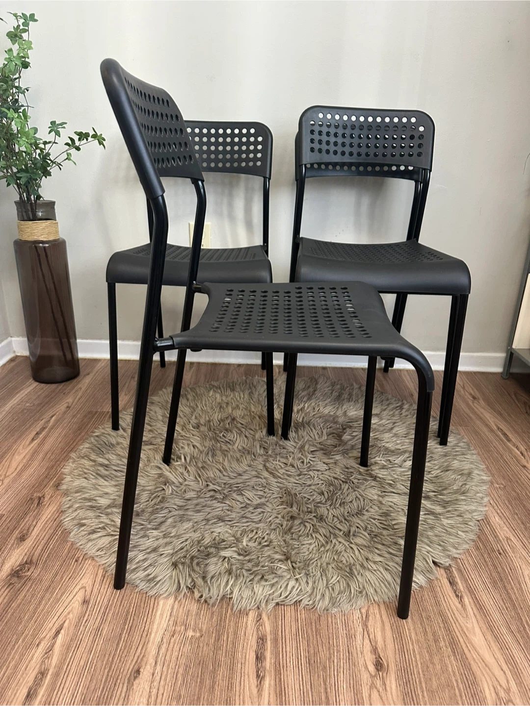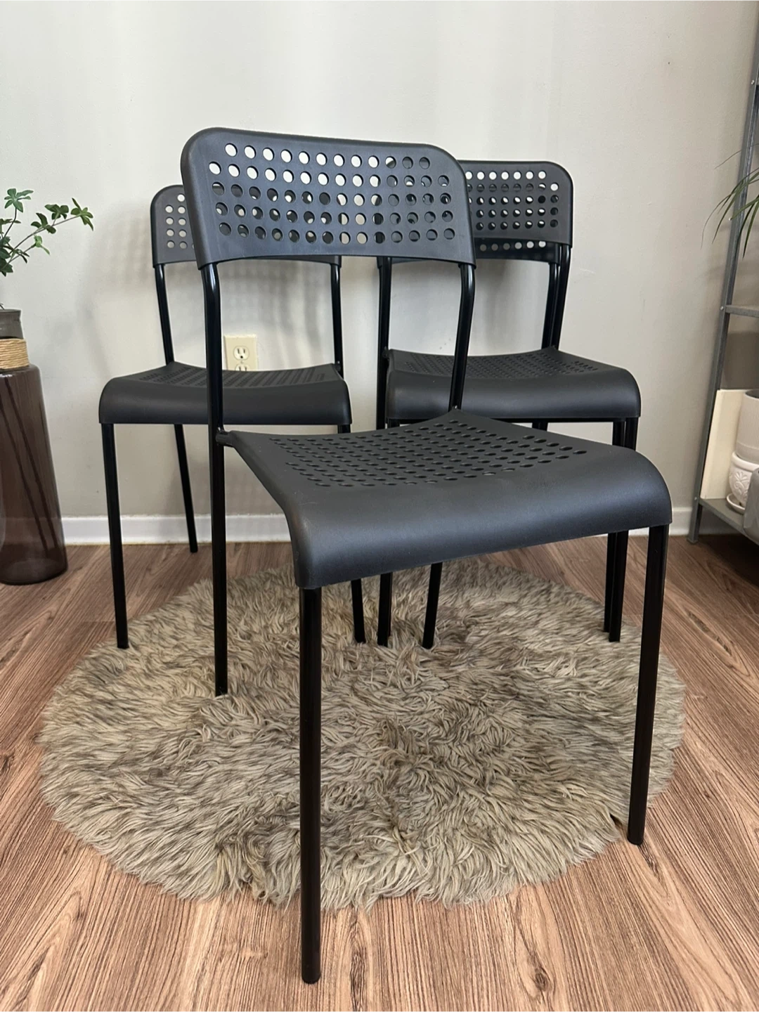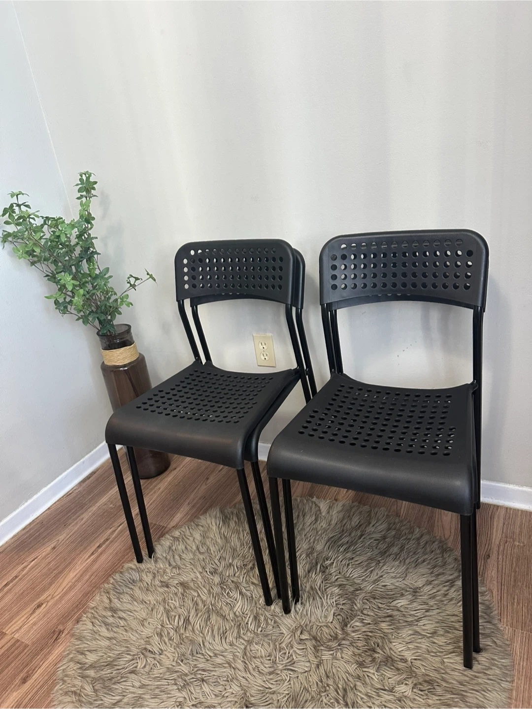 Selling a set of four black IKEA Vilmar chairs. They're in great shape and perfect for a kitchen or dining area. The chairs are lightweight and easy to move around. They have a sleek, minimalist design that fits well with any decor. Get a stylish and functional seating solution for your home. They can be stacked. Materials: Seat and back — Hard Plastic Legs — Metal Brand: IKEA Model: VILMAR Original Price: $15 + tax / EACH