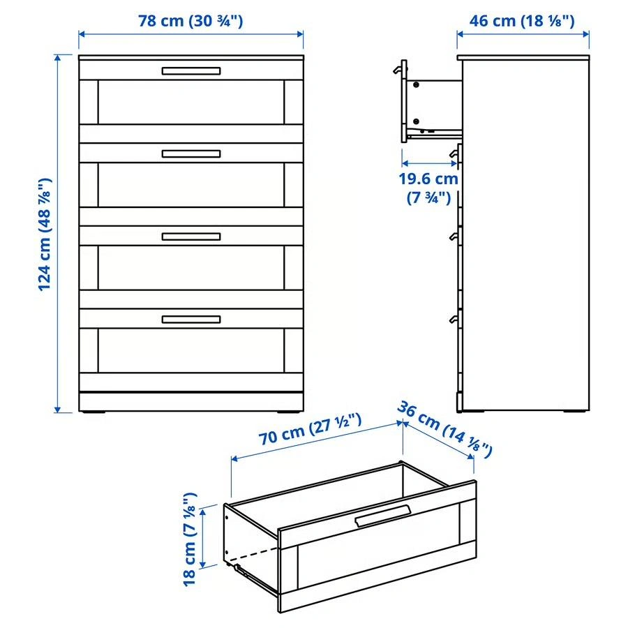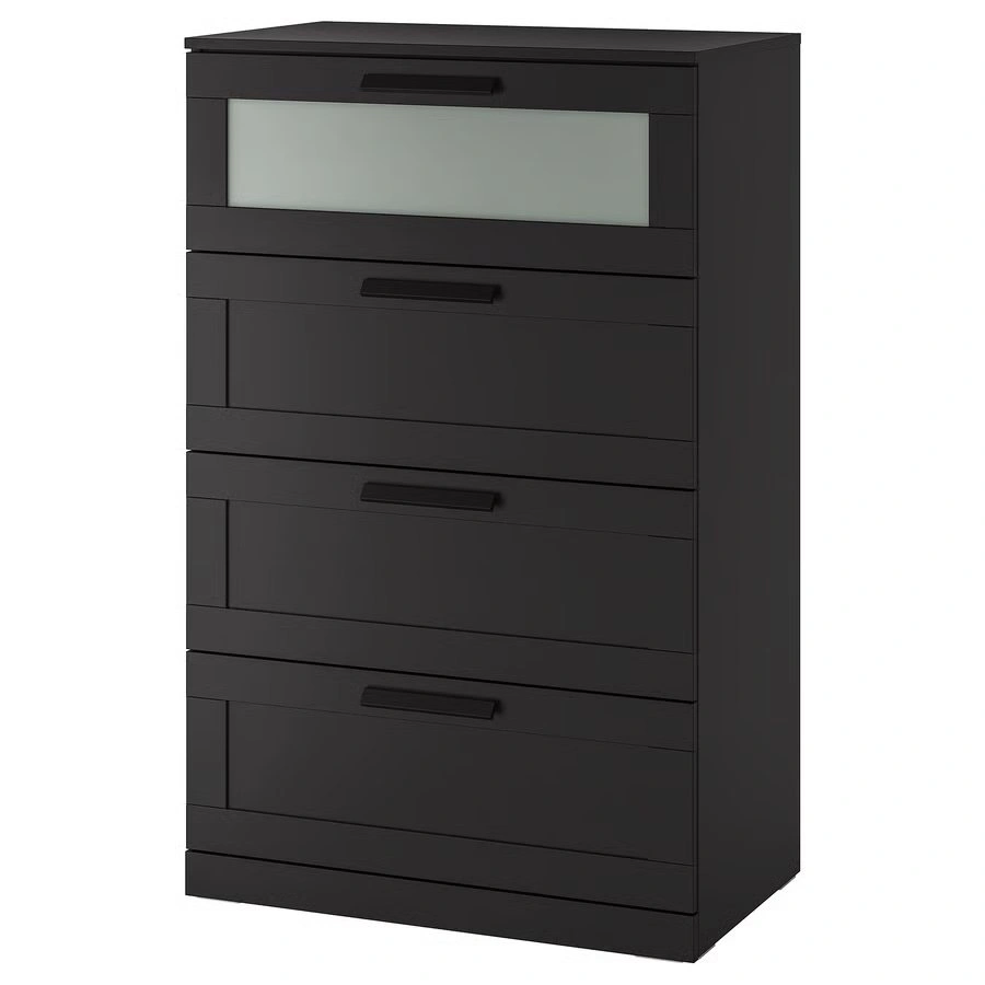 Organize your bedroom in style with this sleek and modern IKEA BRIMNES 4-drawer chest. The clean lines and black finish make it a versatile piece that fits perfectly with any contemporary decor. It's a fantastic storage solution that looks great in a bedroom, hallway, or walk-in closet. Dimensions: Width: 78 cm (30 3/4 ") Depth: 46 cm (18 1/8 ") Height: 124 cm (48 7/8 ") Key Features: - Spacious Storage: Four deep, smooth-running drawers provide ample space for clothes, linens, and other essentials. - Elegant Frosted Glass: The top drawer features a beautiful frosted glass front, adding a touch of sophisticated design and allowing you to see what's inside. - Sturdy & Reliable: A classic and durable piece from one of IKEA's most popular furniture series. - Pre-Assembled: Save yourself hours of frustration! This chest is already built and ready to use. This dresser is in great condition. Selling because of a move. Grab a great deal and avoid a trip to IKEA! For more product details, see the official IKEA page: https://www.ikea.com/ca/en/p/brimnes-4-drawer-chest-black-70574245/
